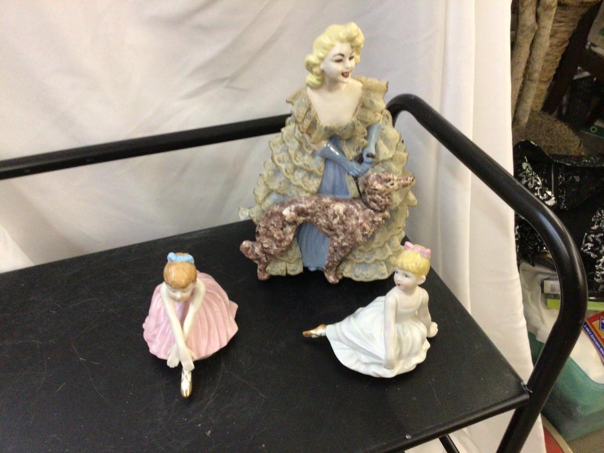 You get two made in Japan Ballerina music boxes and a large plaster Lady with her dog figurine.