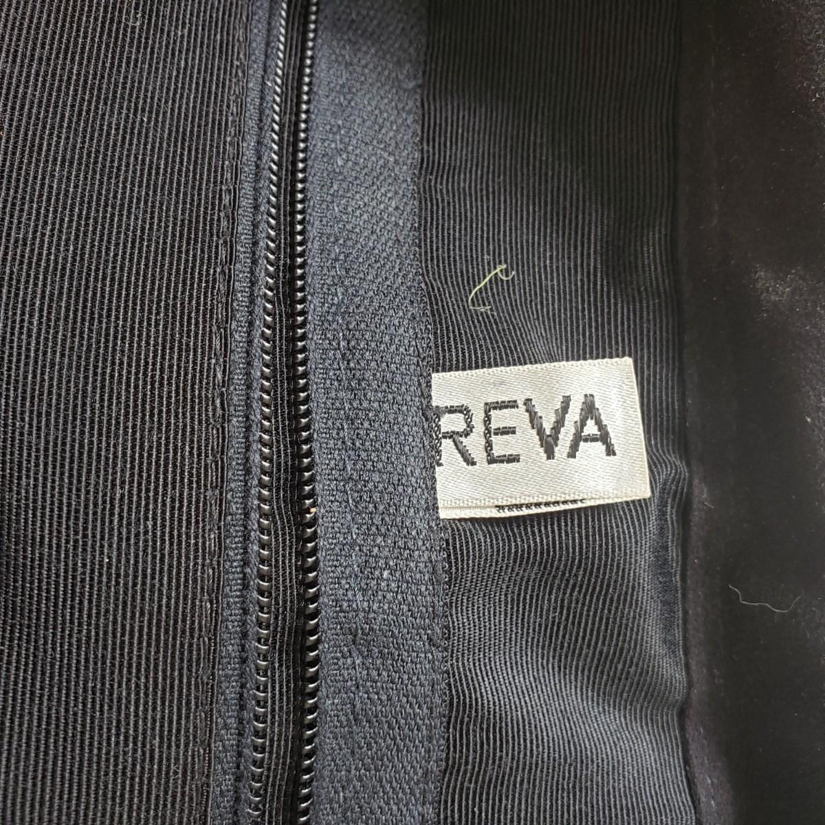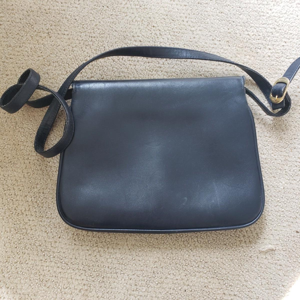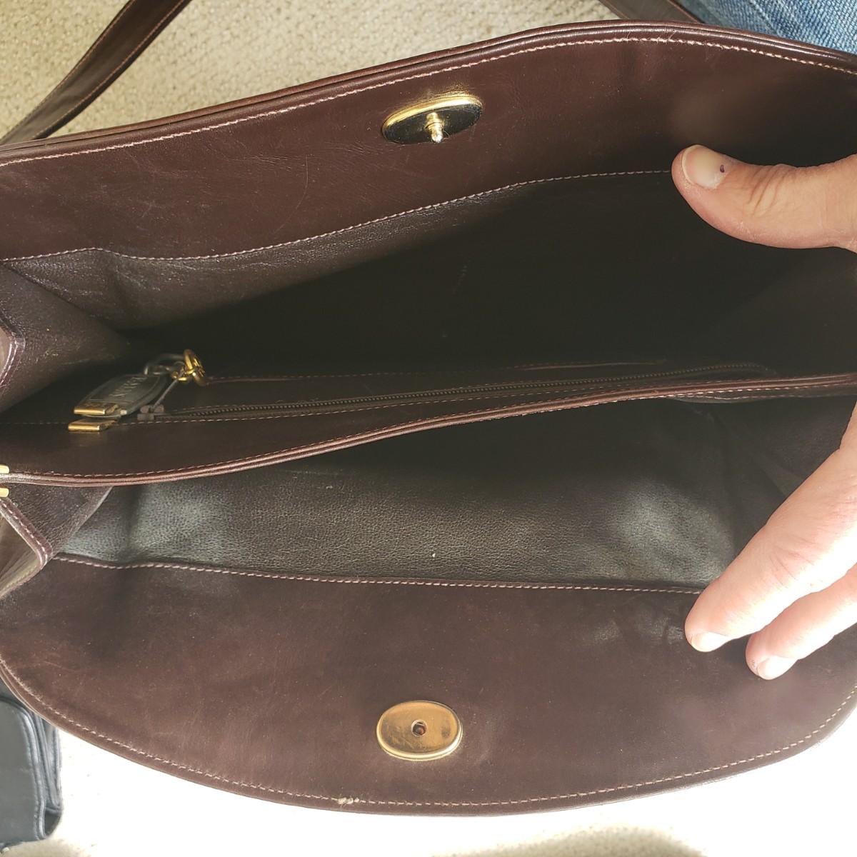 This lot features six purses. All are leather except the Reva and Fellini. The largest purse by Reva measures 13" x 12". The strap measures 12" to the top of the purse.