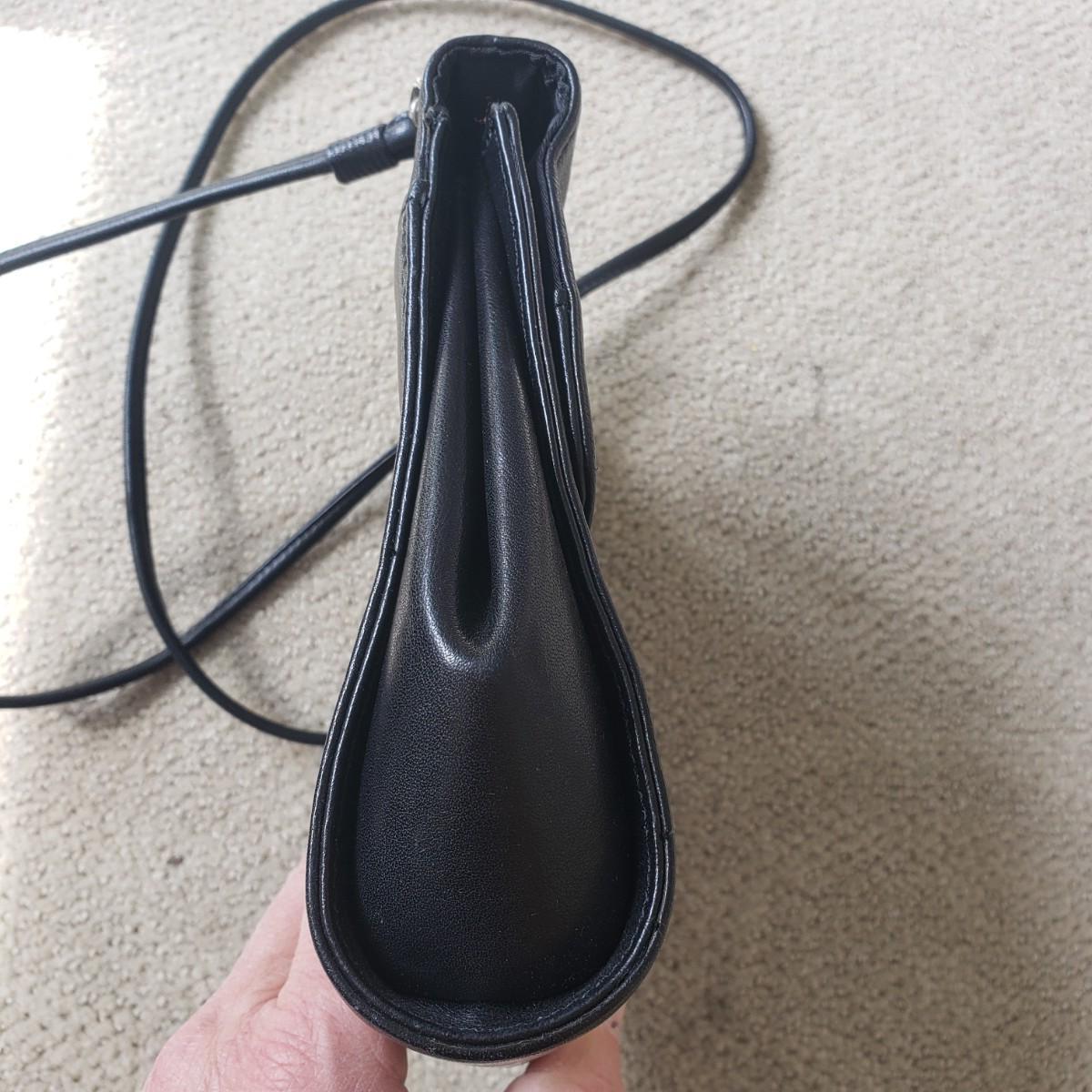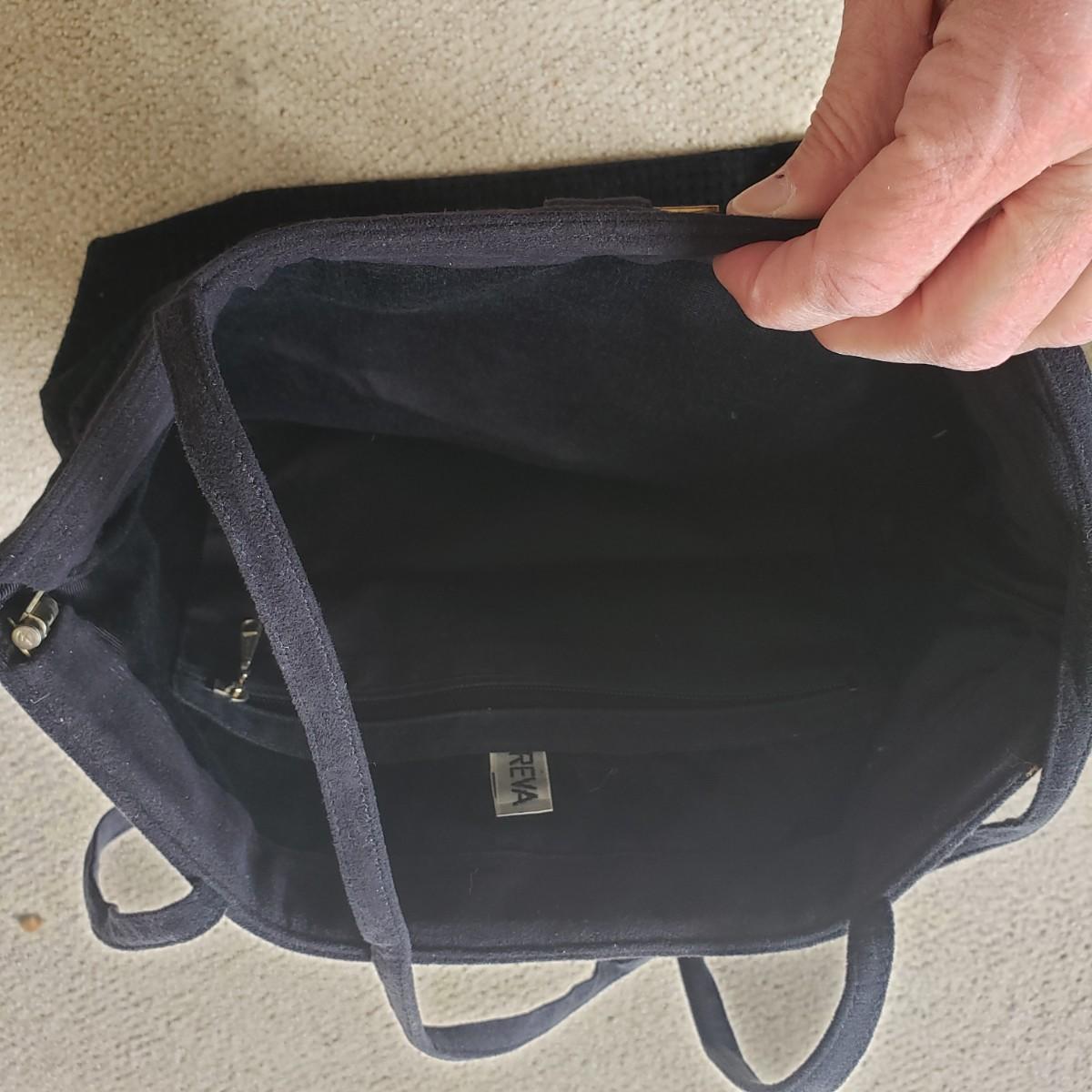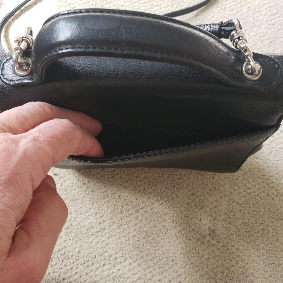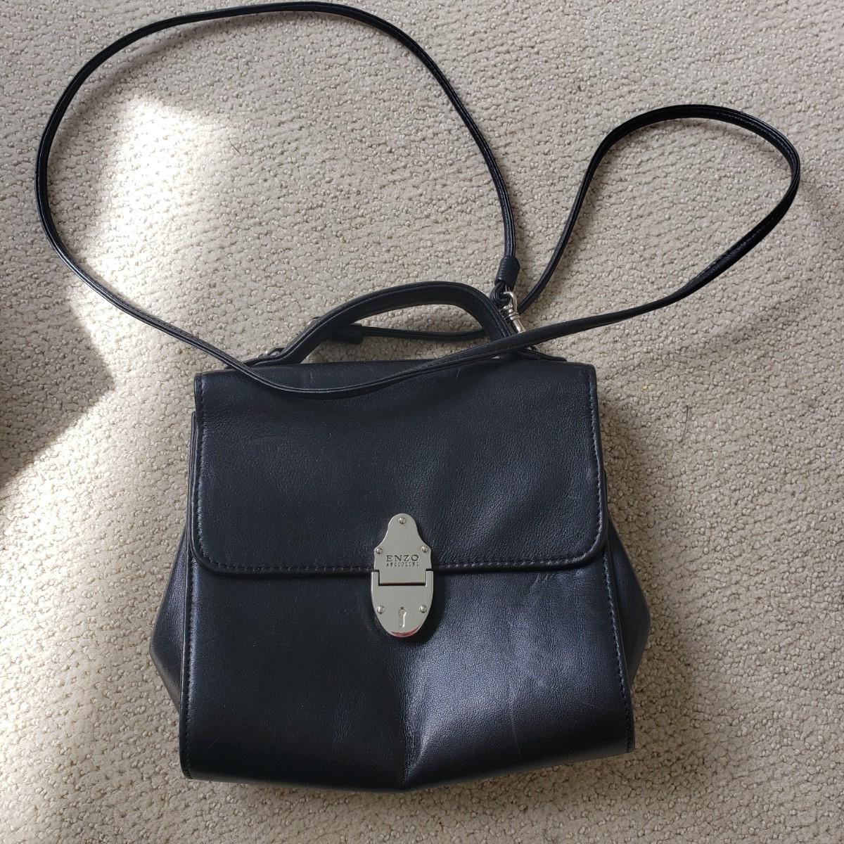This lot features six purses. All are leather except the Reva and Fellini. The largest purse by Reva measures 13" x 12". The strap measures 12" to the top of the purse.