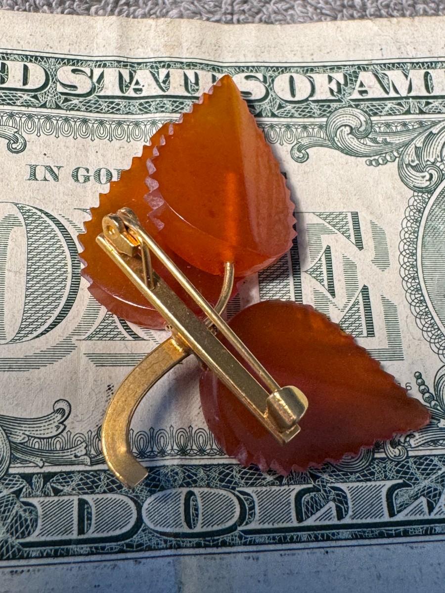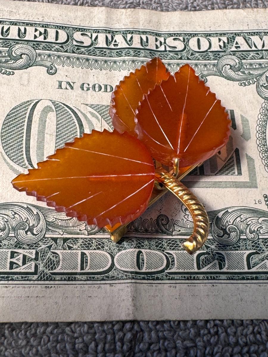 Vintage Baltic Amber Leaf Brooch, likely featuring a gold-toned setting and carved amber leaves. These brooches often contain authentic Baltic amber, known for its warm, natural hues, and are frequently found in vintage or antique jewelry markets.