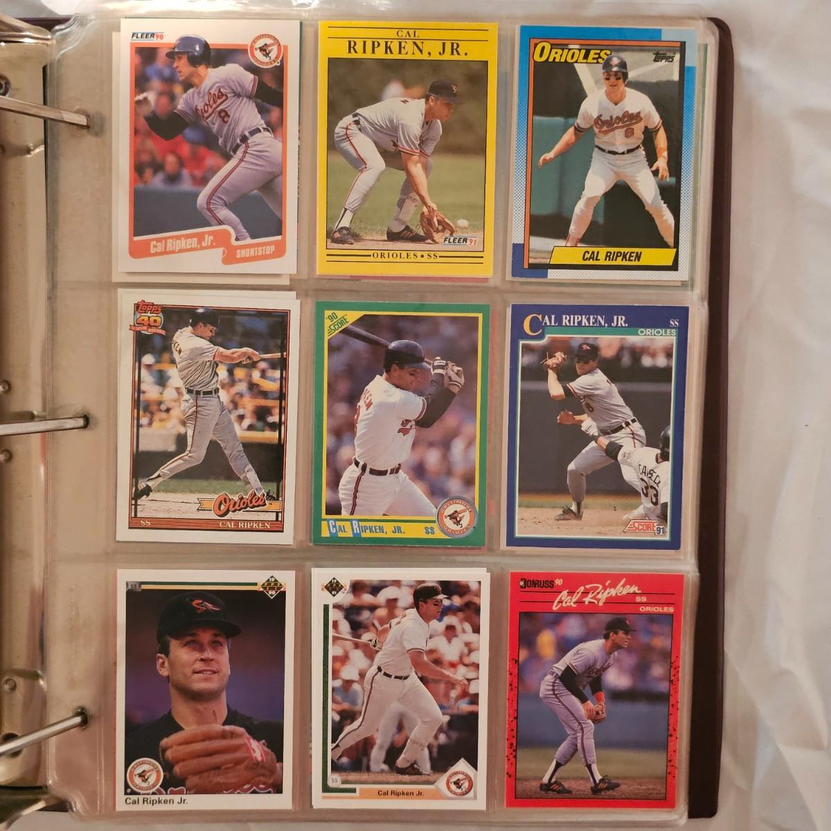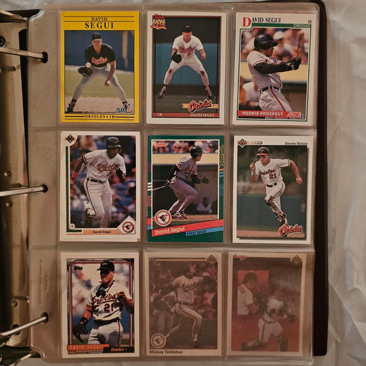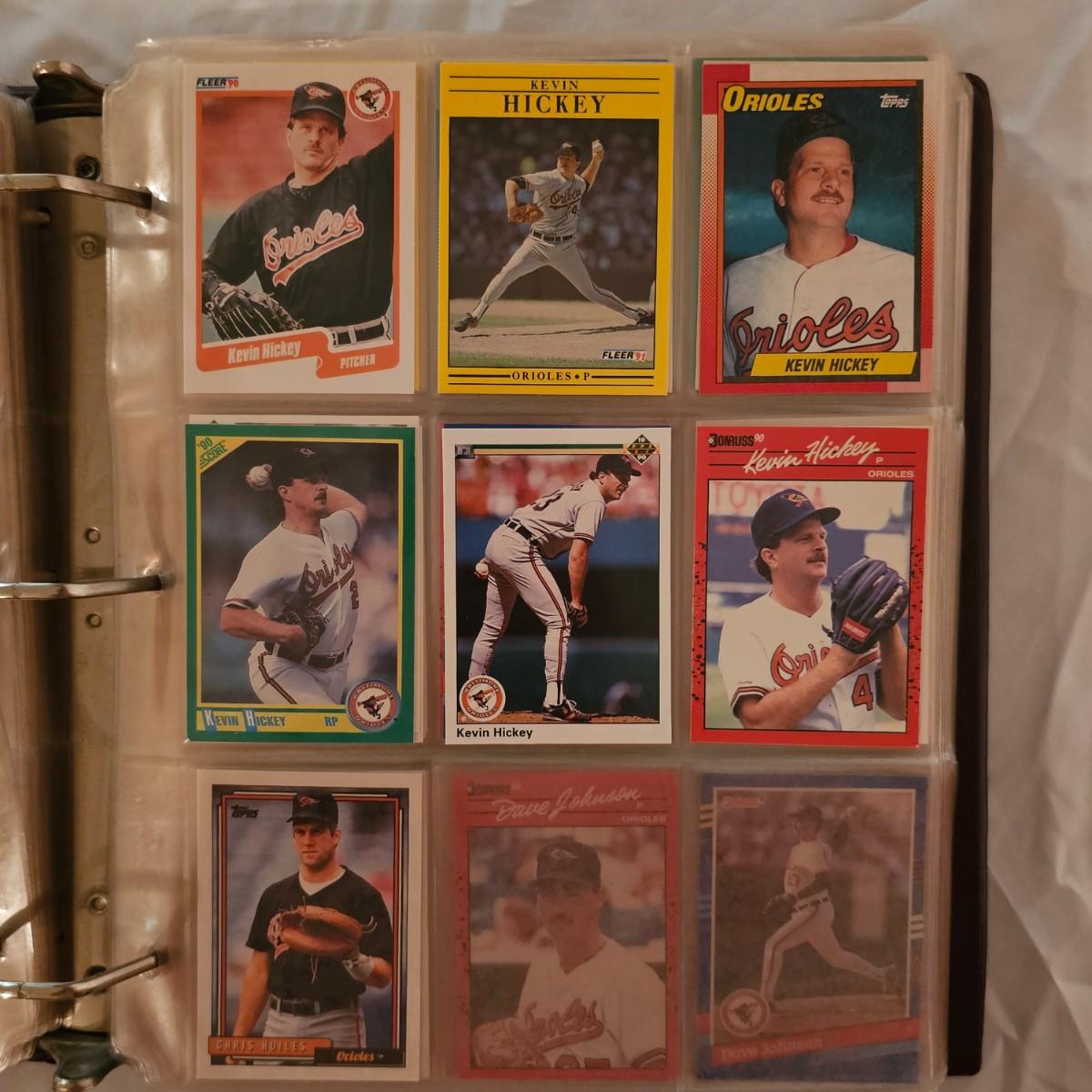 Baltimore Orioles baseball players from 1990 and 1991. Cards are by several producers, Topps, Fleer, Upper Deck and more. No guarantee of complete sets. Hardcover binder has standard nine pocket sleeves for display. Cards are one per pocket, are not graded or appraised. See photos for details. Shipping available. All sales are final. No returns or refunds. Please bid accordingly.