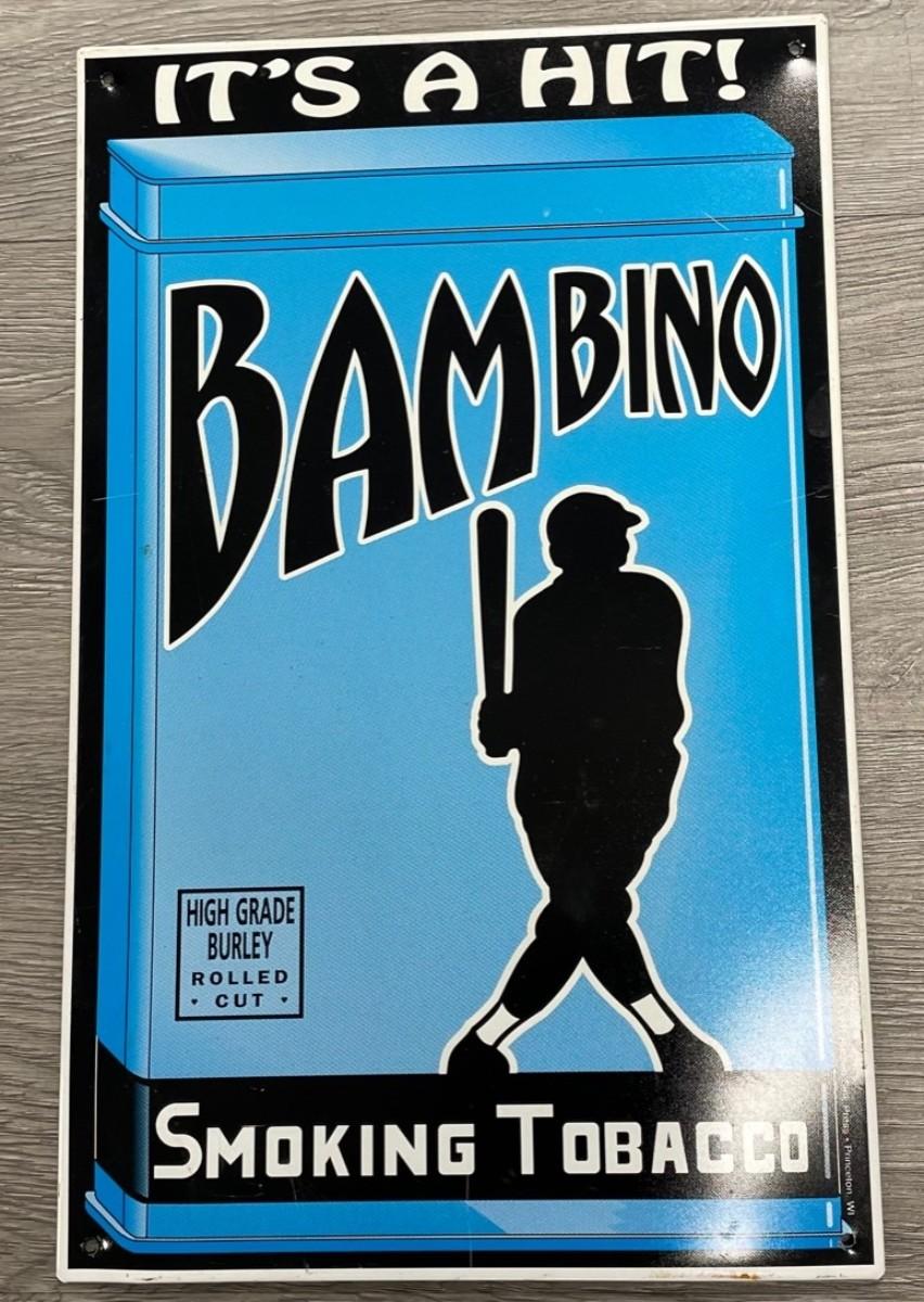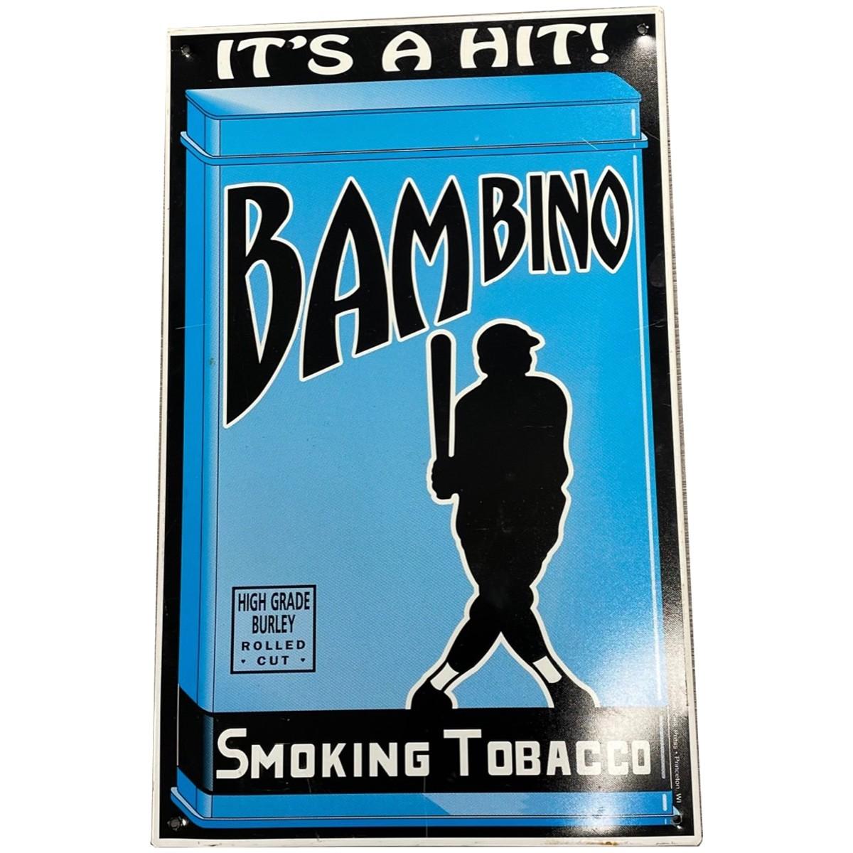 Description: Bambino Smoking Tobacco Advertising Sign. Measures approximately: 13.5 X 8.5 Inches. Material : Metal.