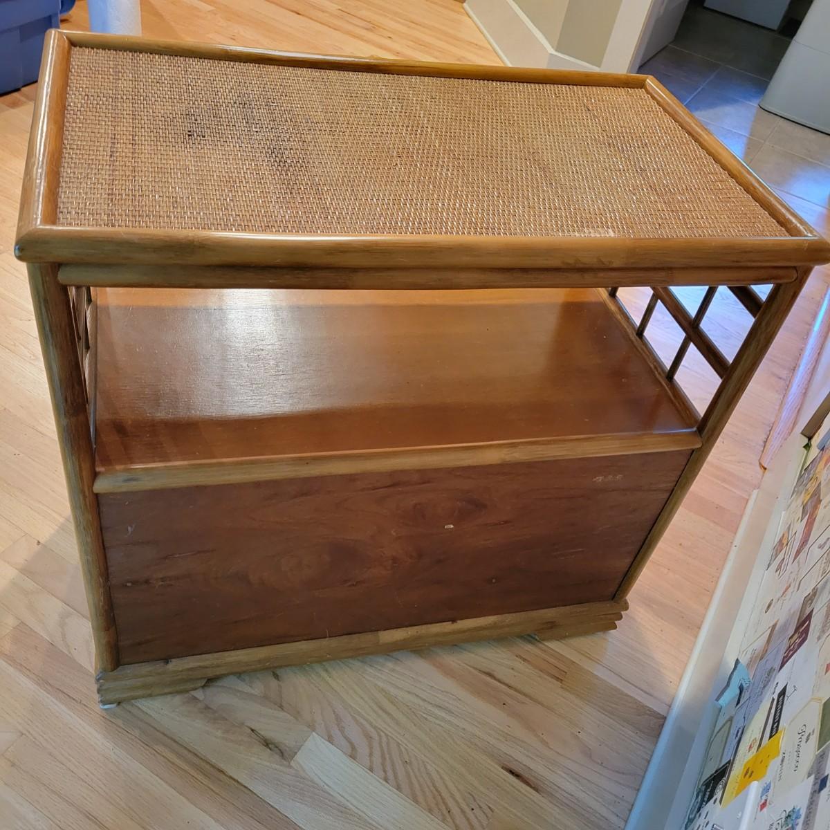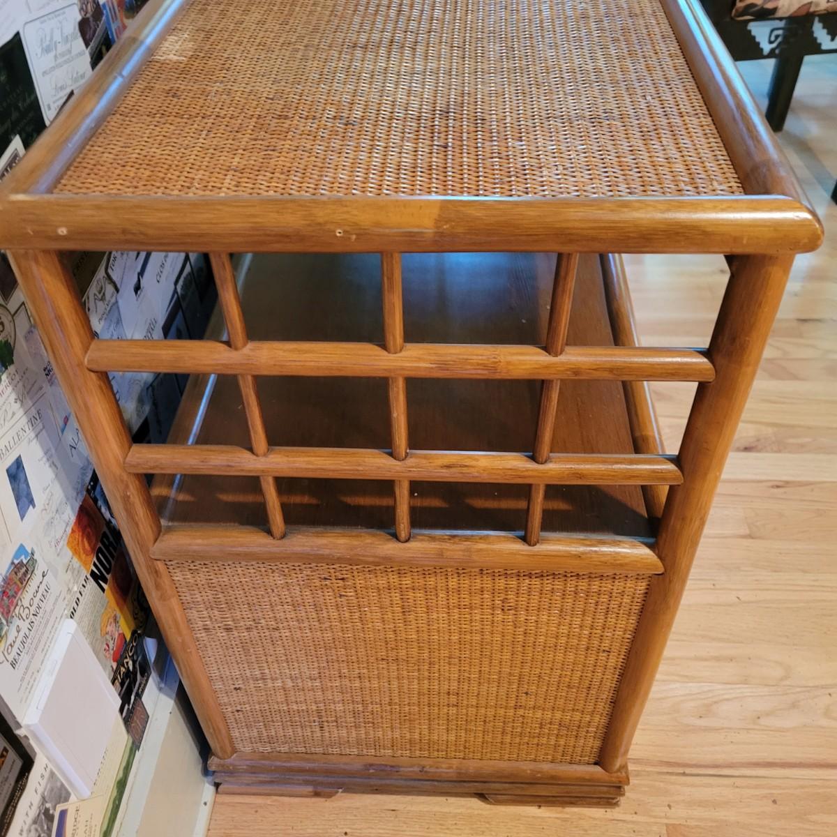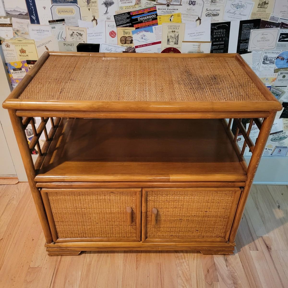 An accent table and cabinet constructed of bamboo with a woven bamboo top and cabinet door exteriors. This item measures approximately 32.5" x 18.5" x 30"H. This table has some minor blemishes. Local pickup only