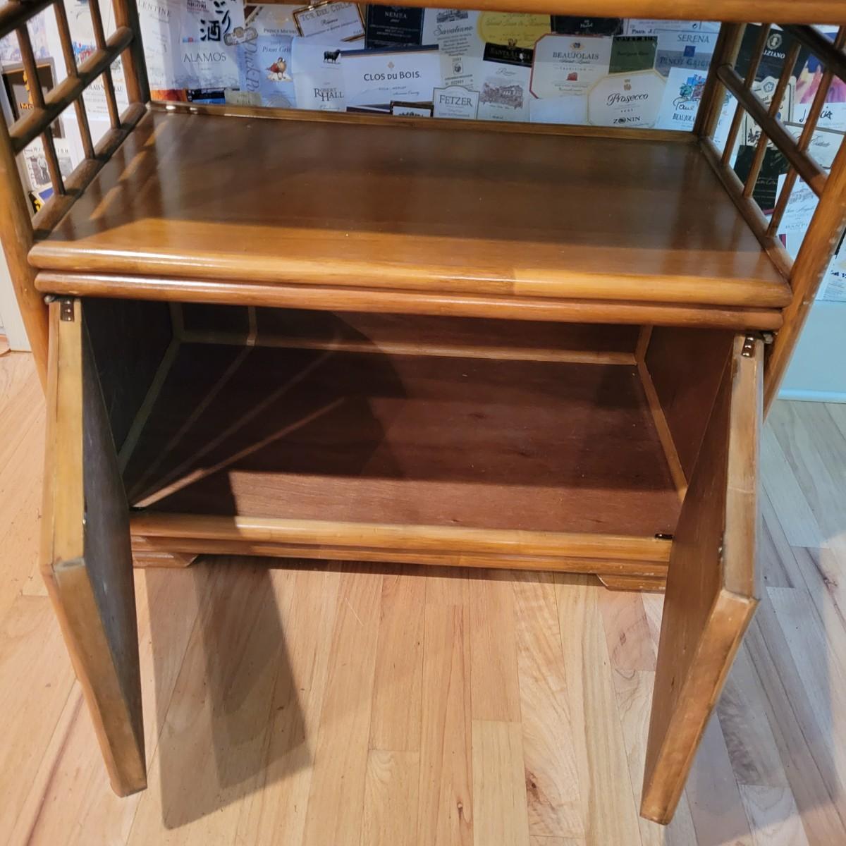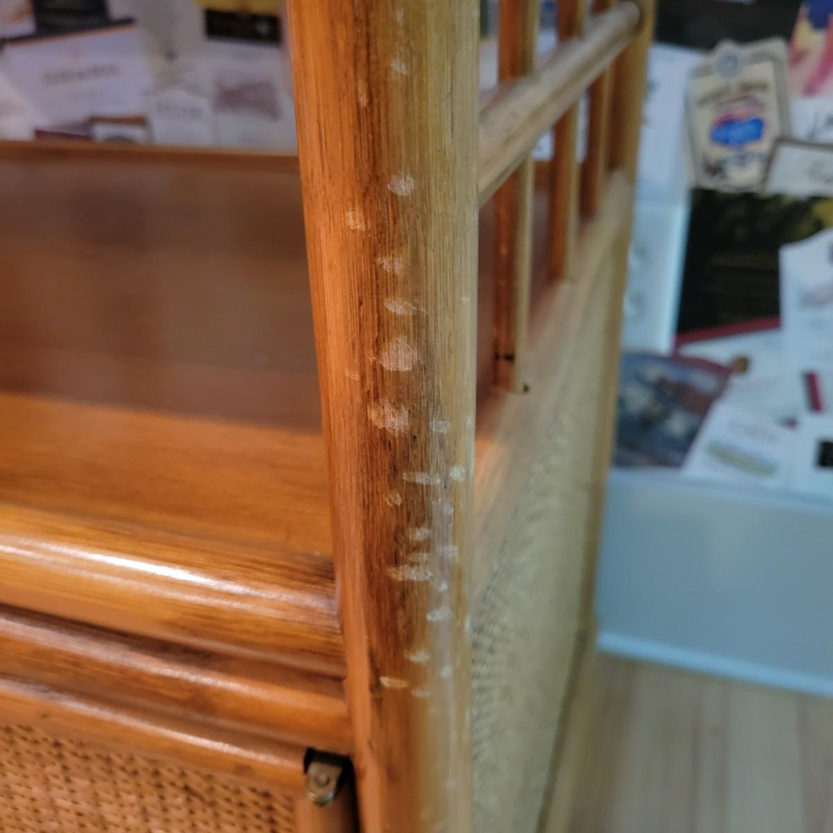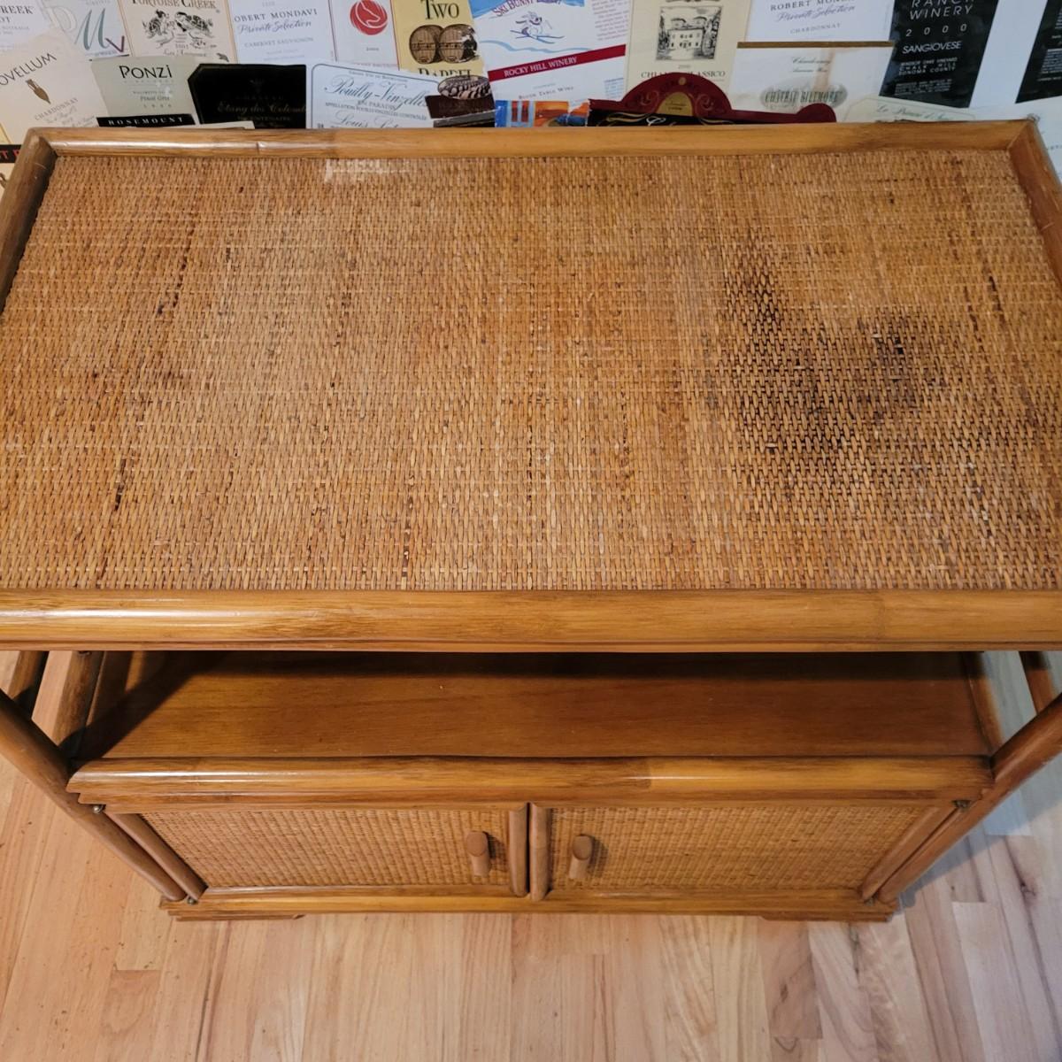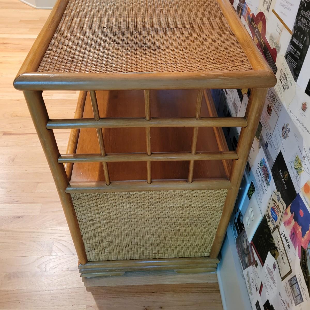 An accent table and cabinet constructed of bamboo with a woven bamboo top and cabinet door exteriors. This item measures approximately 32.5" x 18.5" x 30"H. This table has some minor blemishes. Local pickup only