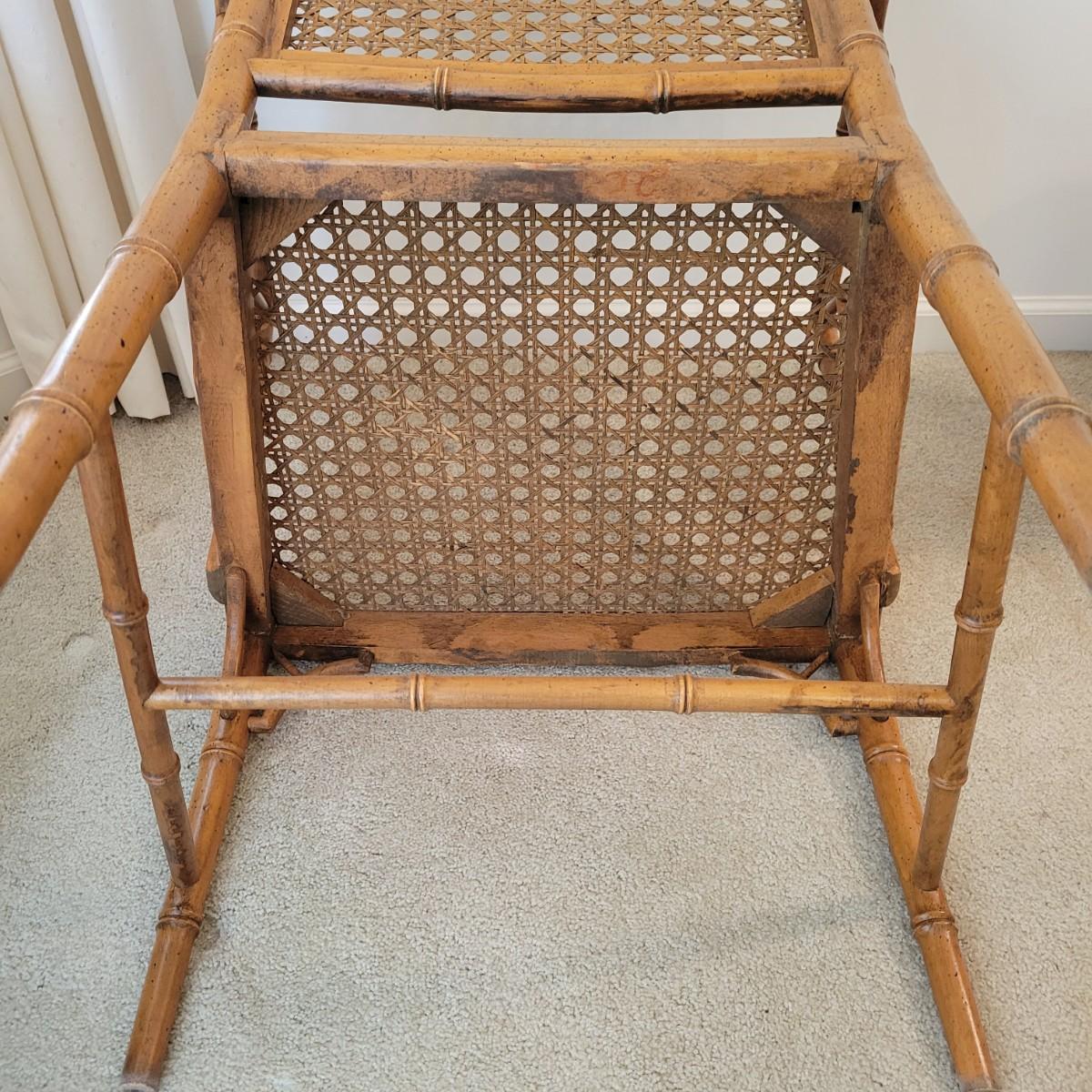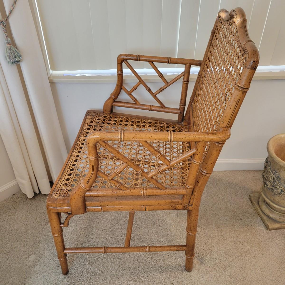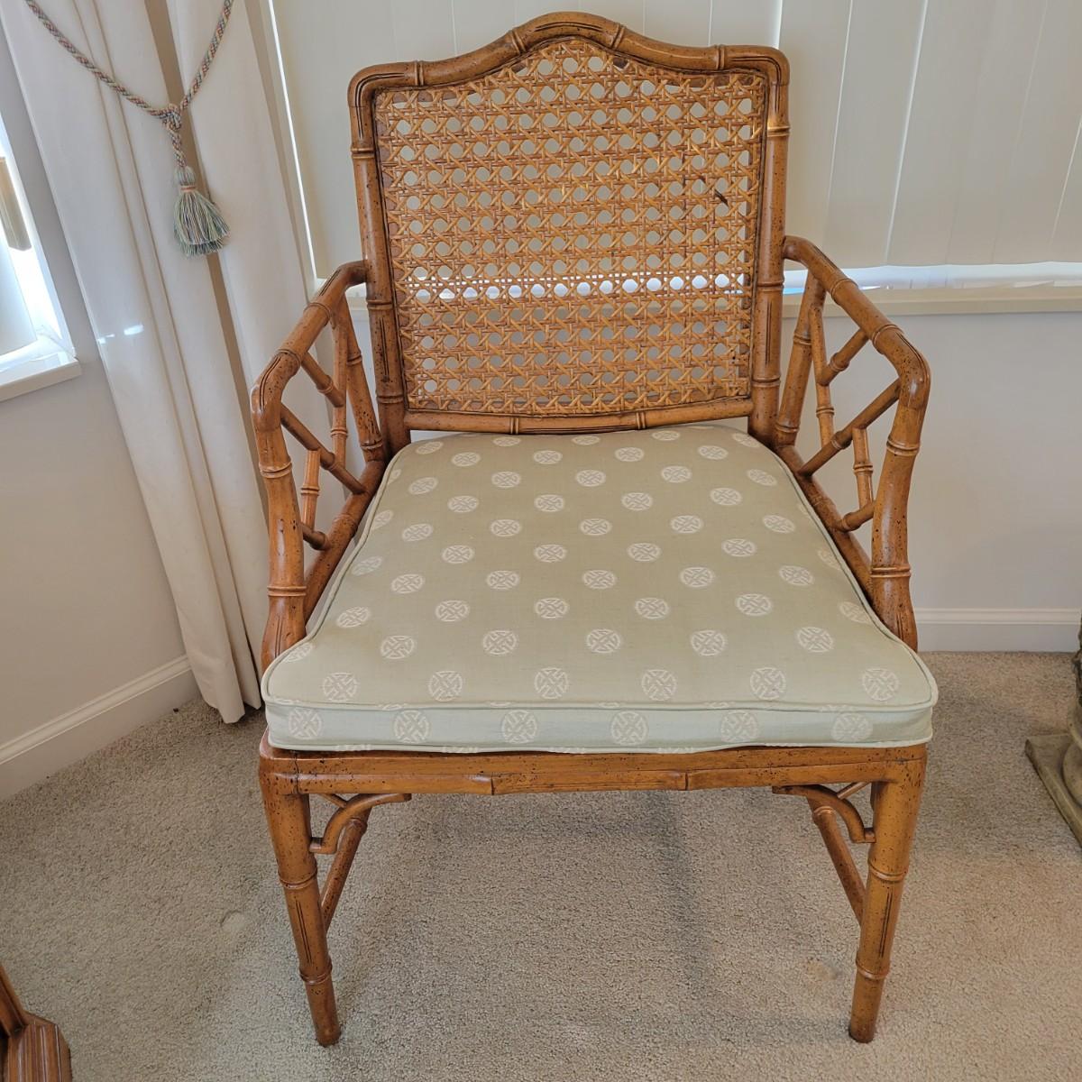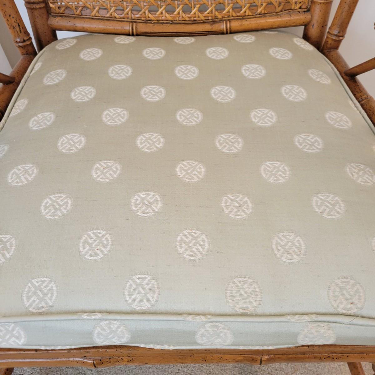 A bamboo like wood and woven rattan chair with a light green Asian themed cushion. This chair has no notable damage and has a light brown stain. The woven seat and back are intact. Measures approximately 23" x 21" x 35.5"H with a seat height of 18". Local pickup only.