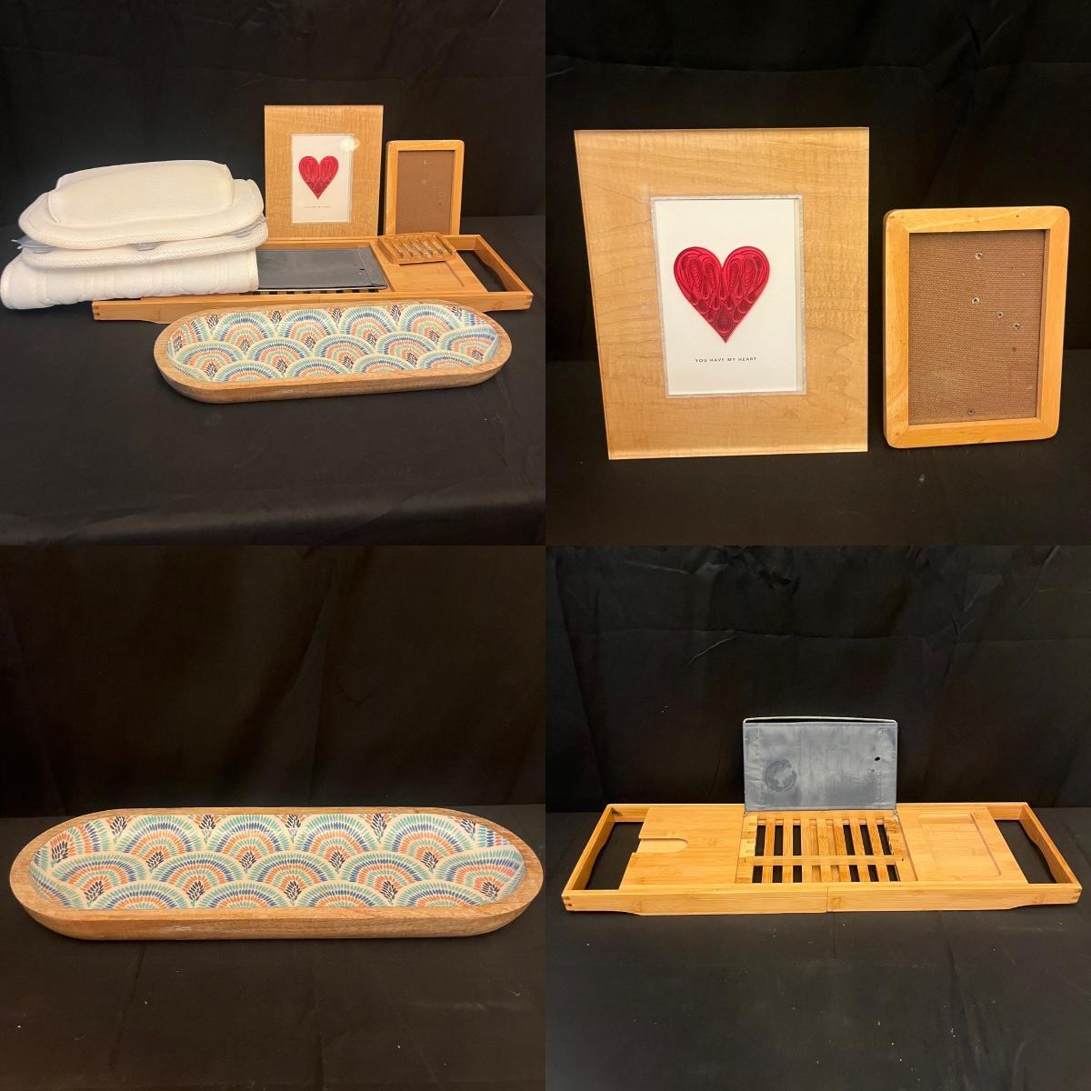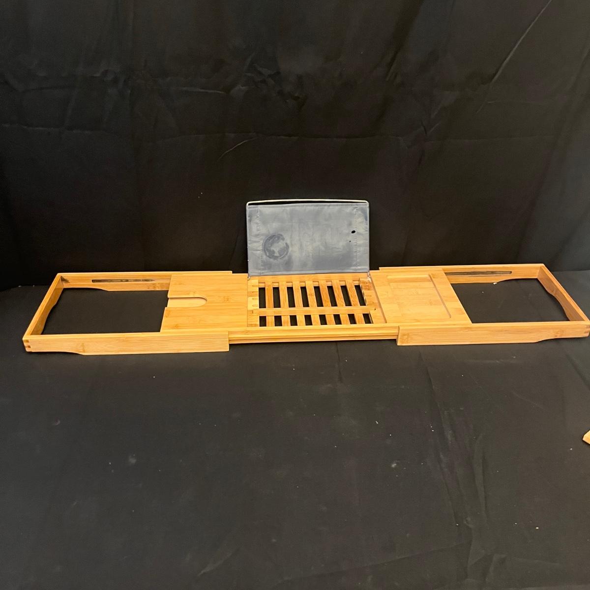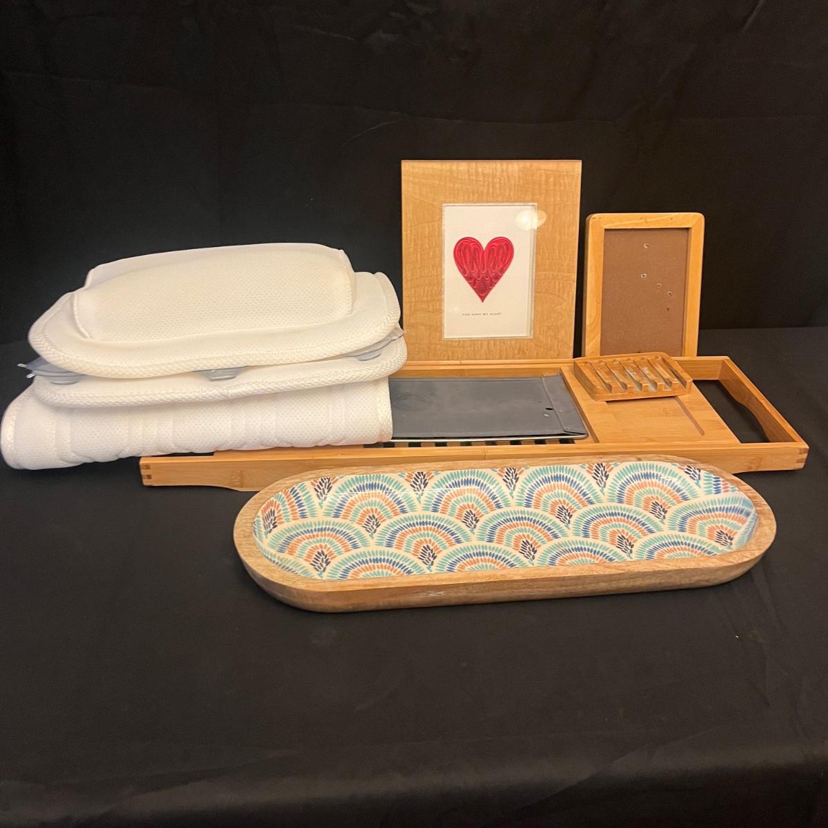 Lot includes a bamboo expandable bathtub caddy, wooden bowl with vinyl like material inside lining, full body bath pillow, wooden soda dish, wooden picture frame and a lucite picture frame. Caddy measures 42” x 9” x 7.5”H fully expanded.