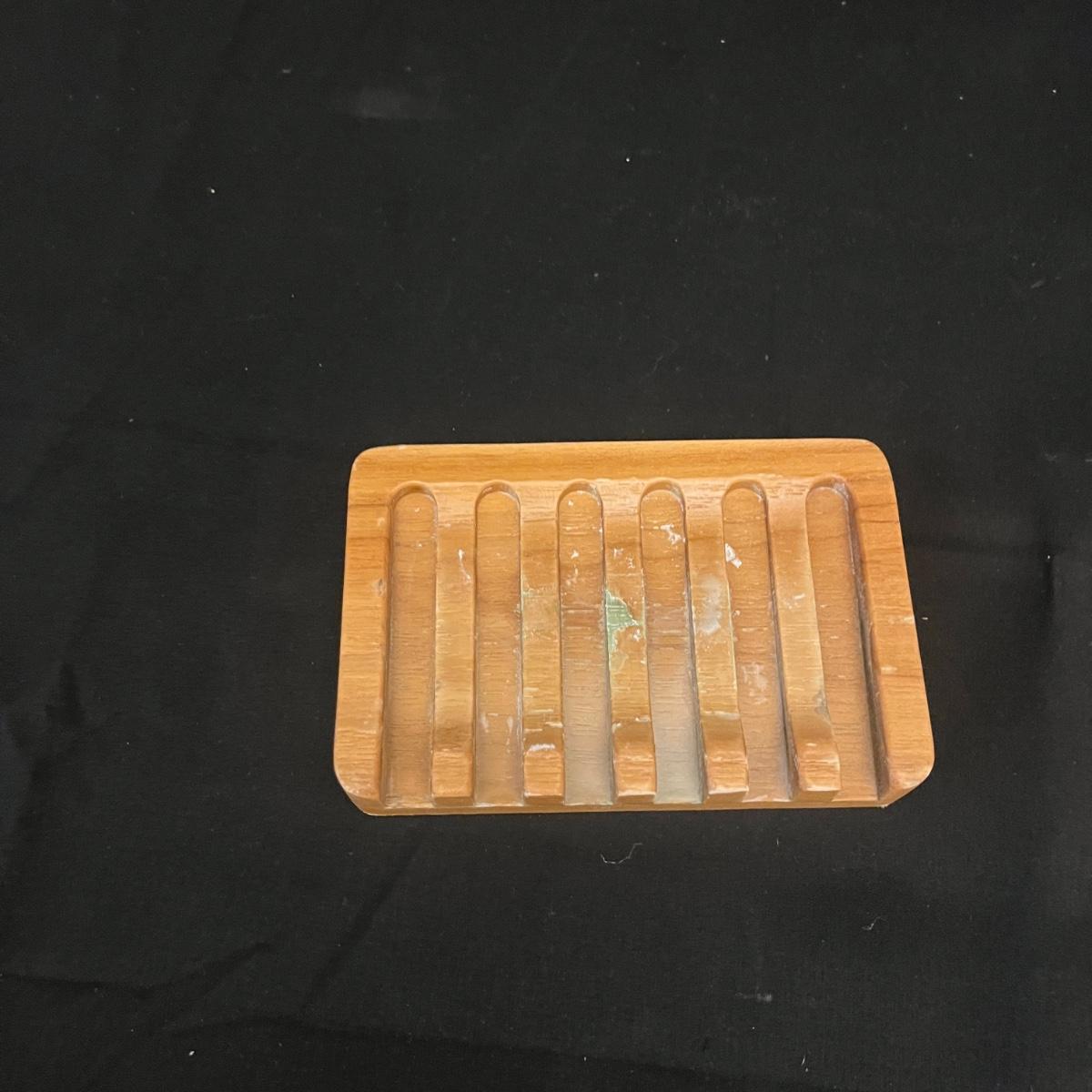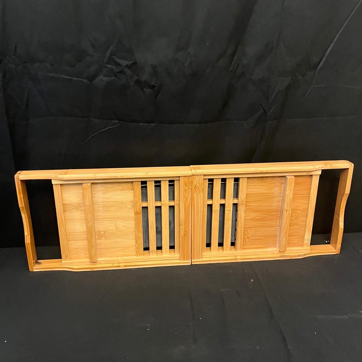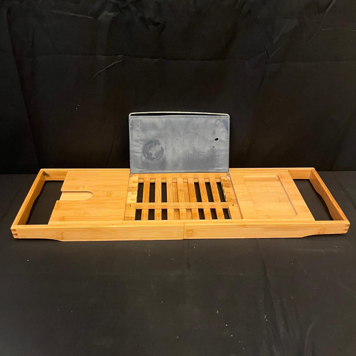Lot includes a bamboo expandable bathtub caddy, wooden bowl with vinyl like material inside lining, full body bath pillow, wooden soda dish, wooden picture frame and a lucite picture frame. Caddy measures 42” x 9” x 7.5”H fully expanded.