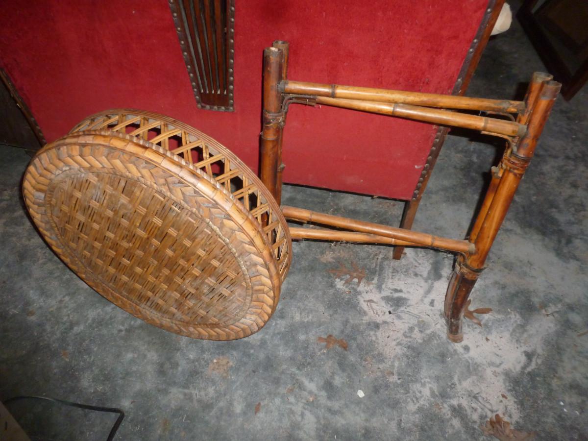 Bamboo Butler Table. Top comes off, legs can fold flat. Measures approx 24" in diameter, 30" tall.