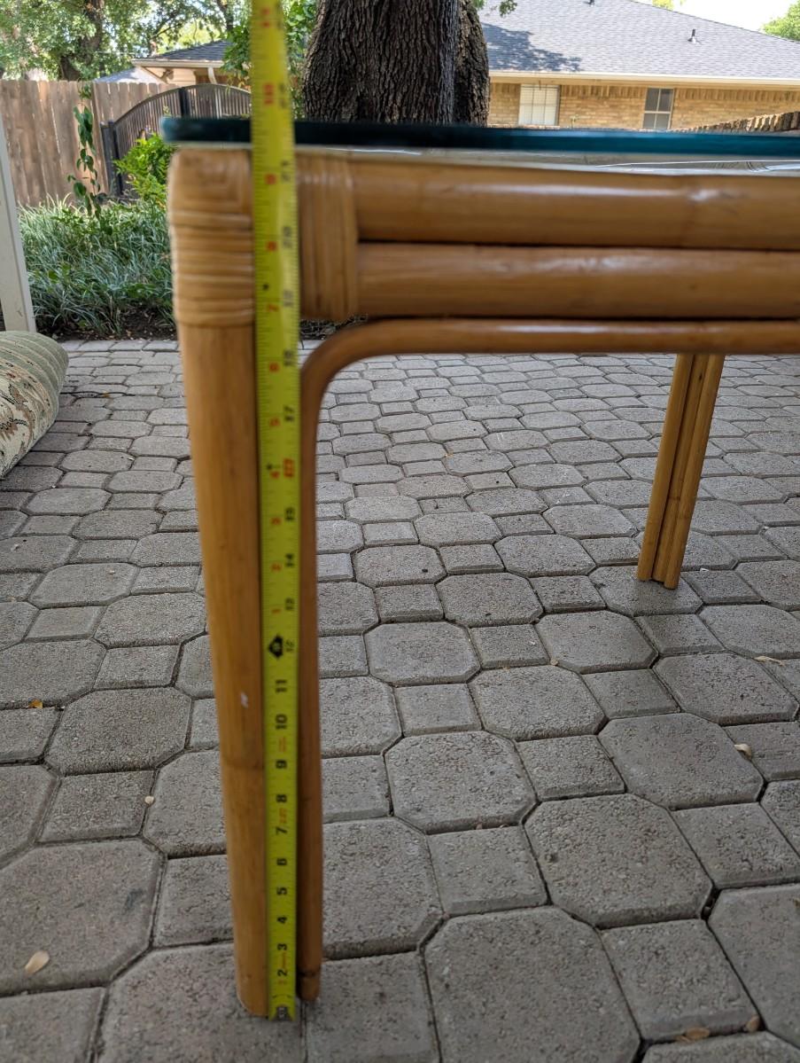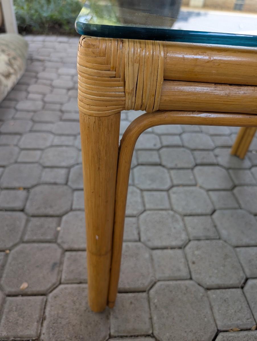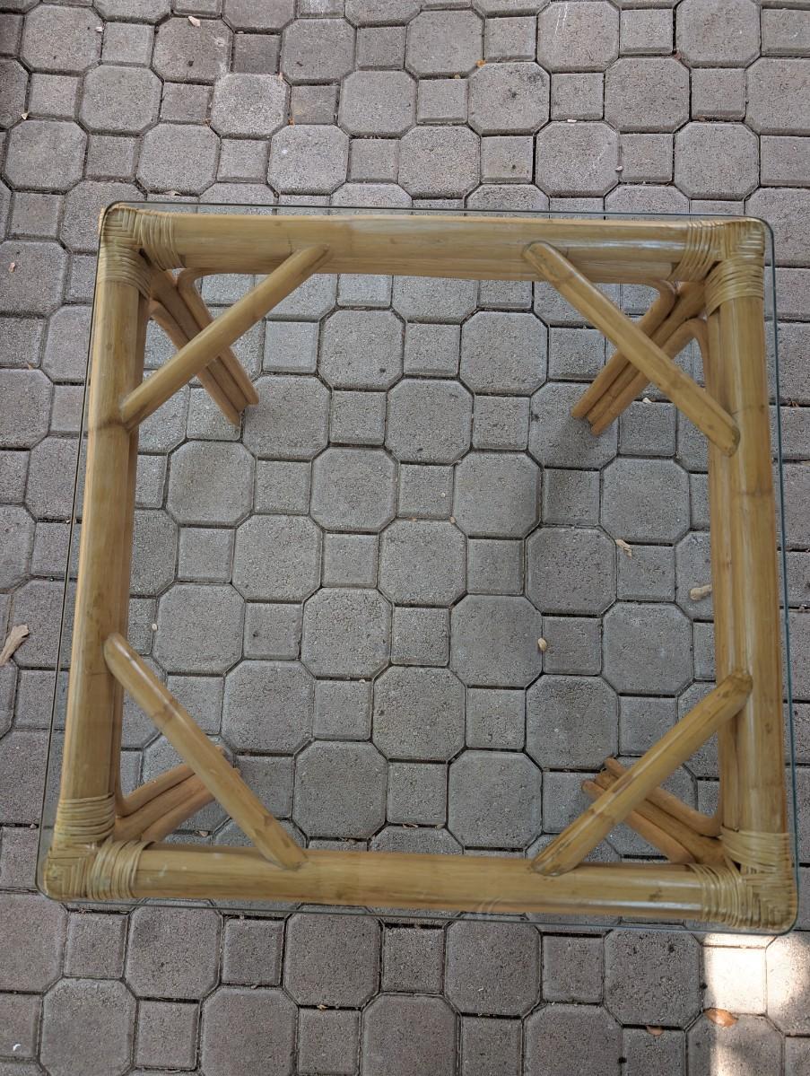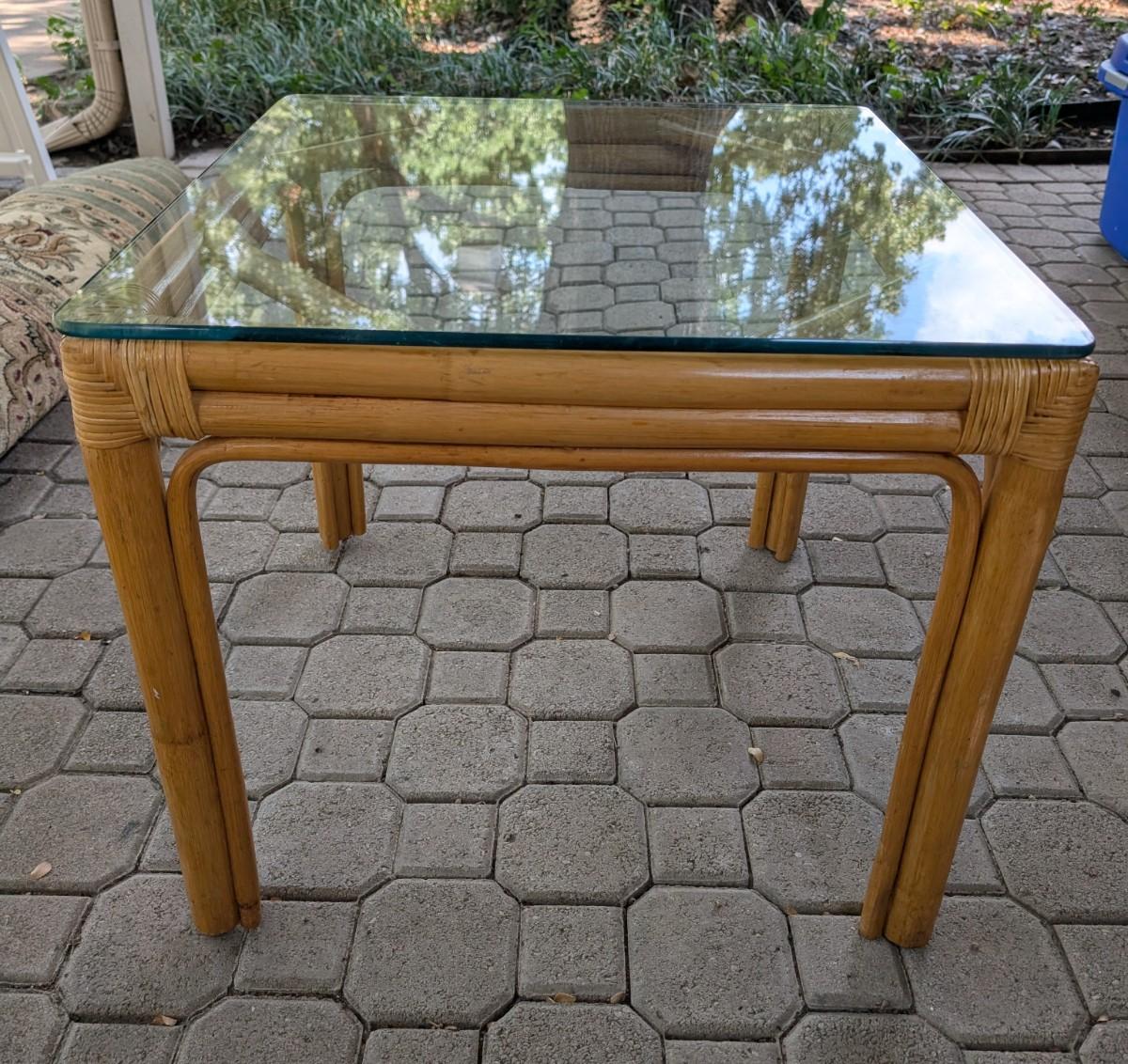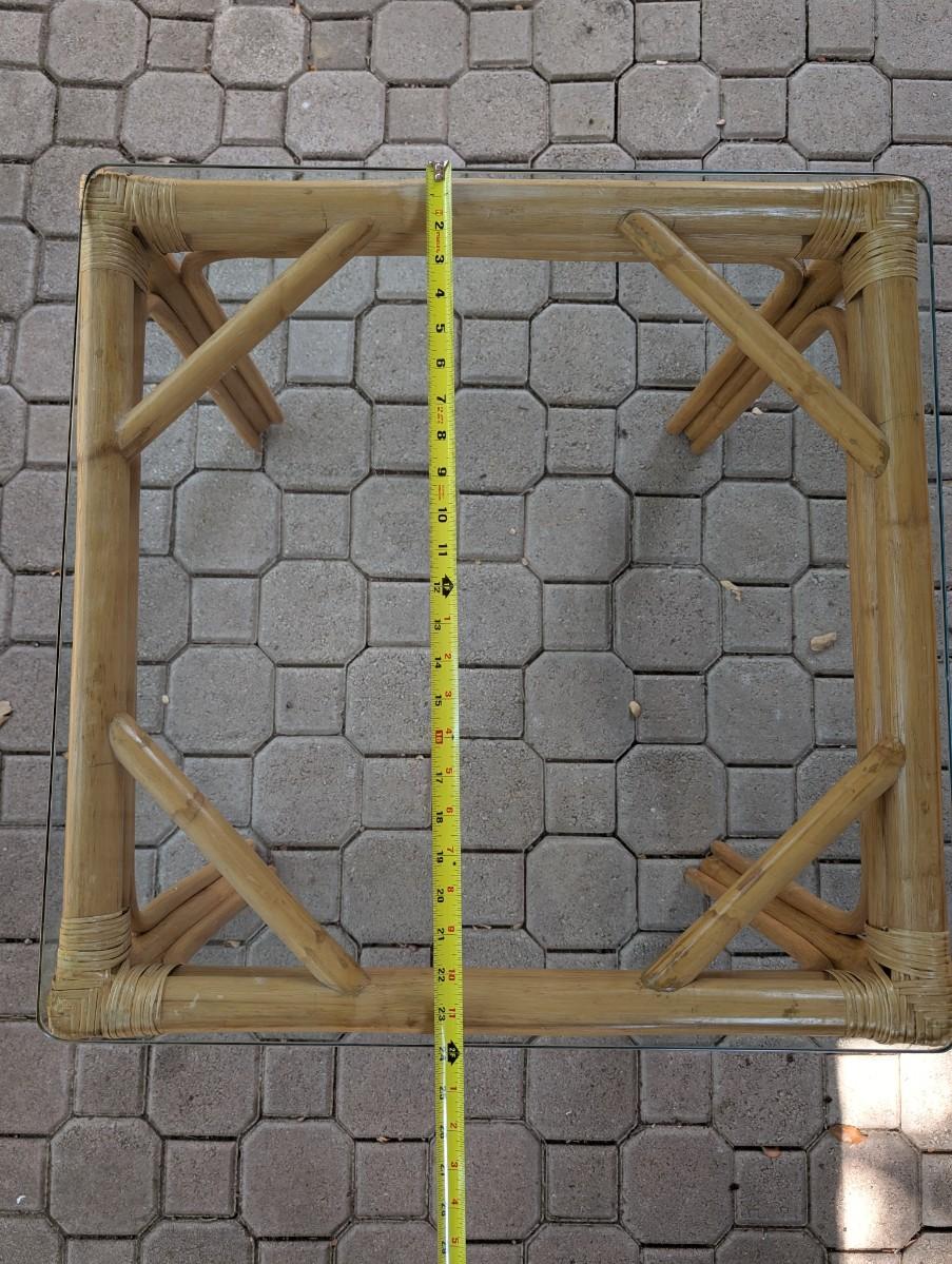Bamboo coffee or side table with glass top, measures 21"H x 24" x 24"
