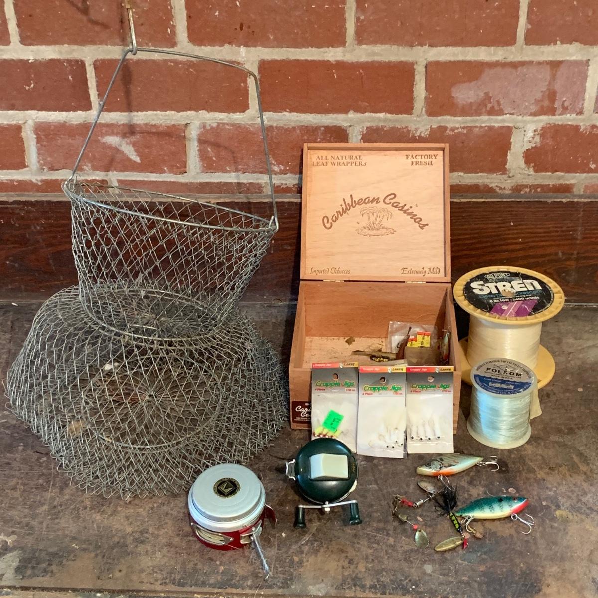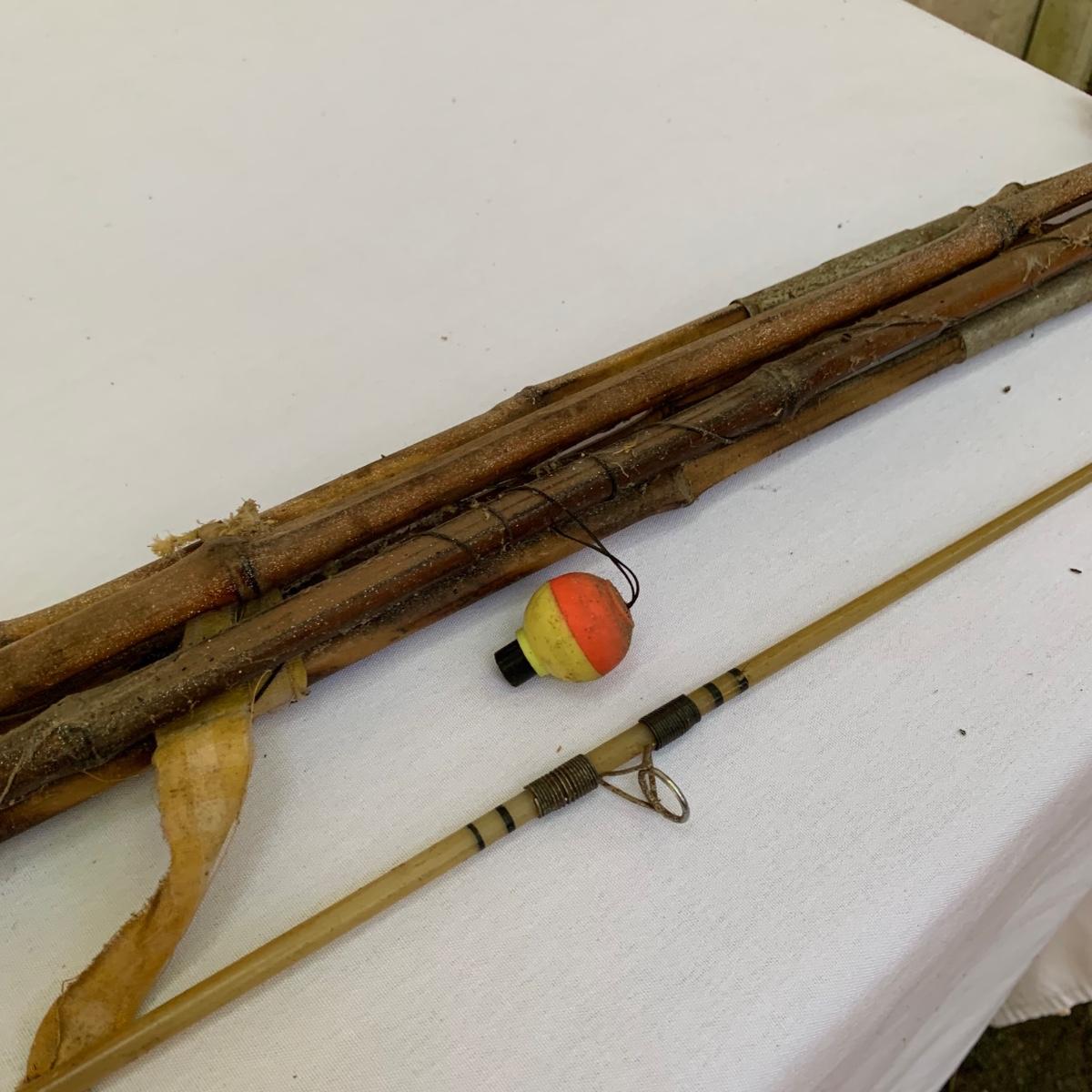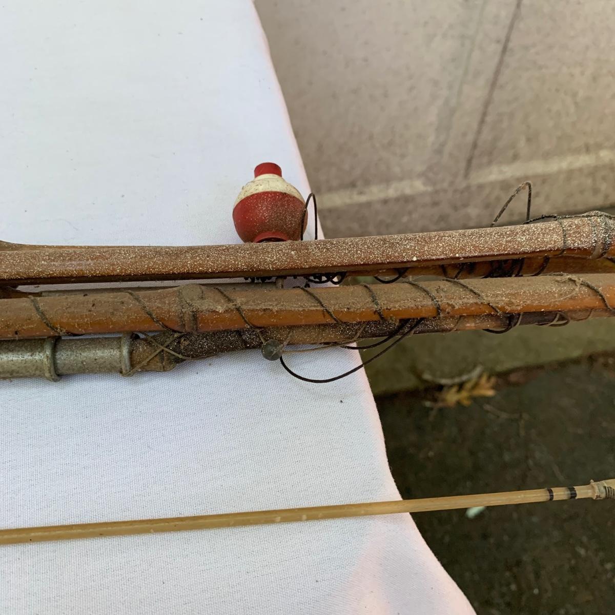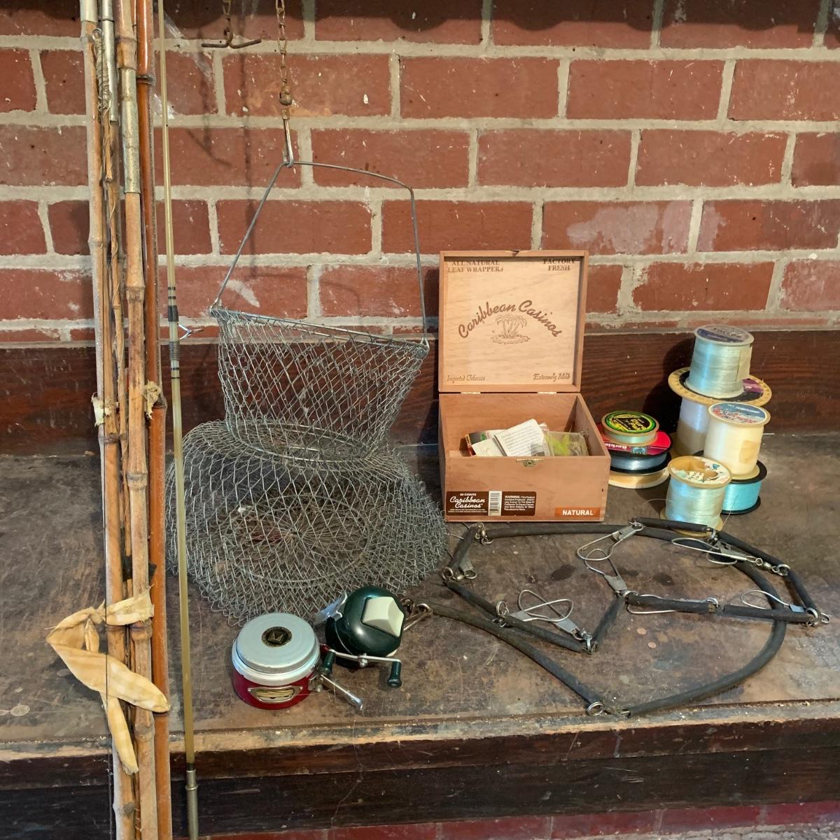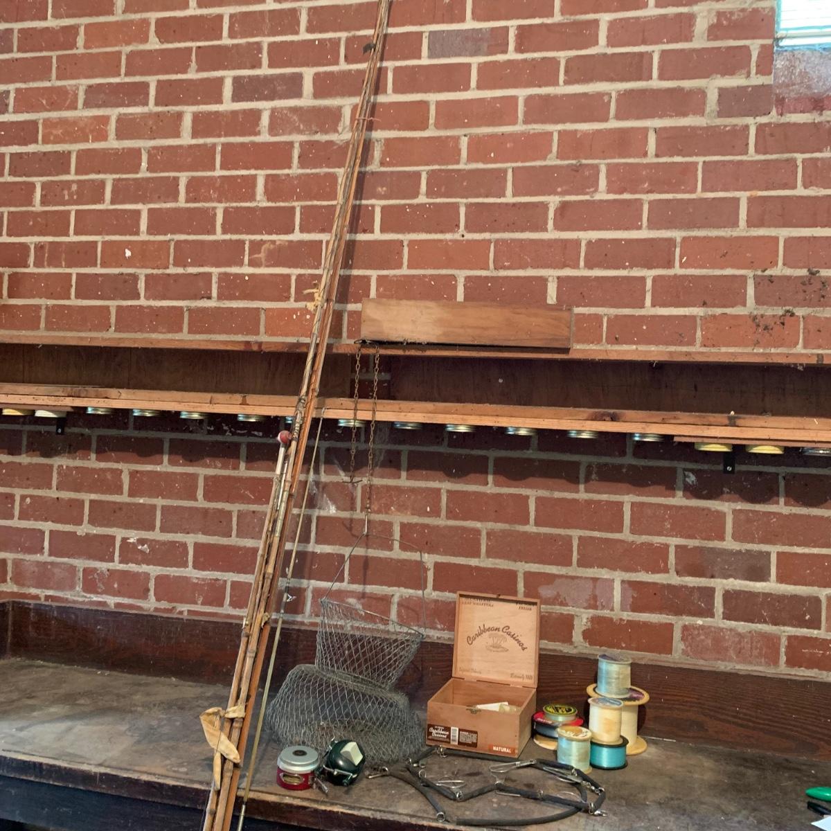 Six fishing poles, five of which are unique bamboo rods. The long fishing poles are about 9.5 ft. long. There are also two reels, many rolls of fishing line, a tackle box, and more. Local pickup only.