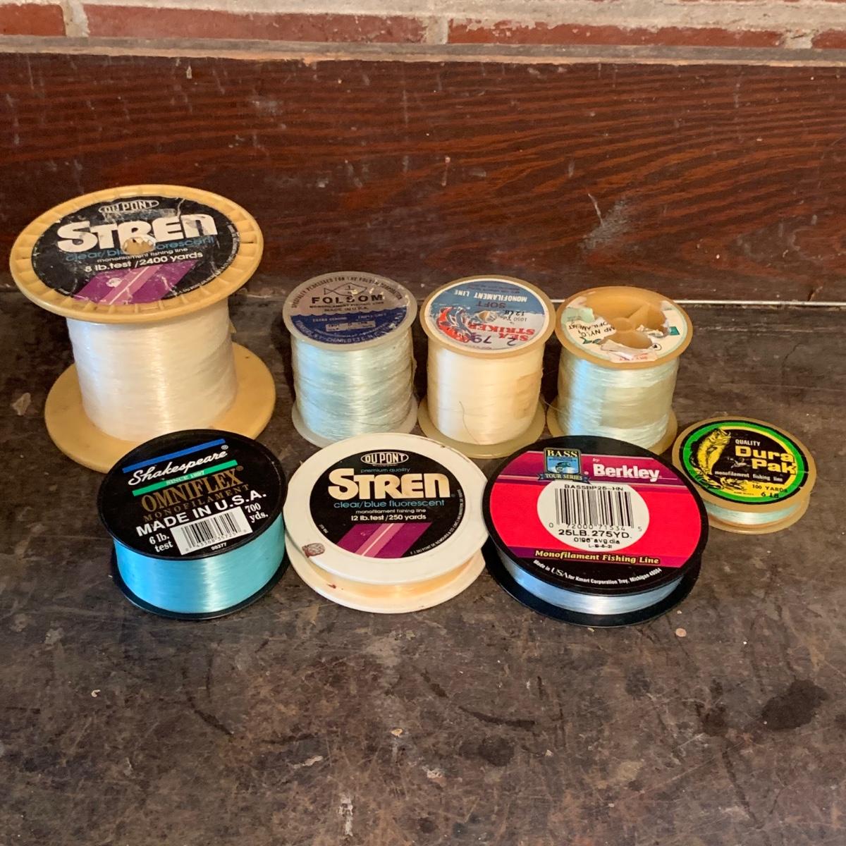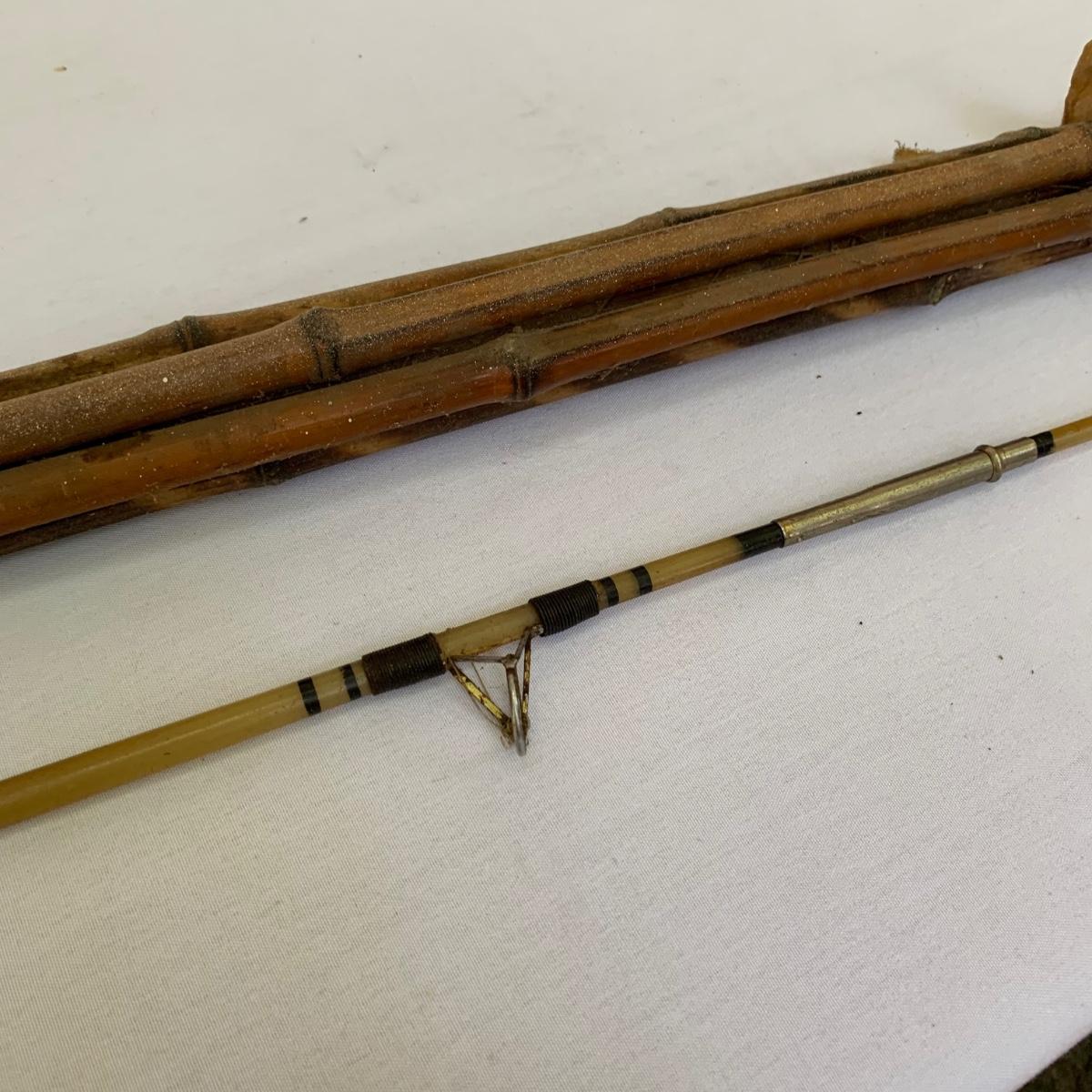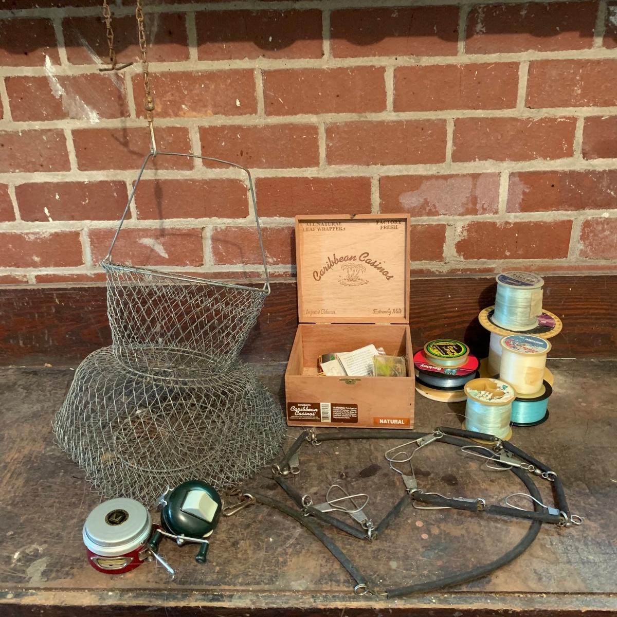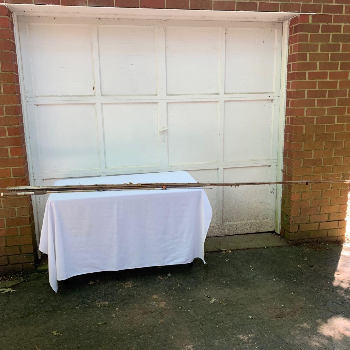 Six fishing poles, five of which are unique bamboo rods. The long fishing poles are about 9.5 ft. long. There are also two reels, many rolls of fishing line, a tackle box, and more. Local pickup only.