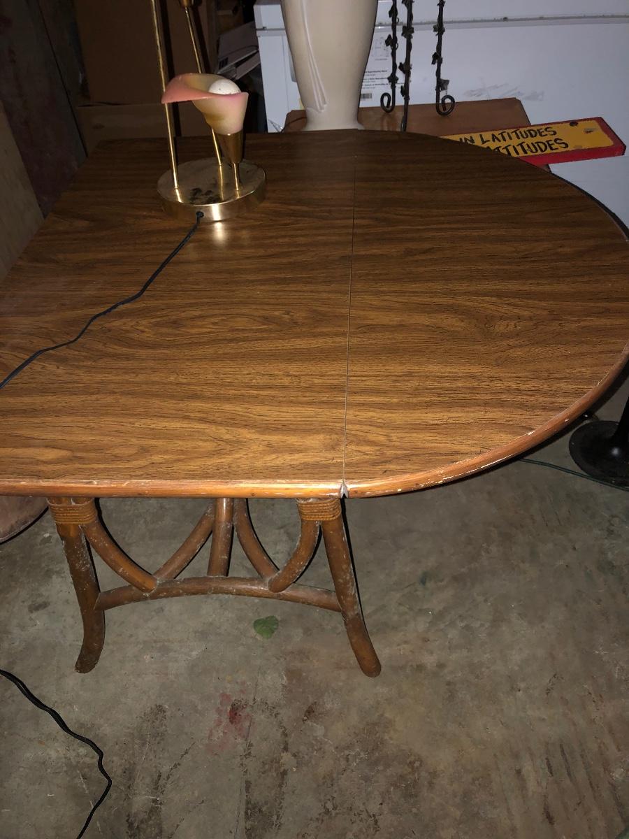 This is a great set. Chairs need new upholstery or could possibly be cleaned but cane is in tact. Table is a fold down and measures 20 x 36 with sides down. Opens to 46”. Bamboo is completely in tact.cane chairs are 36” high and seat is 18” off ground.