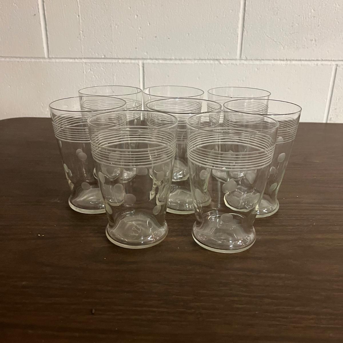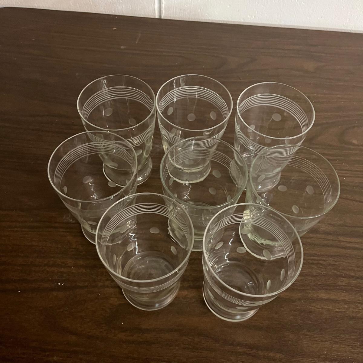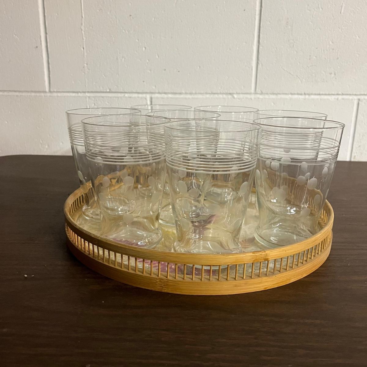 Lot includes a bamboo serving tray with a design pressed under glass with a brass colored edge along within eight etched glasses. Tray measures 11”D x 1.5” tall.