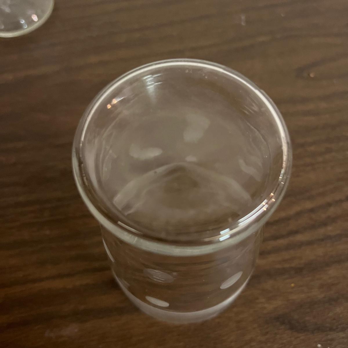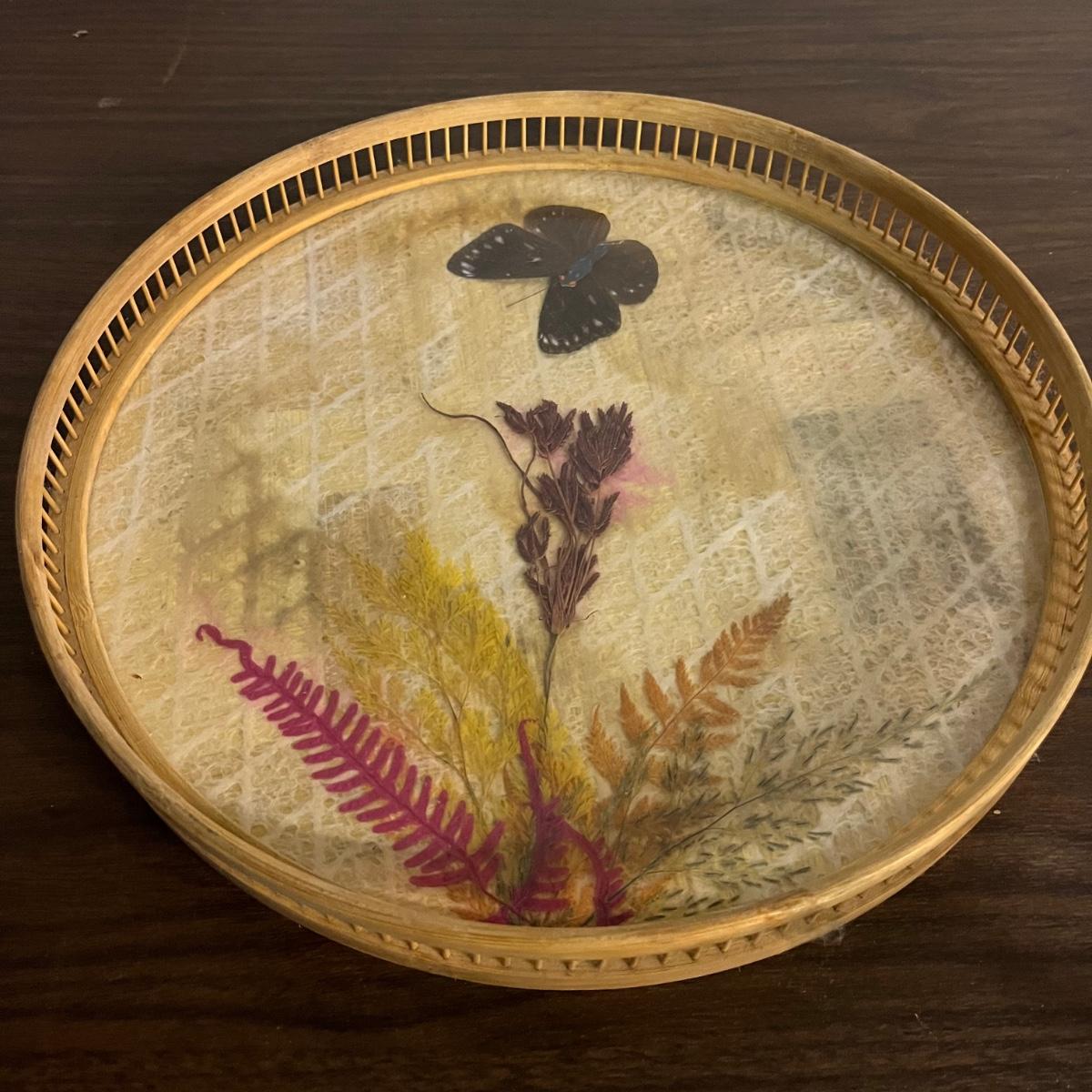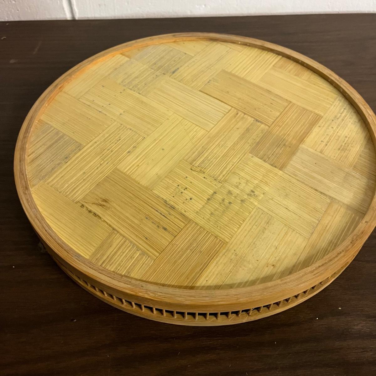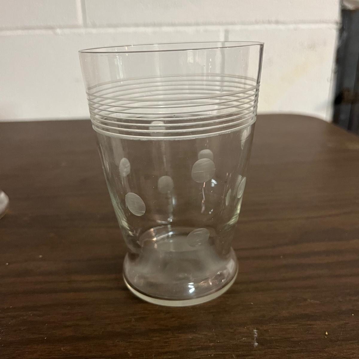 Lot includes a bamboo serving tray with a design pressed under glass with a brass colored edge along within eight etched glasses. Tray measures 11”D x 1.5” tall.