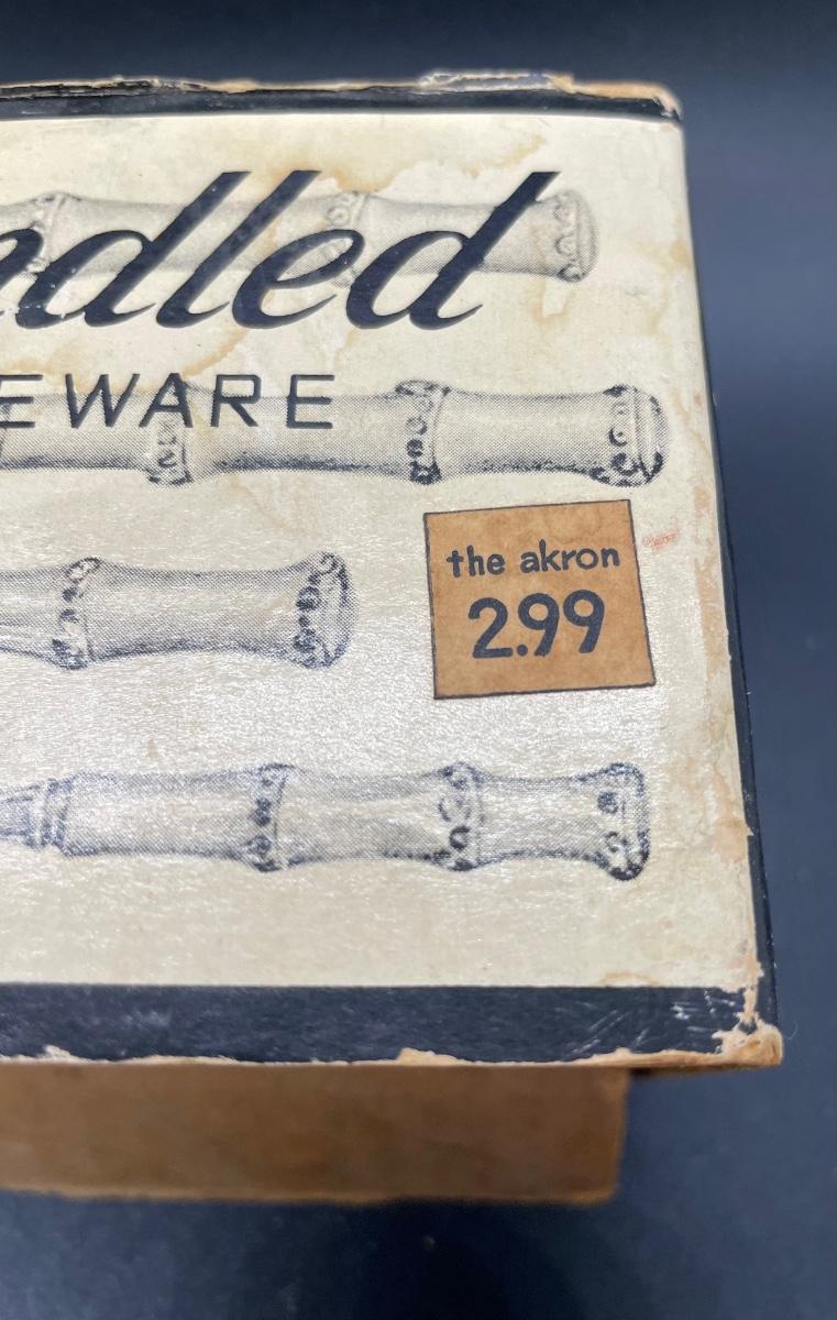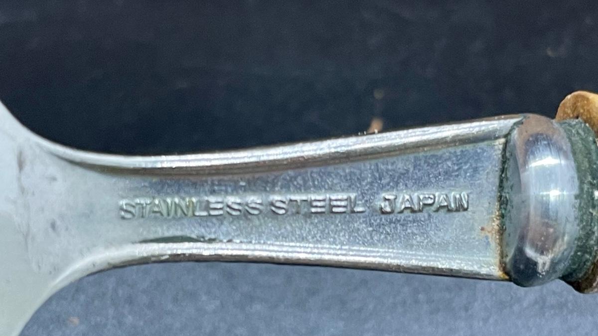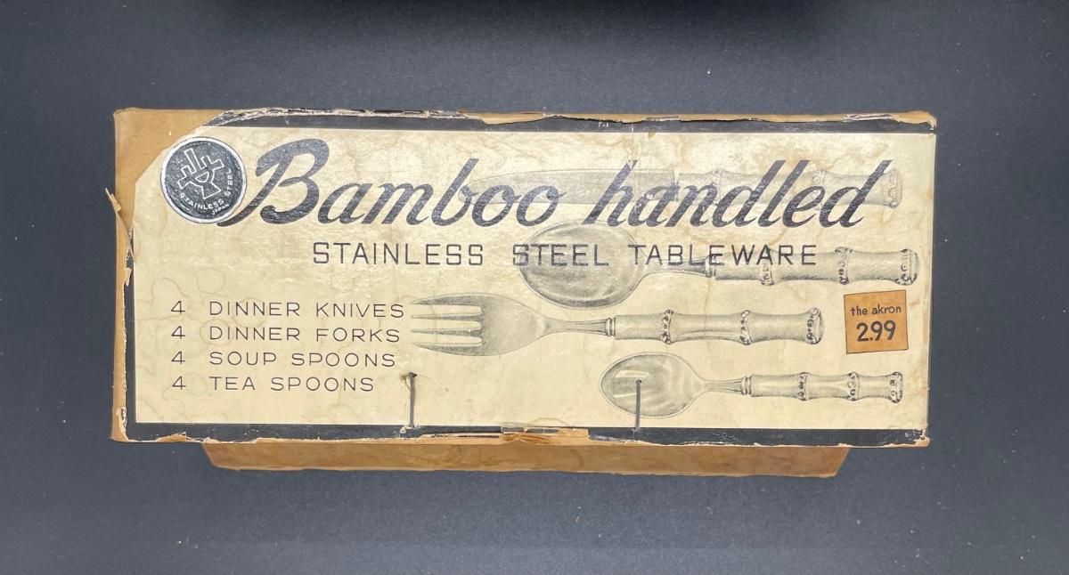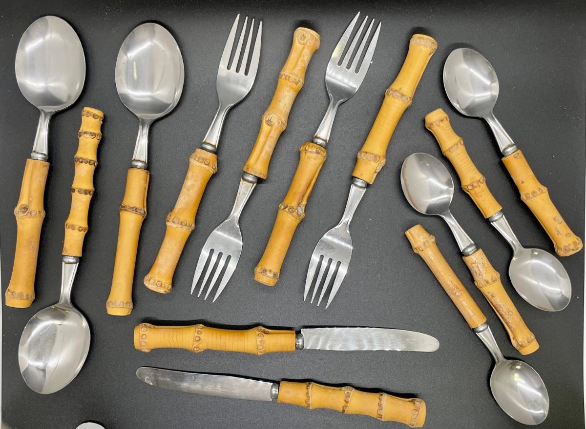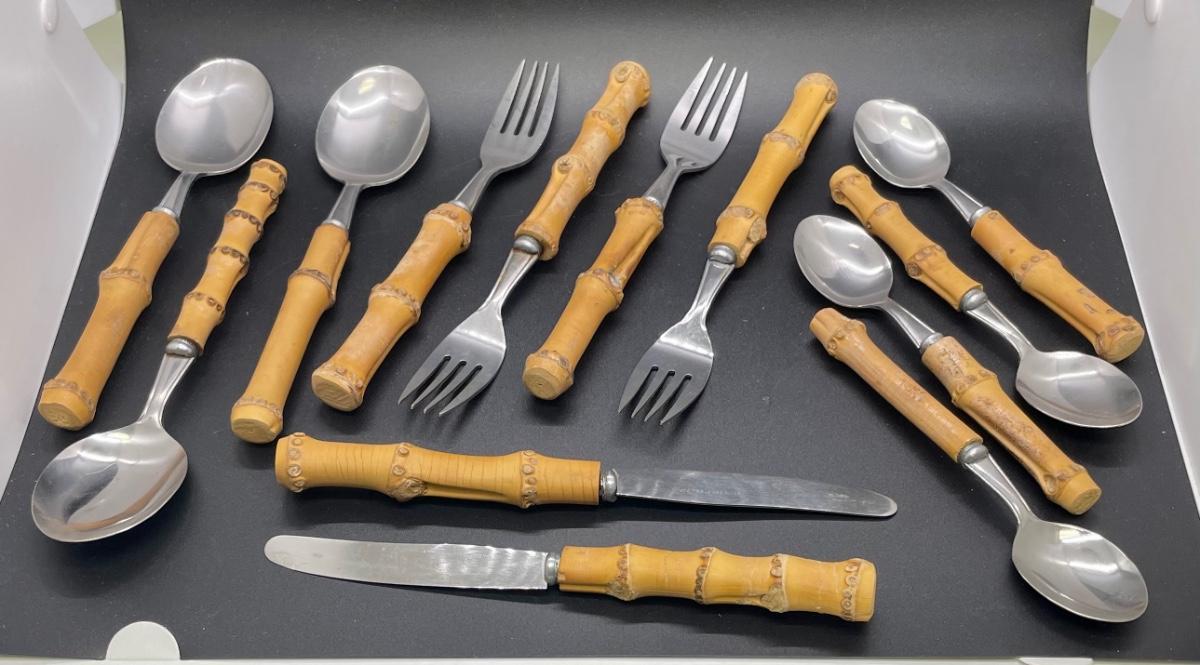 13-piece incomplete set of bamboo handled stainless steel tableware. Please see photos to identify the 3 missing items.