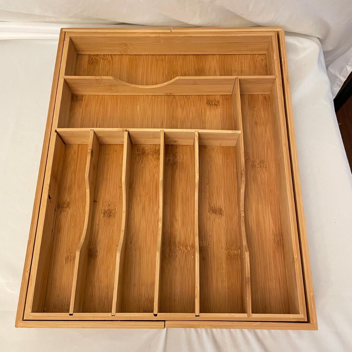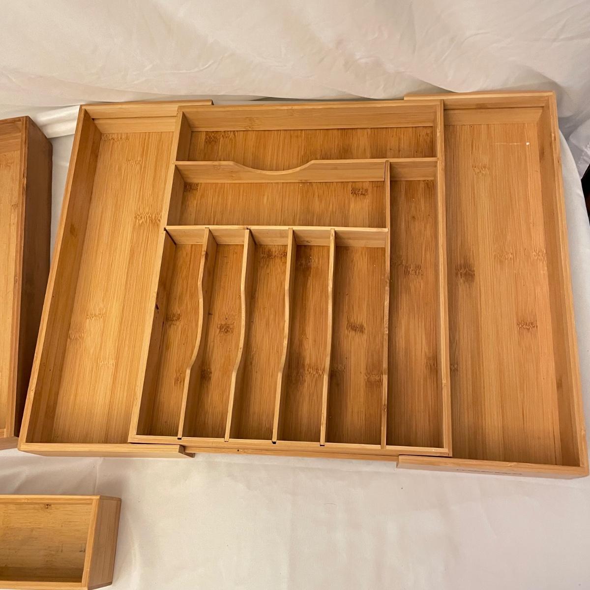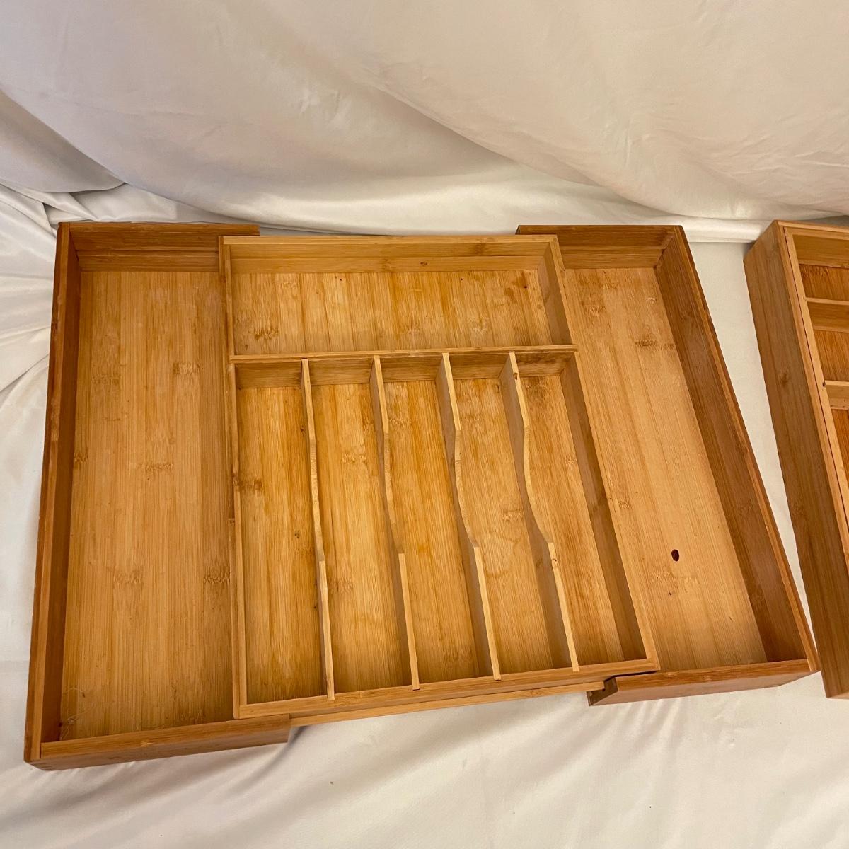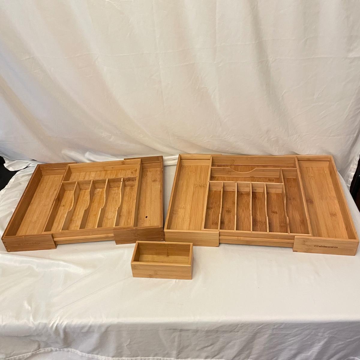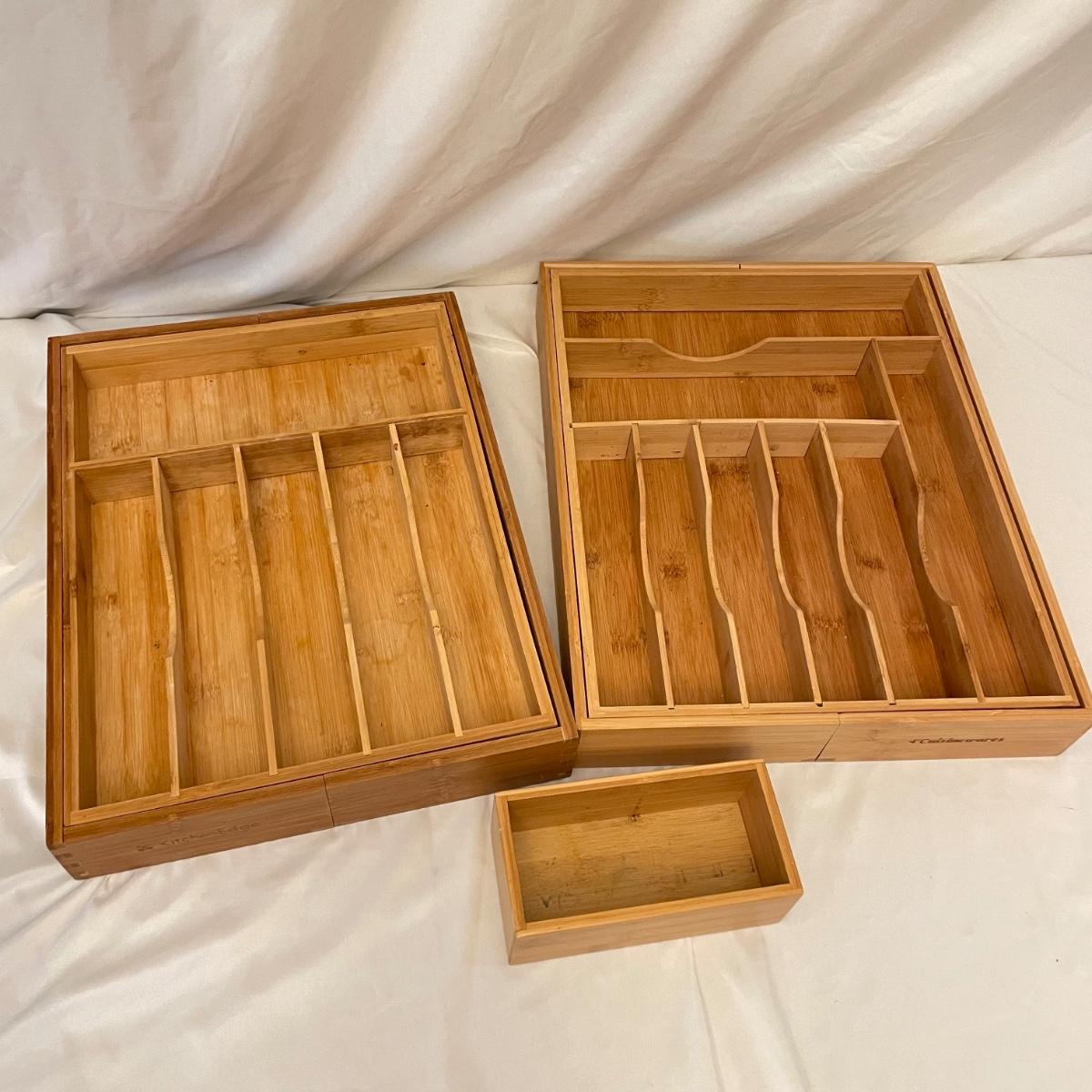 Three drawer organizers, all likely bamboo. The two large ones are width-adjustable to fit most drawers. The Cuisineware piece measures between 14” and 23” x 17.5” x 2.75”H; the KitchenEdge organizer is between 13” and 22” x 16.5” x 2.5”H. The smallest box is 7” x 3.5” x 2.5”H.