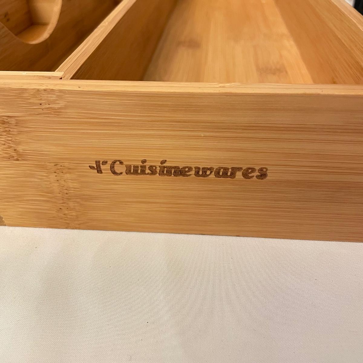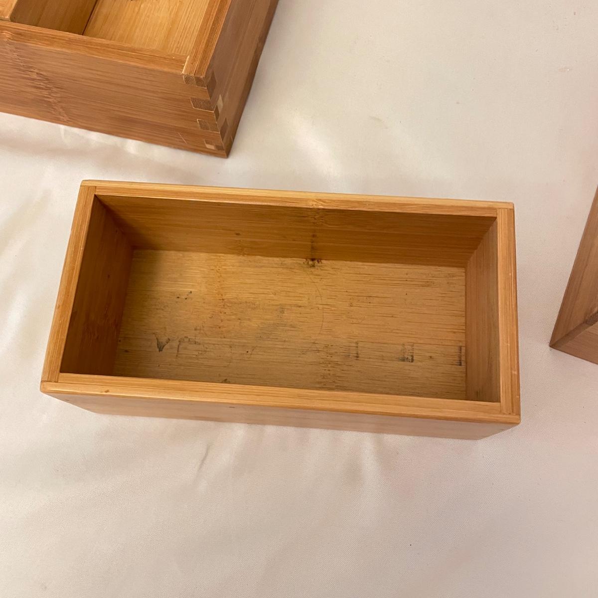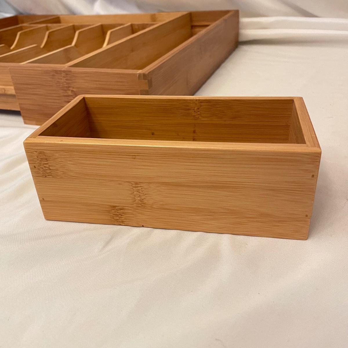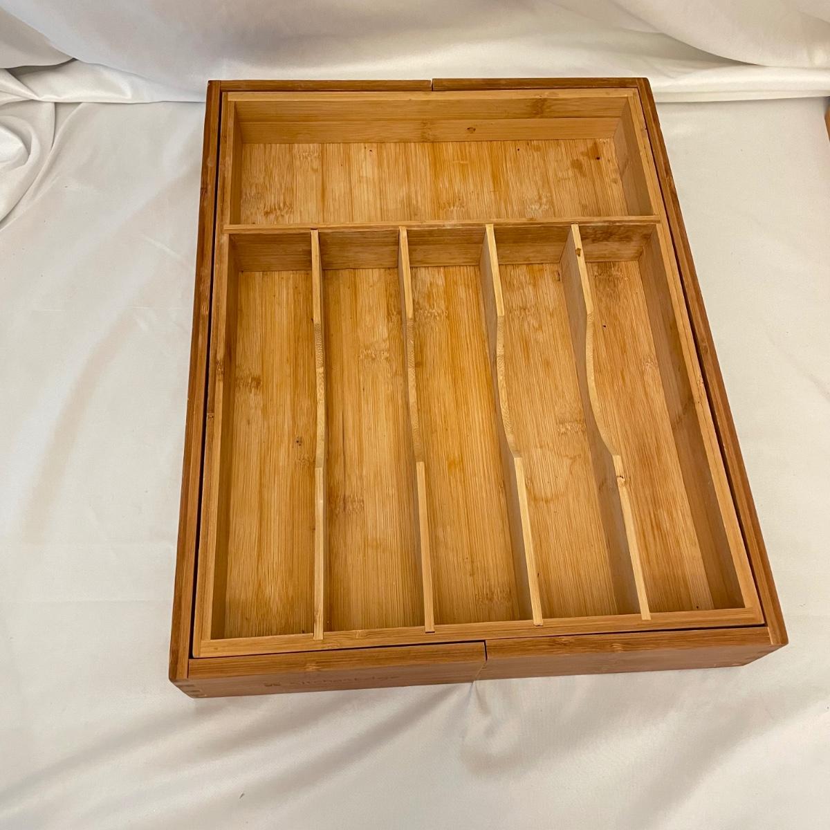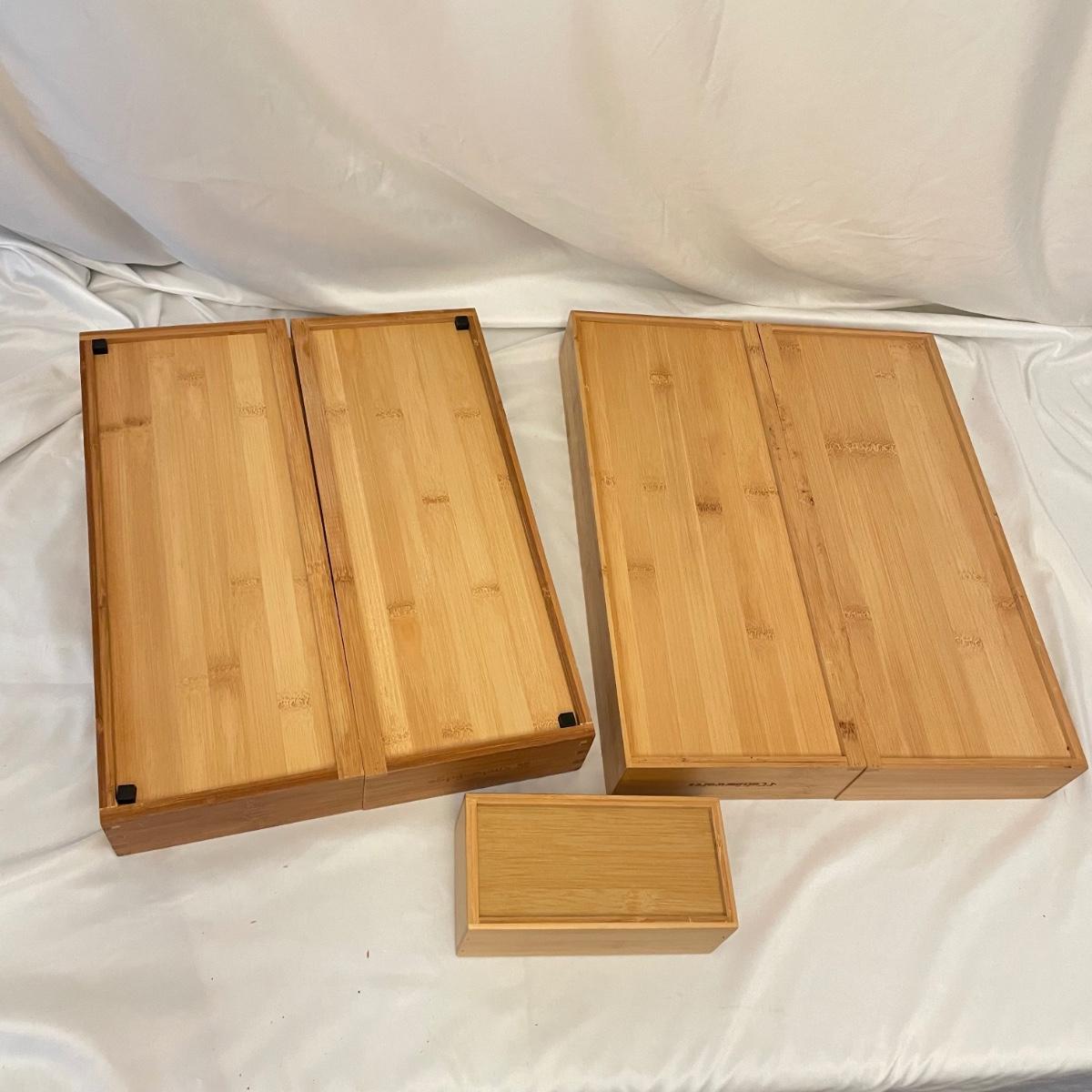 Three drawer organizers, all likely bamboo. The two large ones are width-adjustable to fit most drawers. The Cuisineware piece measures between 14” and 23” x 17.5” x 2.75”H; the KitchenEdge organizer is between 13” and 22” x 16.5” x 2.5”H. The smallest box is 7” x 3.5” x 2.5”H.