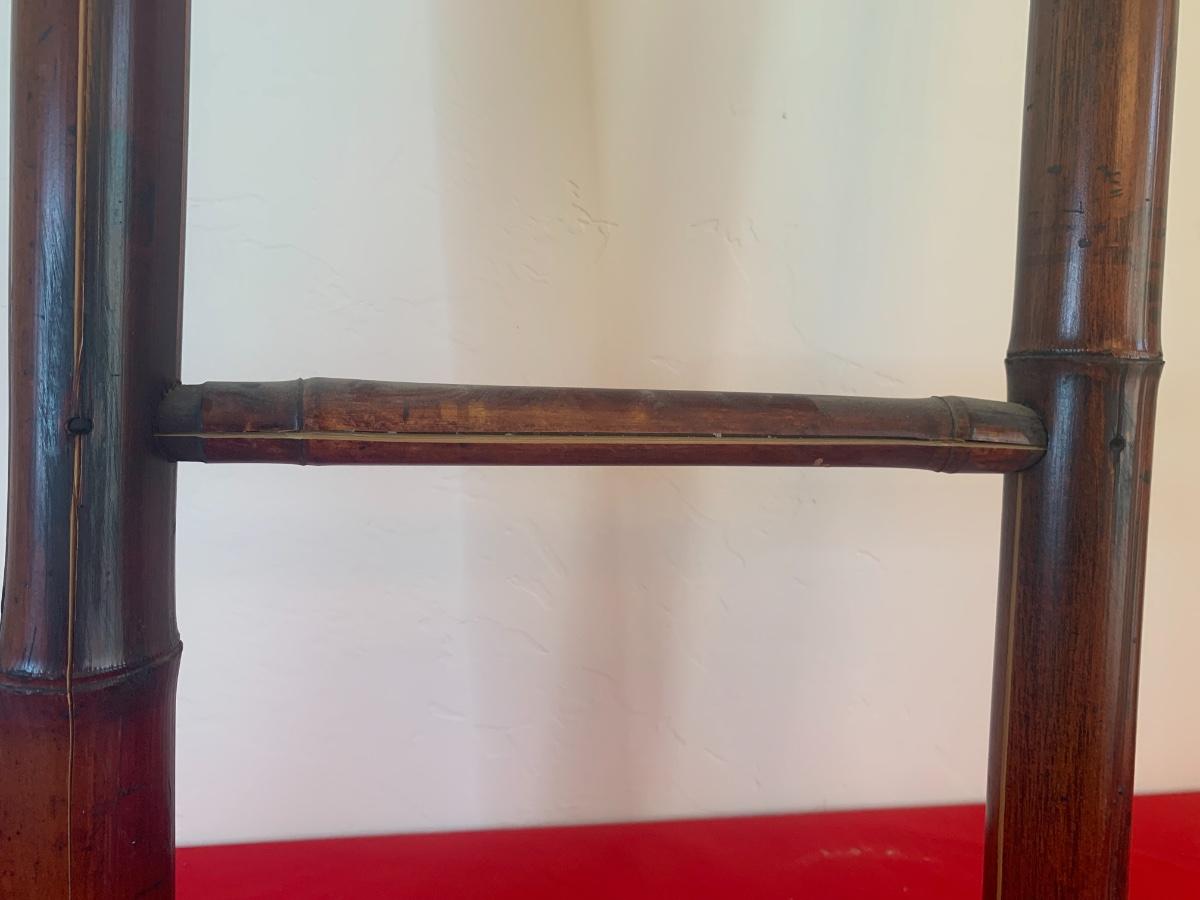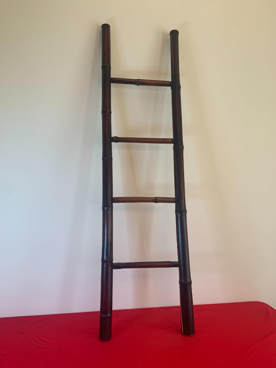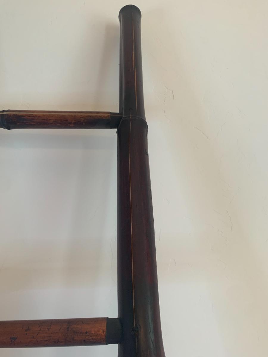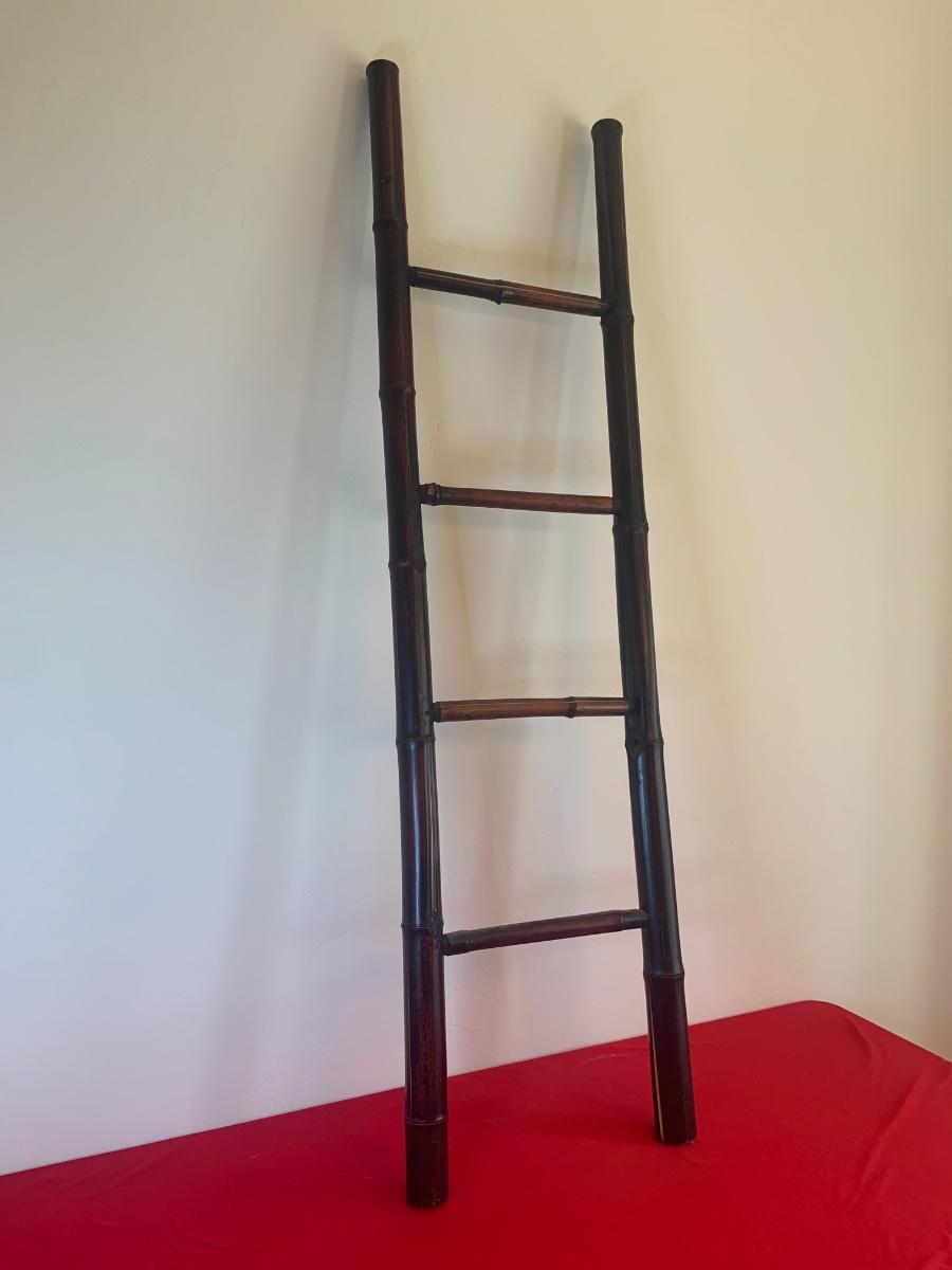 Dark wood bamboo ladder with 4 rungs. Has some splits in the bamboo, see photos. Still shows well! 58” tall