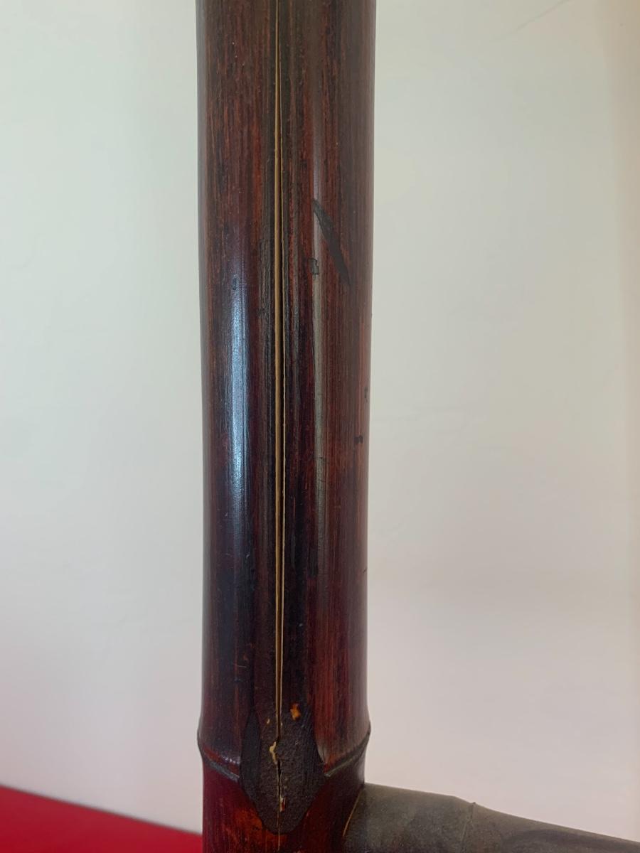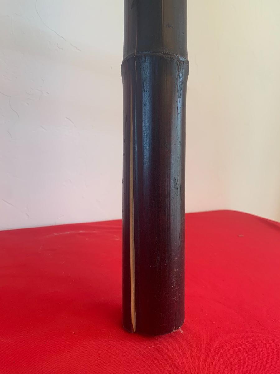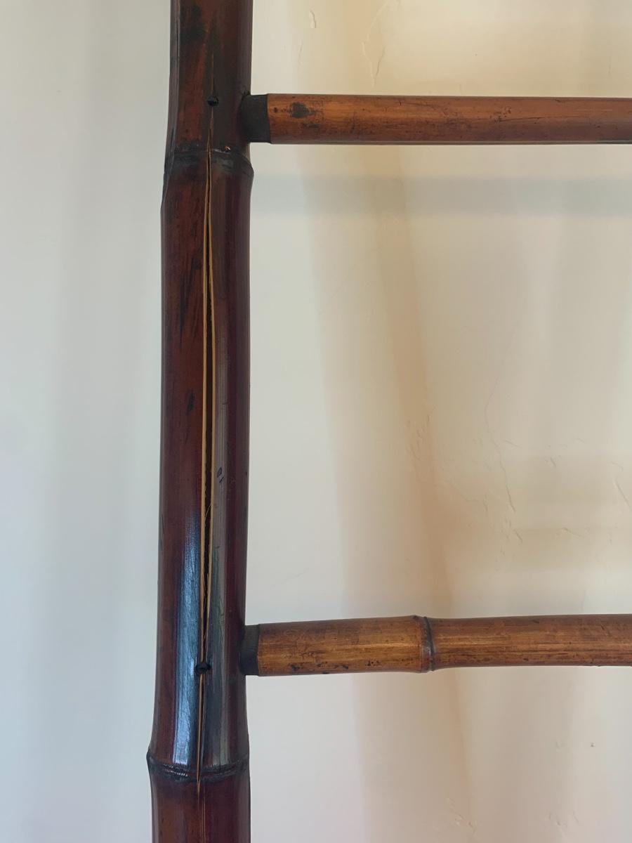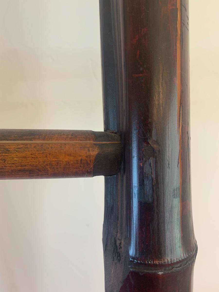 Dark wood bamboo ladder with 4 rungs. Has some splits in the bamboo, see photos. Still shows well! 58” tall