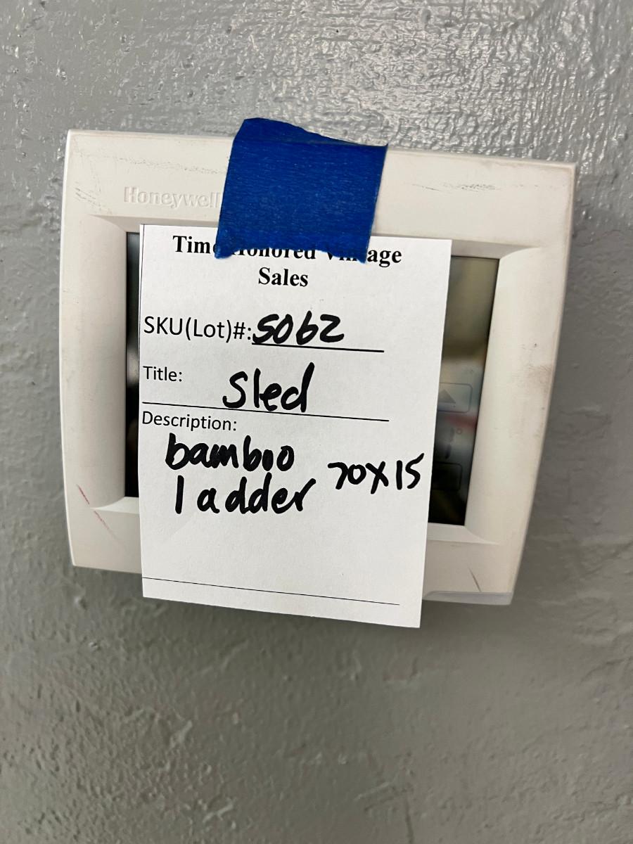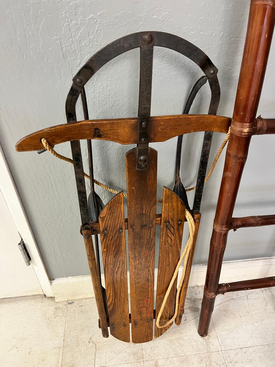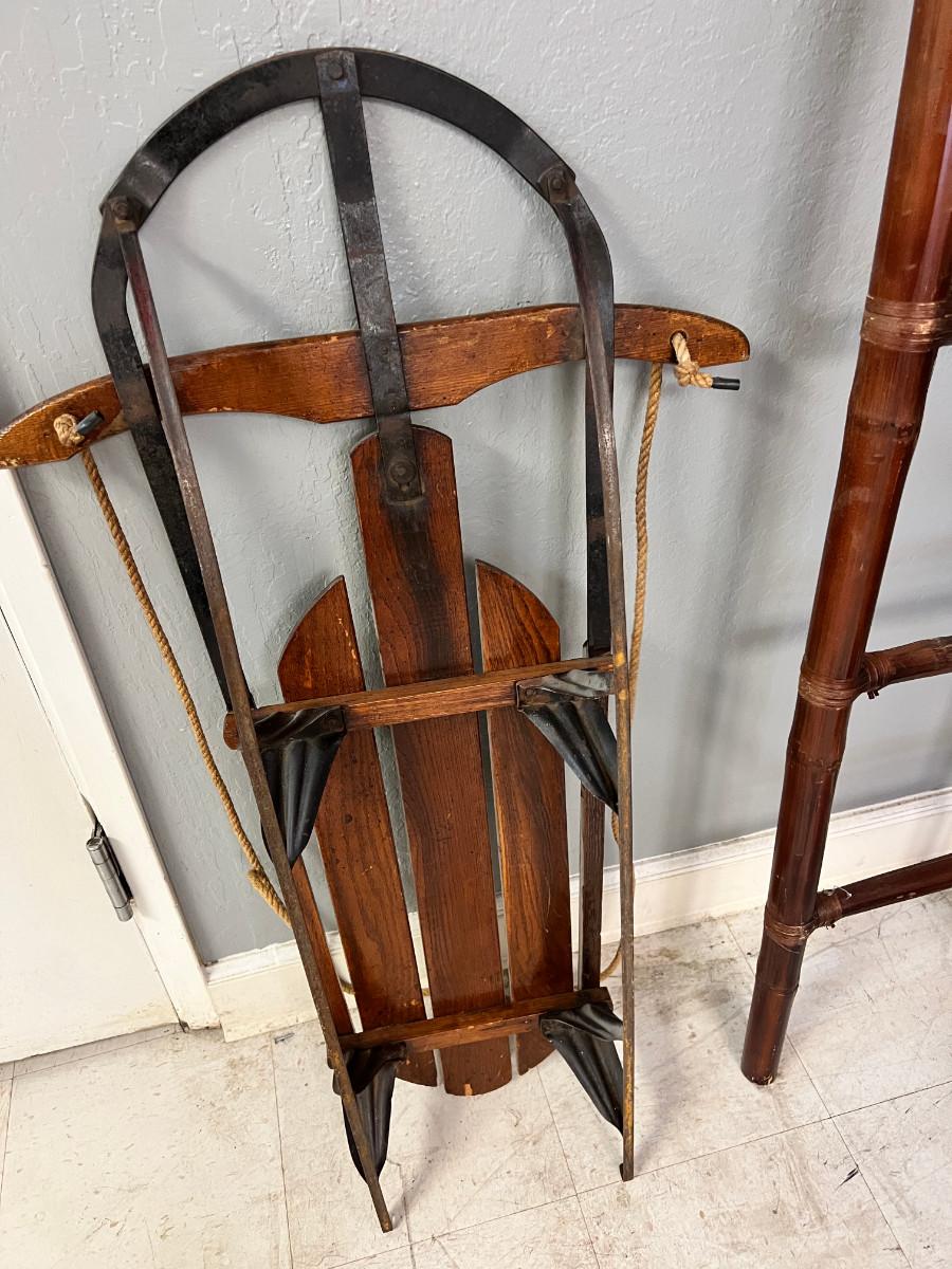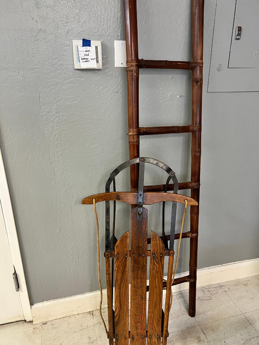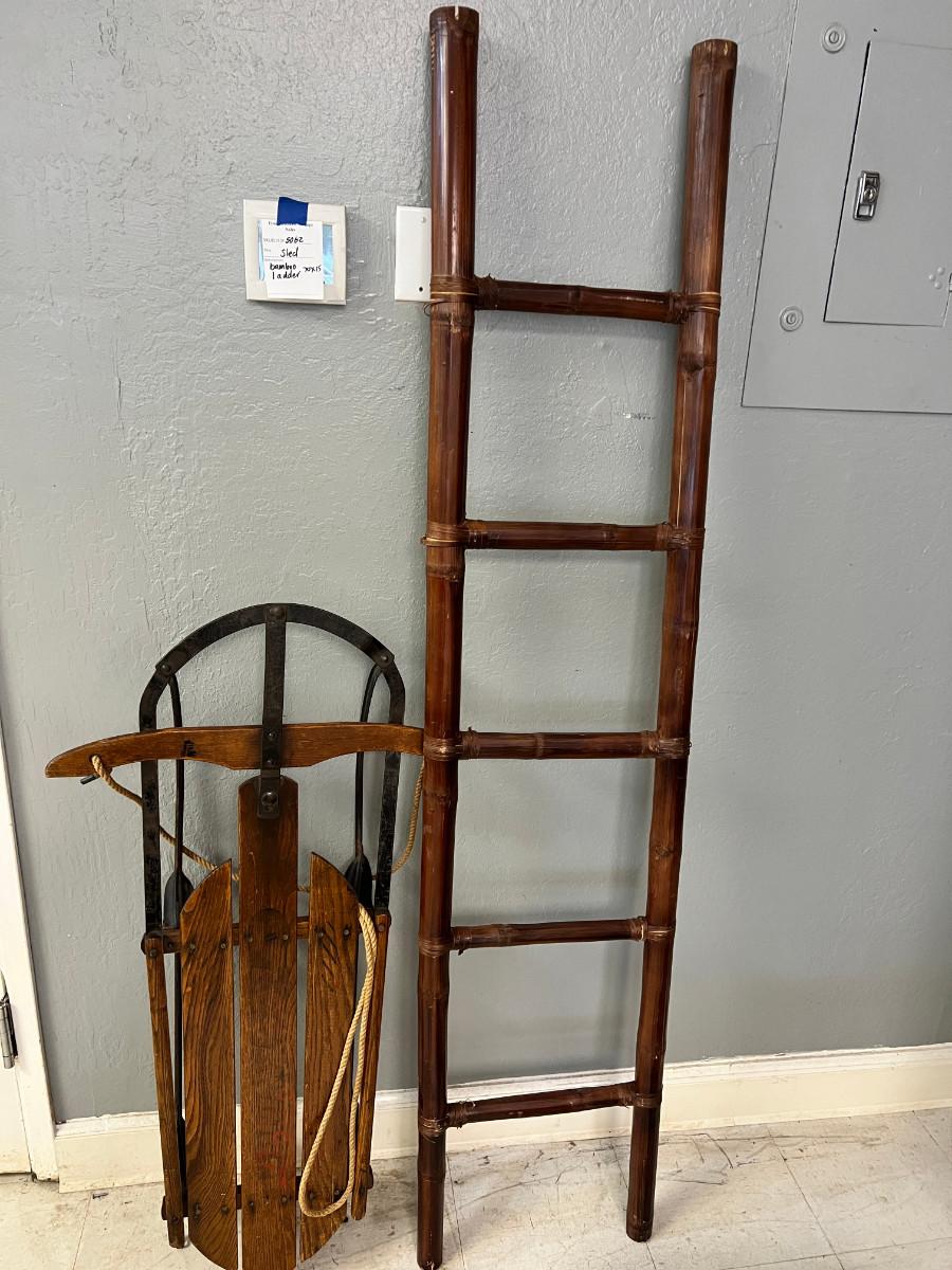 Home Decor display ladder, great for quilts or other linens. Antique sled is also a great piece for display.