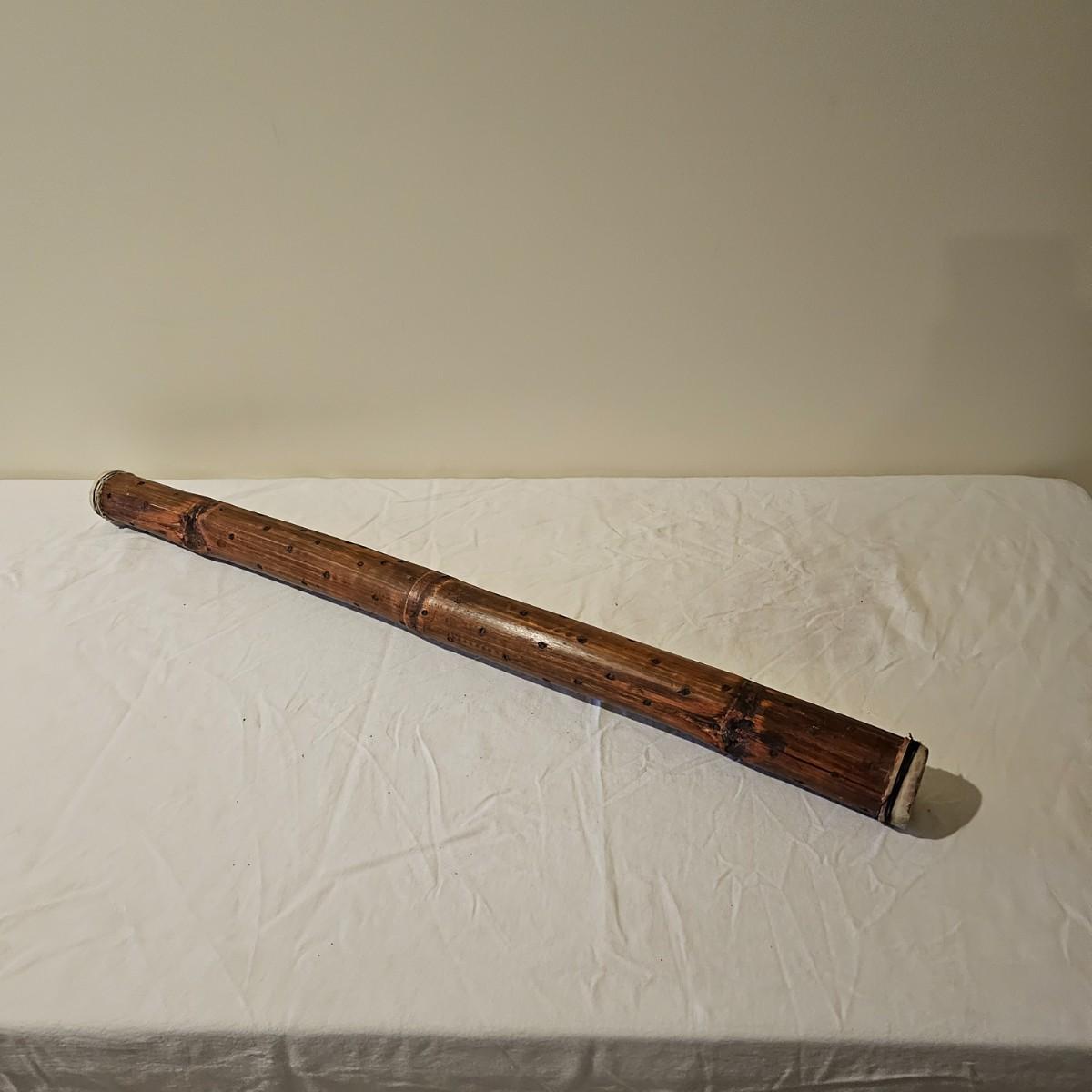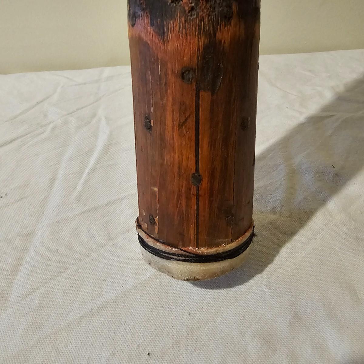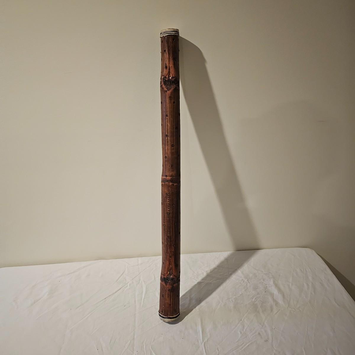 Large diameter bamboo rain stick. Item is filled with seeds and other things that sound like rain when turned upside down. Ends are some type of hide, wrapped and secured. Stick measures 2.25"D x 32"H. See photos for details. Shipping available. Shipping can be costly. We suggest contacting our preferred local shipping provider, Postage Express, with dimensions and getting an estimate before bidding: (828) 670-5501 or postageexpress@yahoo.com.