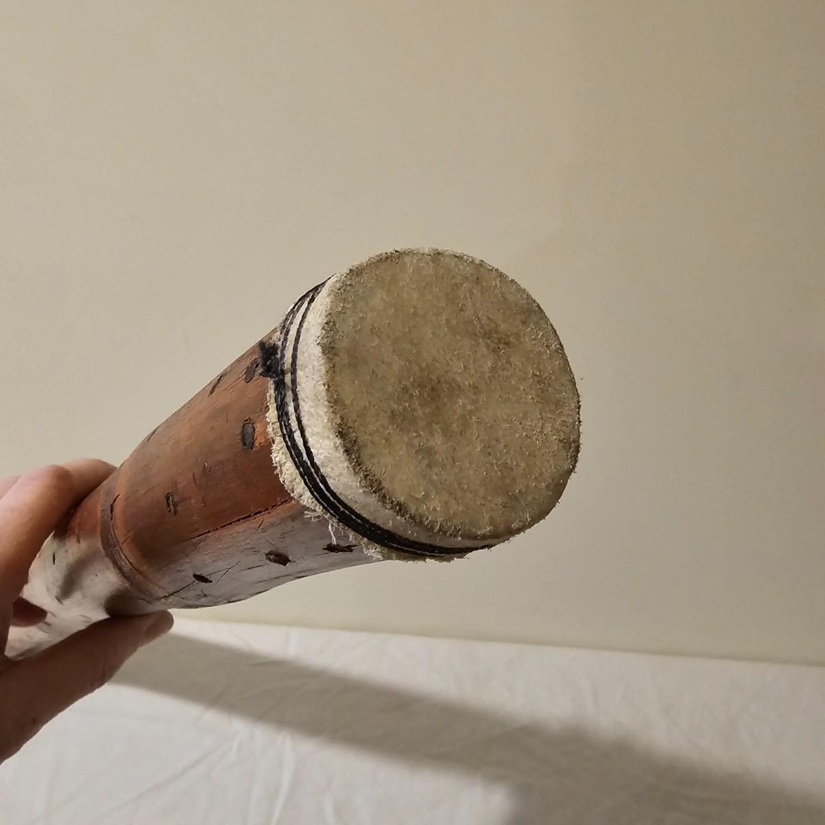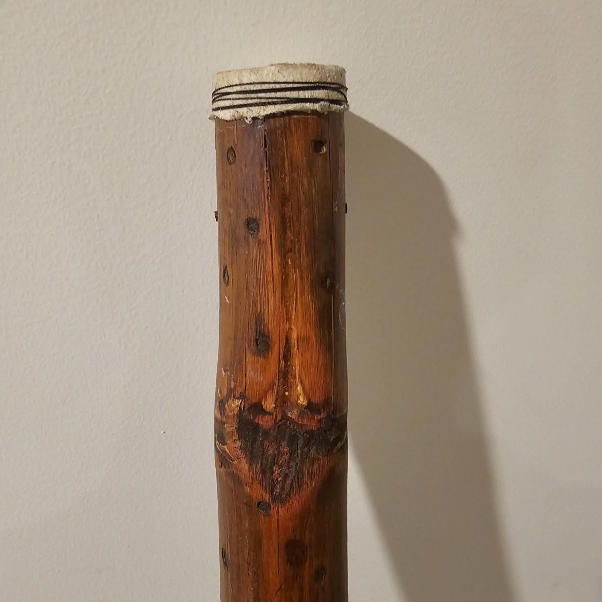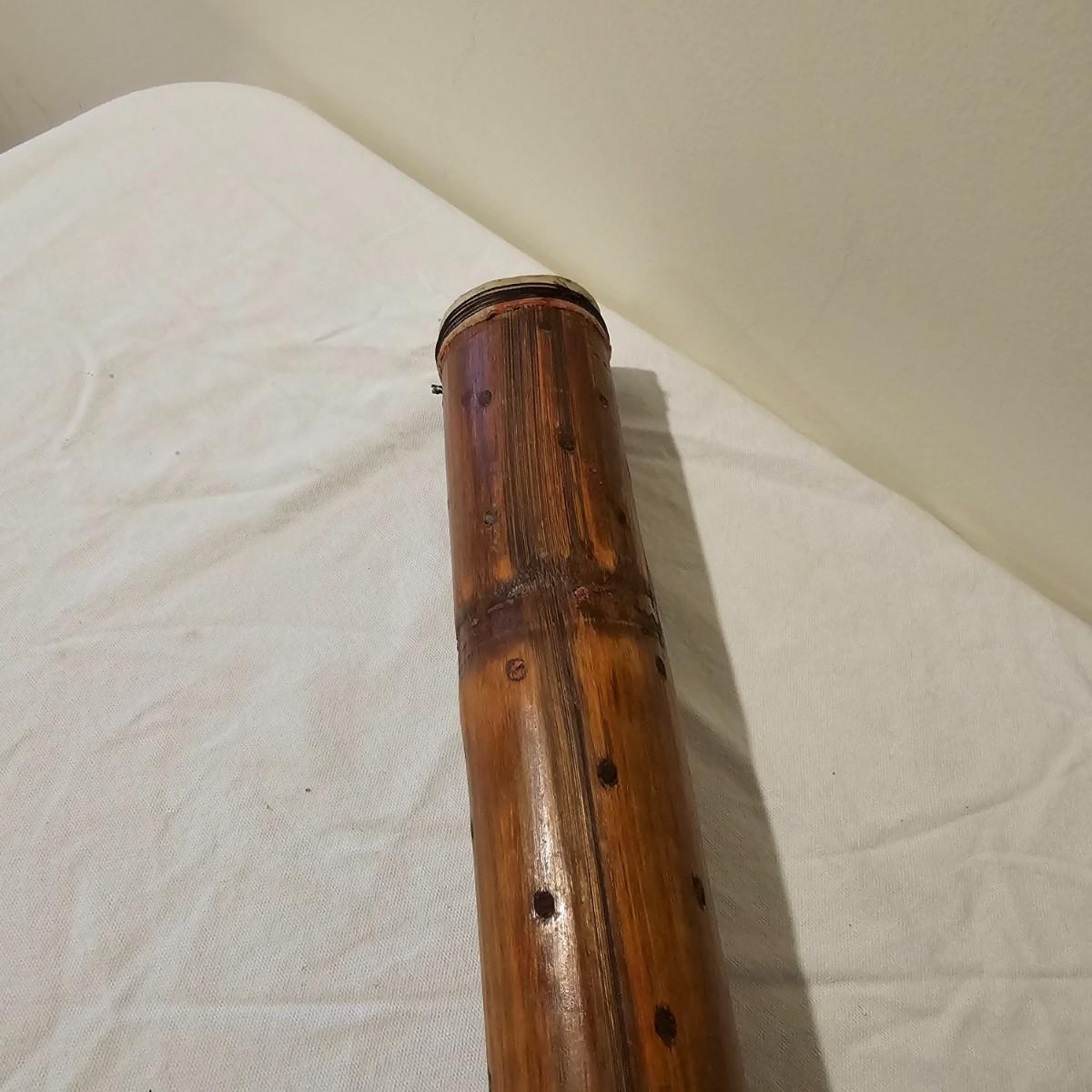 Large diameter bamboo rain stick. Item is filled with seeds and other things that sound like rain when turned upside down. Ends are some type of hide, wrapped and secured. Stick measures 2.25"D x 32"H. See photos for details. Shipping available. Shipping can be costly. We suggest contacting our preferred local shipping provider, Postage Express, with dimensions and getting an estimate before bidding: (828) 670-5501 or postageexpress@yahoo.com.