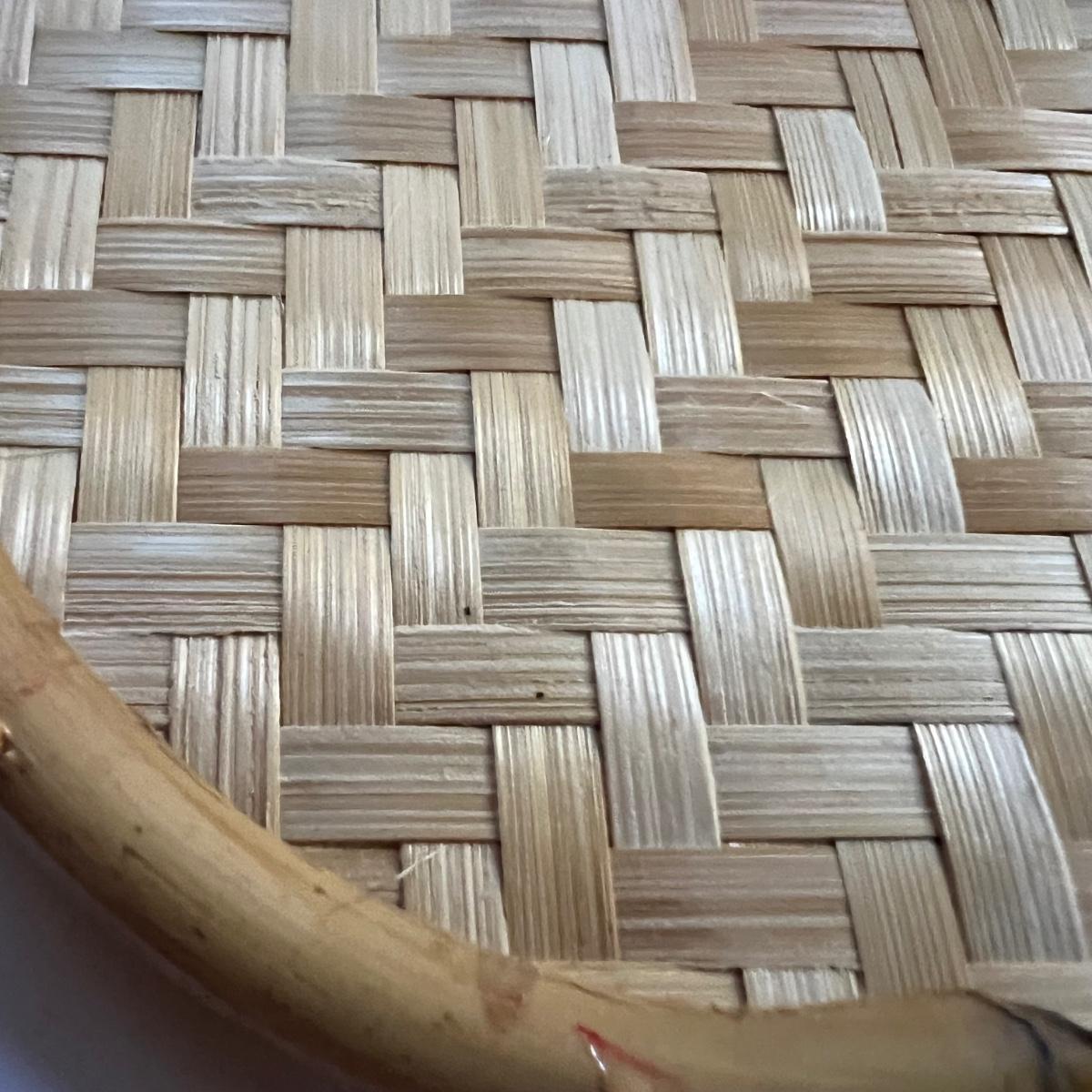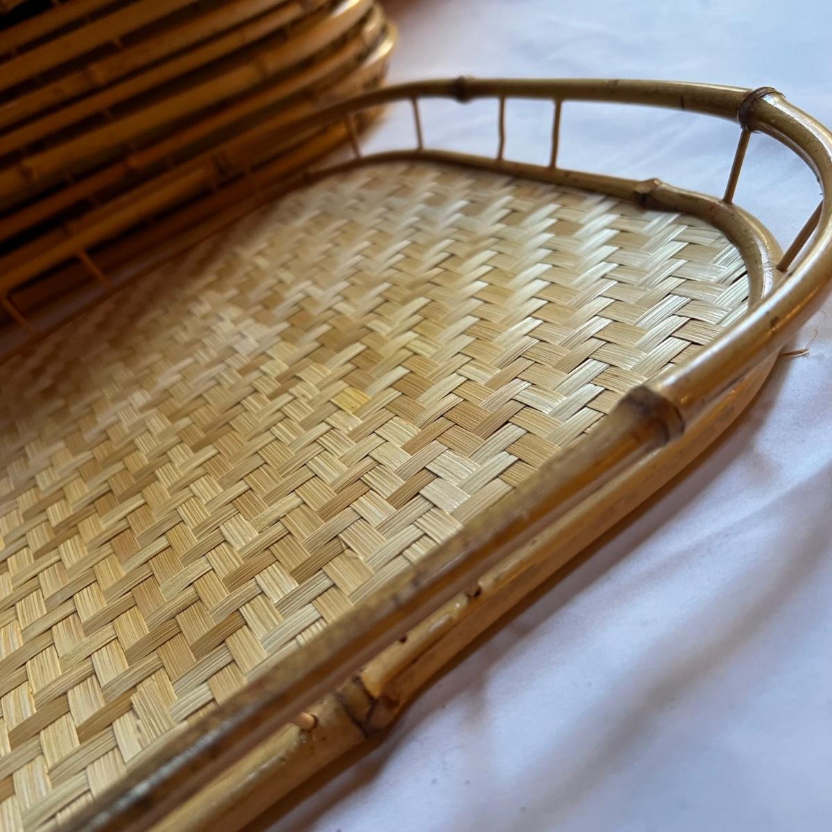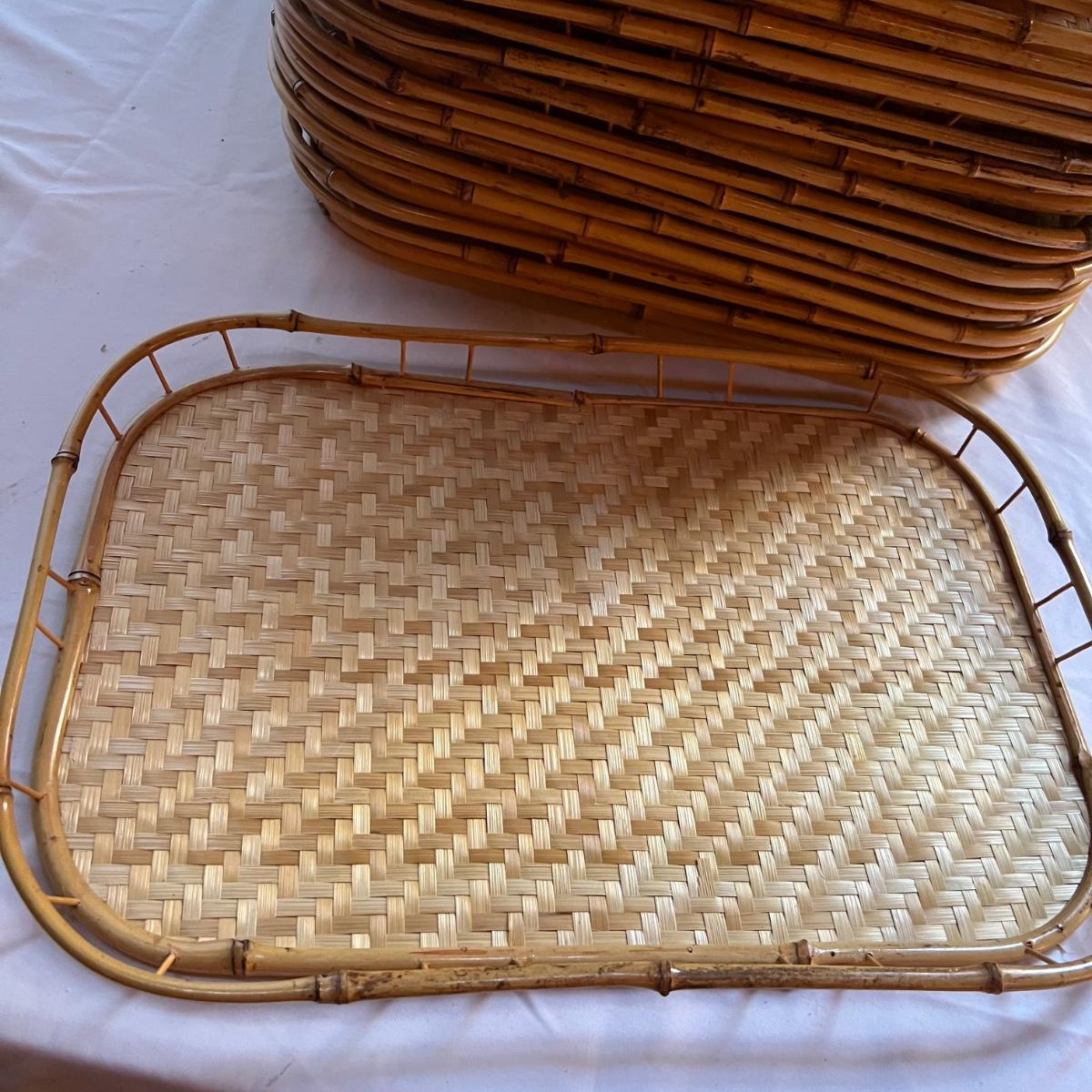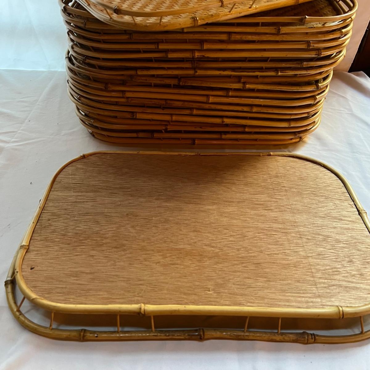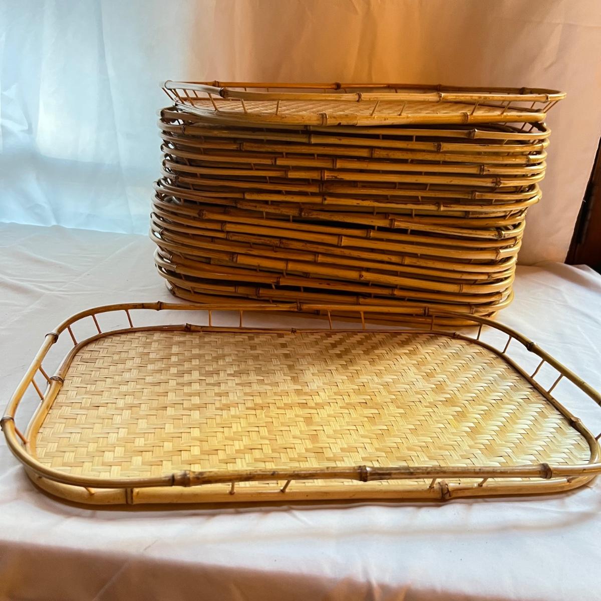 This set of 17 woven wicker serving trays are bamboo. They are lightweight and measure 13” x 1.5” x 17”.