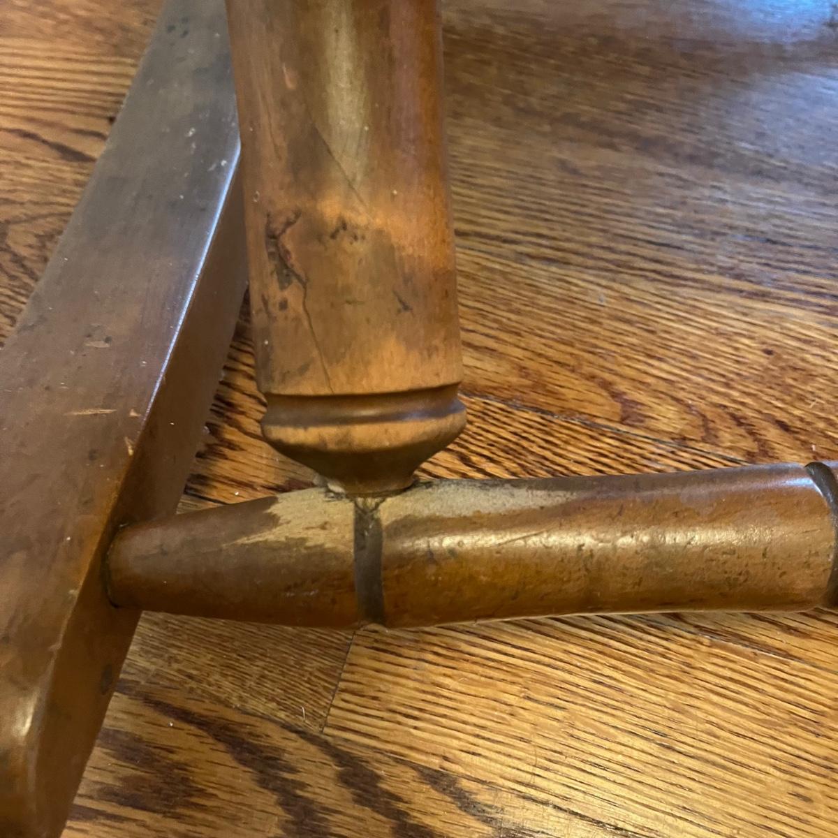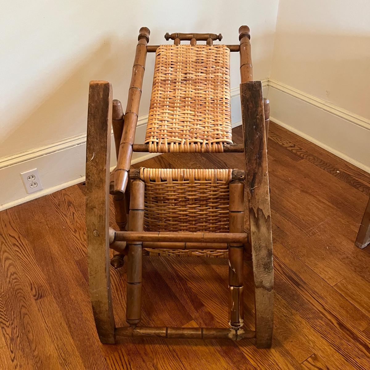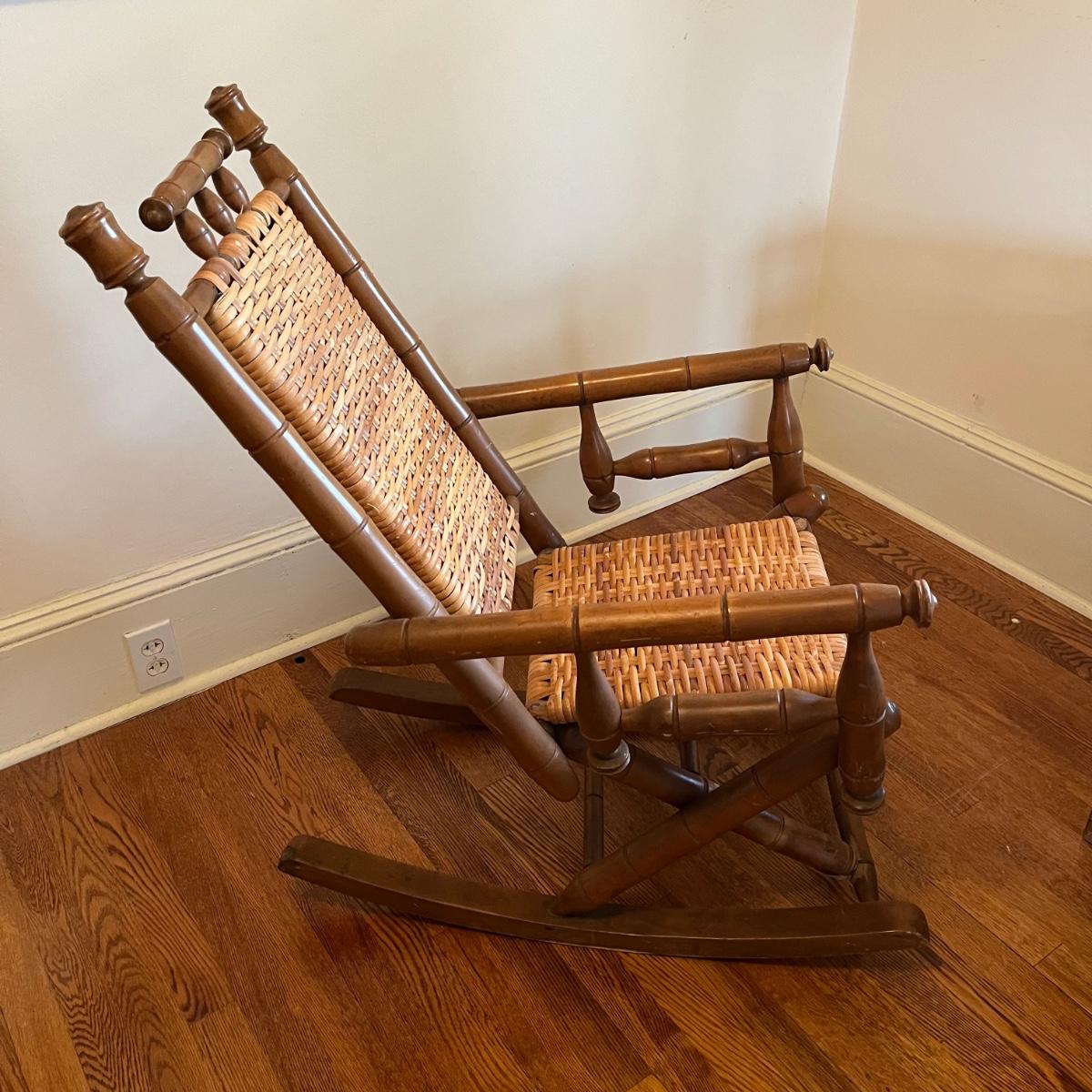 Vintage Platform rocker with woven cane seat and back and bamboo style frame. Measures 22” x 31” x 37”H. Seat height is 16”. The right arm needs to be tightened. Small signs of wear. Local pickup only.