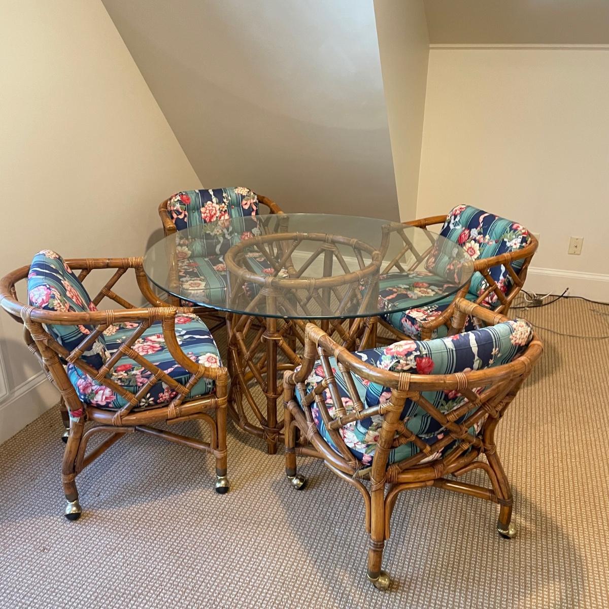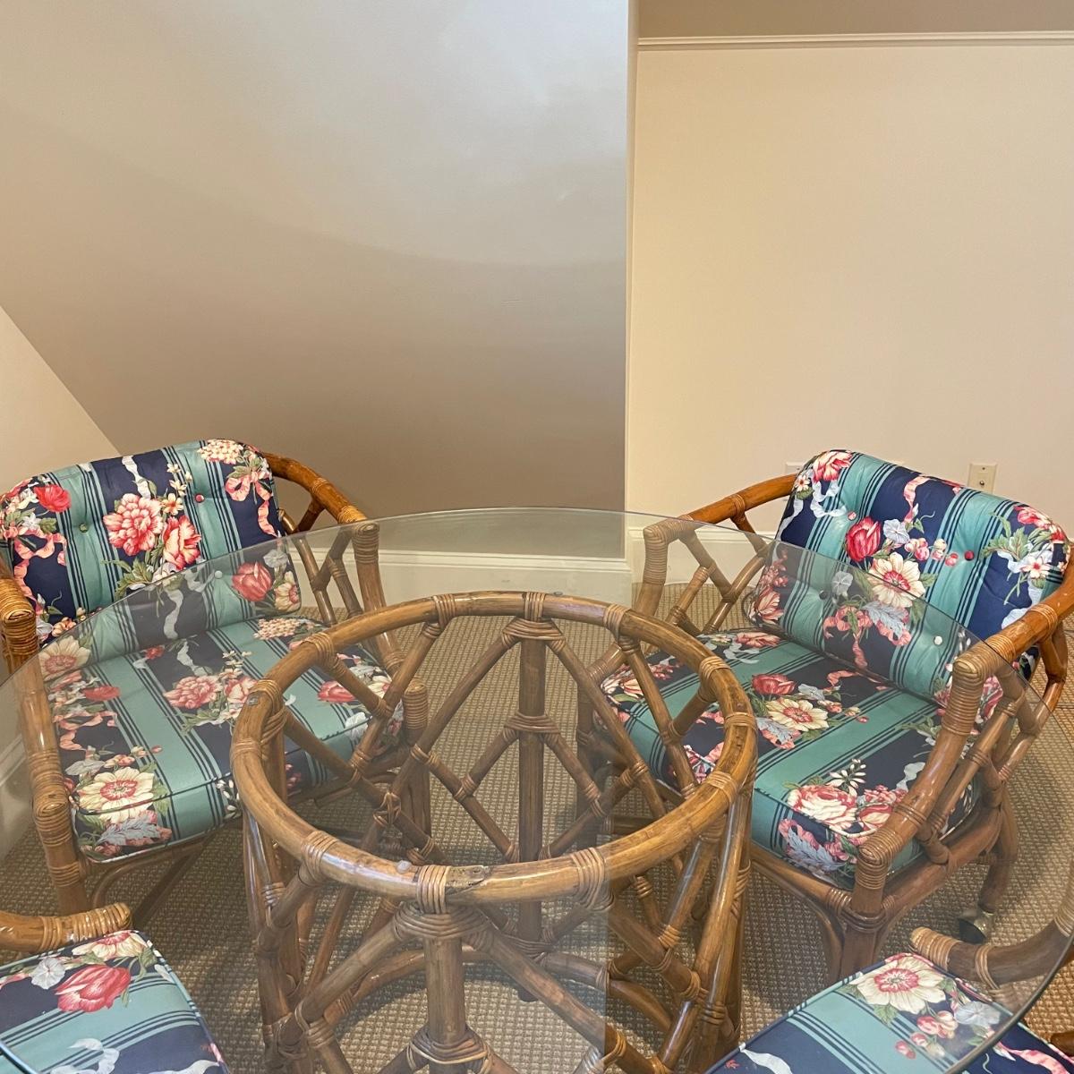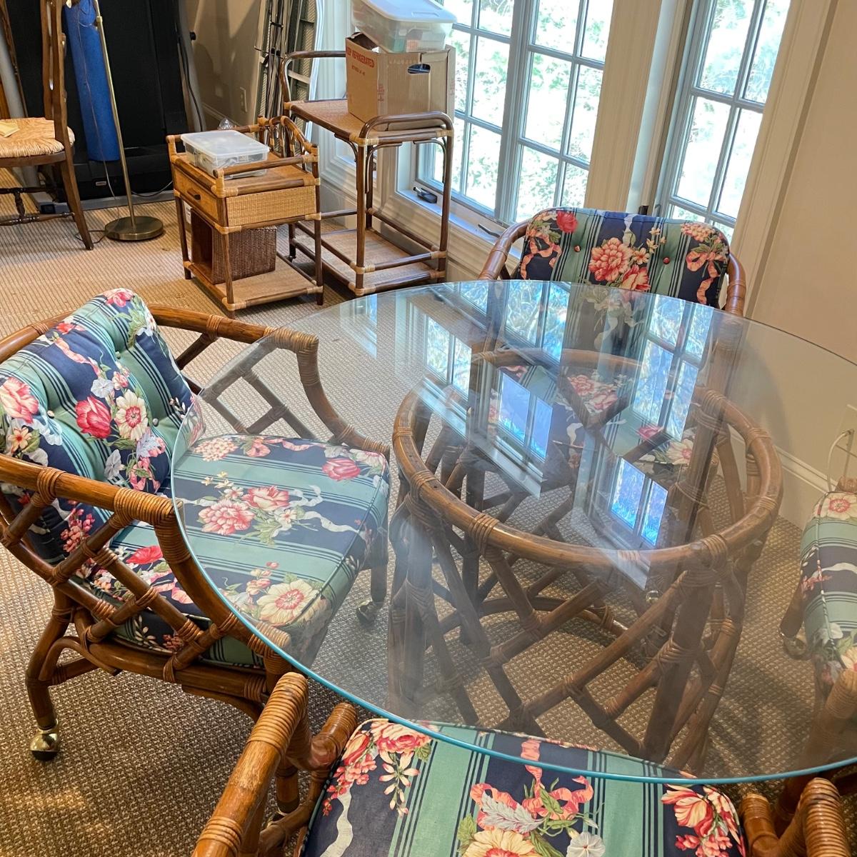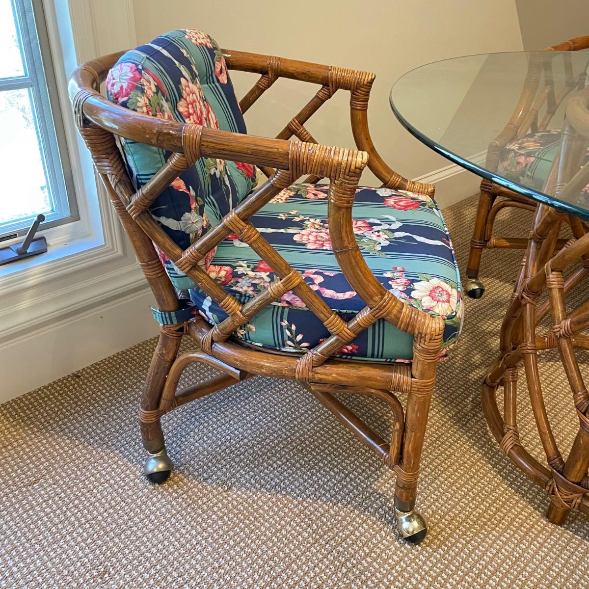 Four rolling bamboo-style chairs with floral cushions looking barely used. The barrel table with removable glass top measures 48”D x 29”H. Chairs measure 23”sq x 29”H. Pieces appear intentionally weathered with a glossy finish, although some minor blemishes are shown in photos. See images. Local pick up only. Winning bidder must bring assistance to help move and load this item due to its weight and/or size. Table and chairs are located up one flight of stairs.