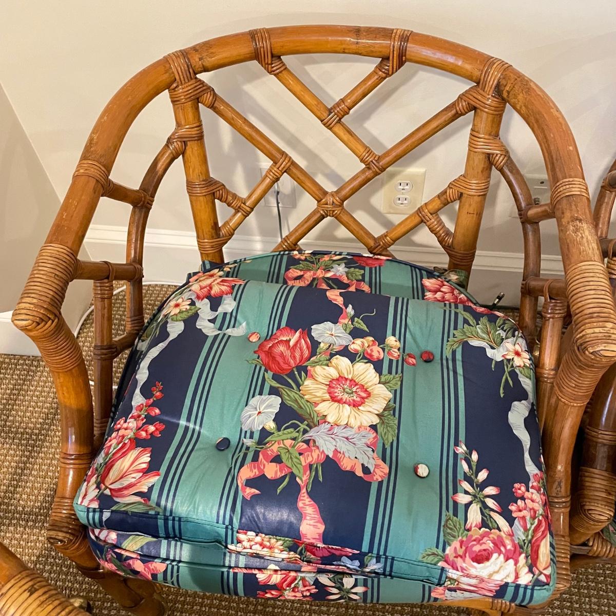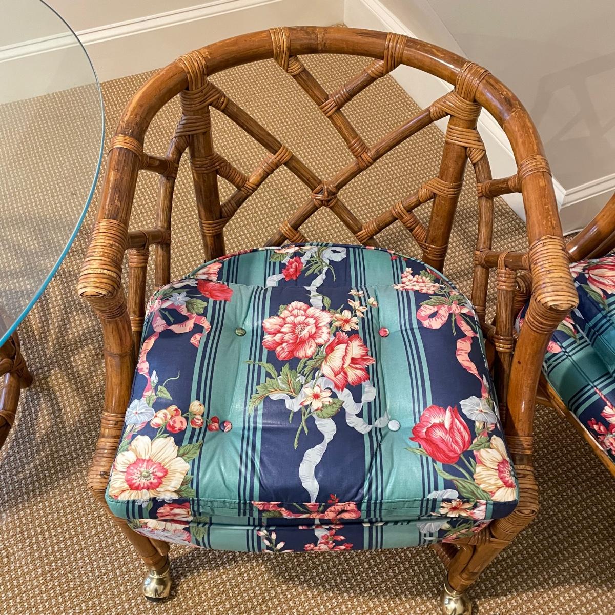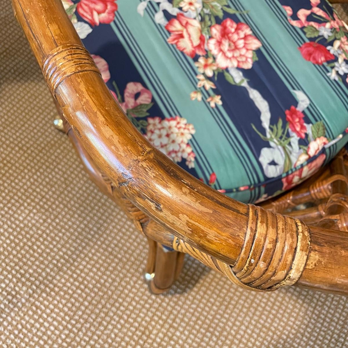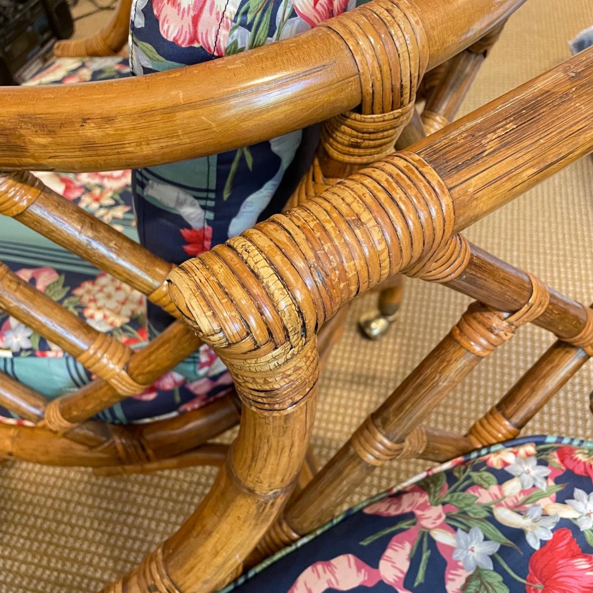 Four rolling bamboo-style chairs with floral cushions looking barely used. The barrel table with removable glass top measures 48”D x 29”H. Chairs measure 23”sq x 29”H. Pieces appear intentionally weathered with a glossy finish, although some minor blemishes are shown in photos. See images. Local pick up only. Winning bidder must bring assistance to help move and load this item due to its weight and/or size. Table and chairs are located up one flight of stairs.