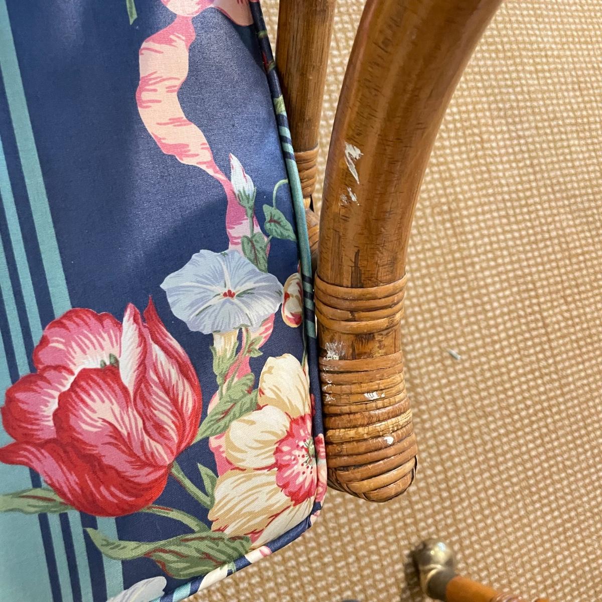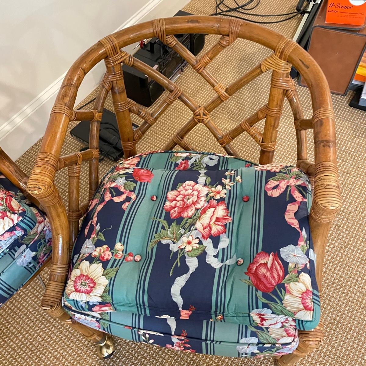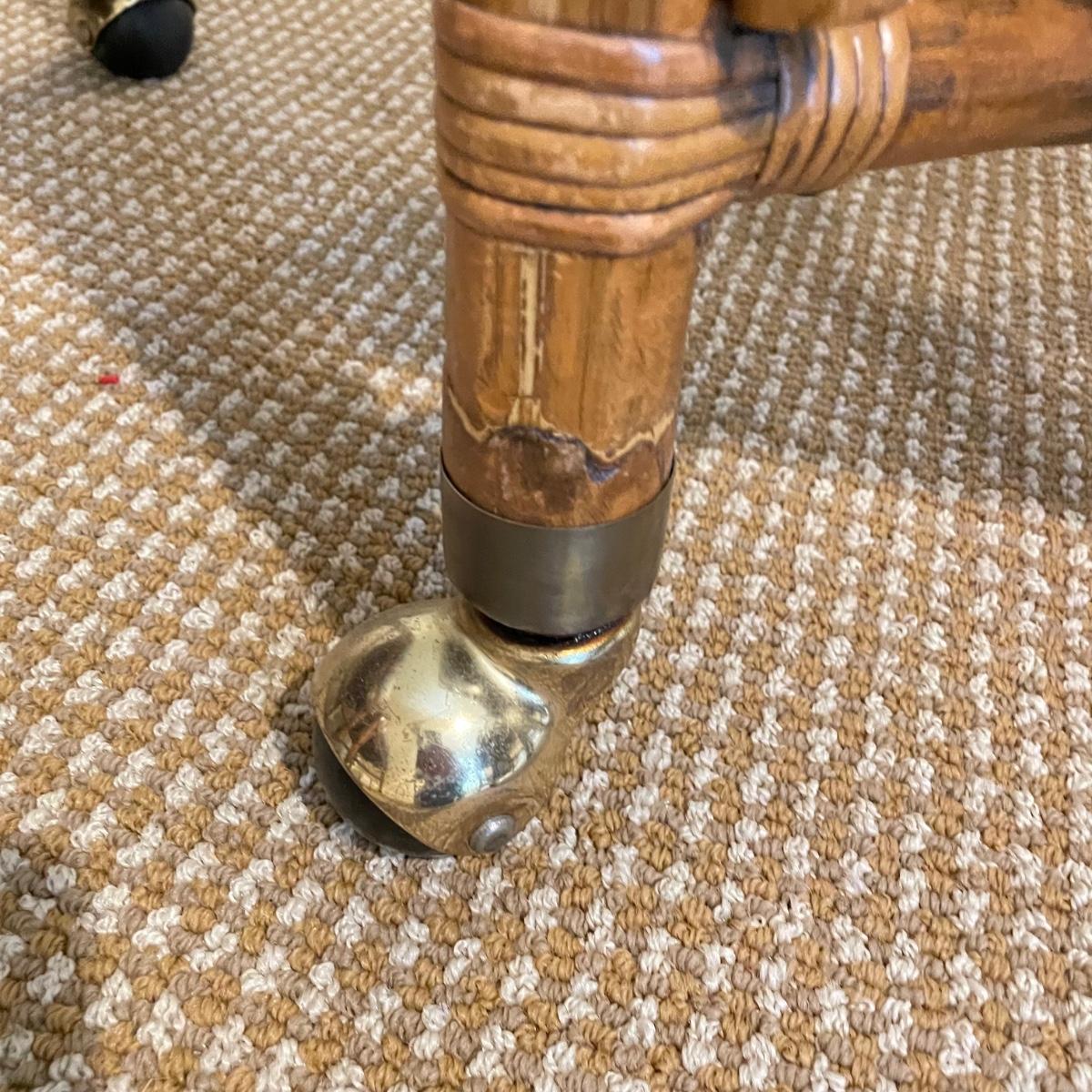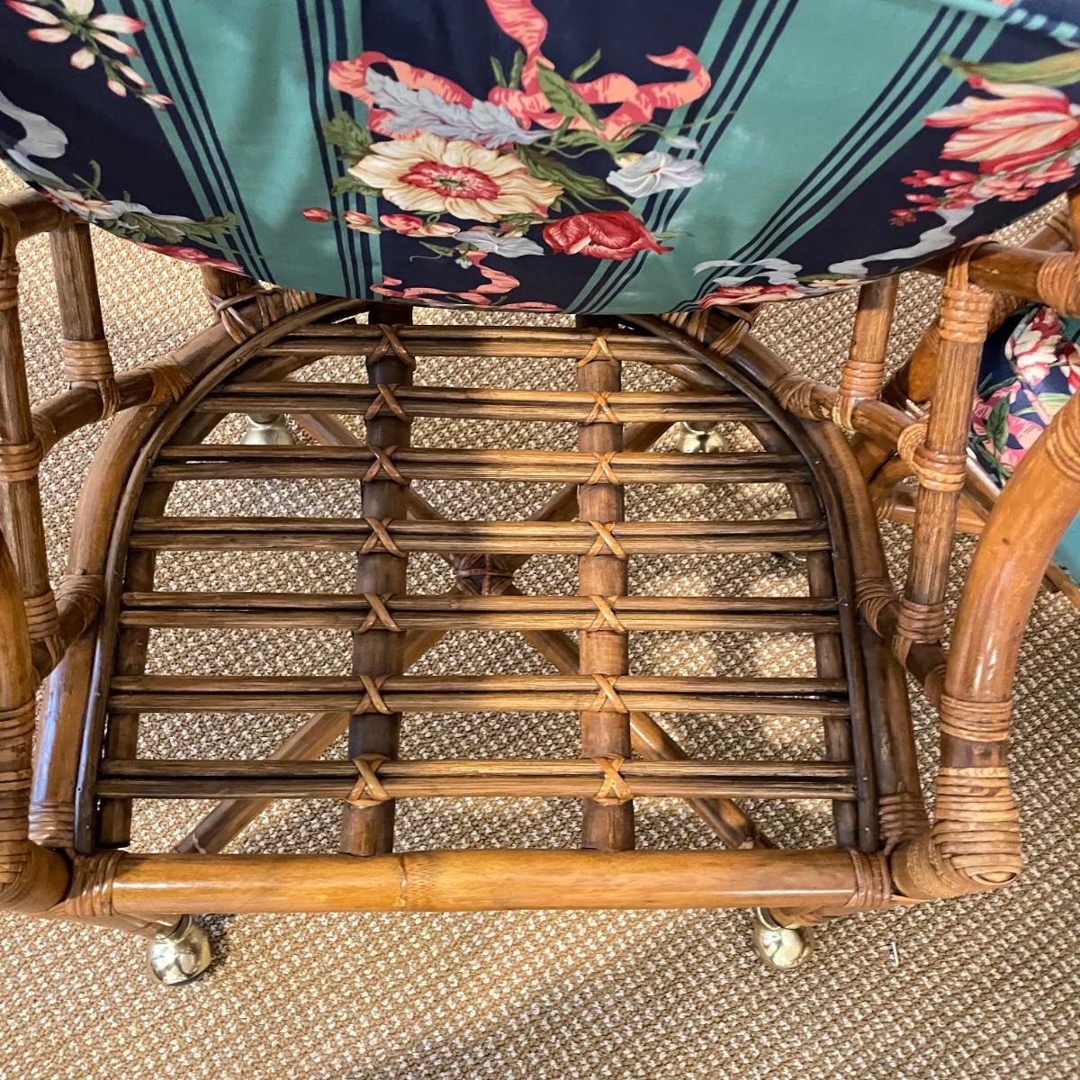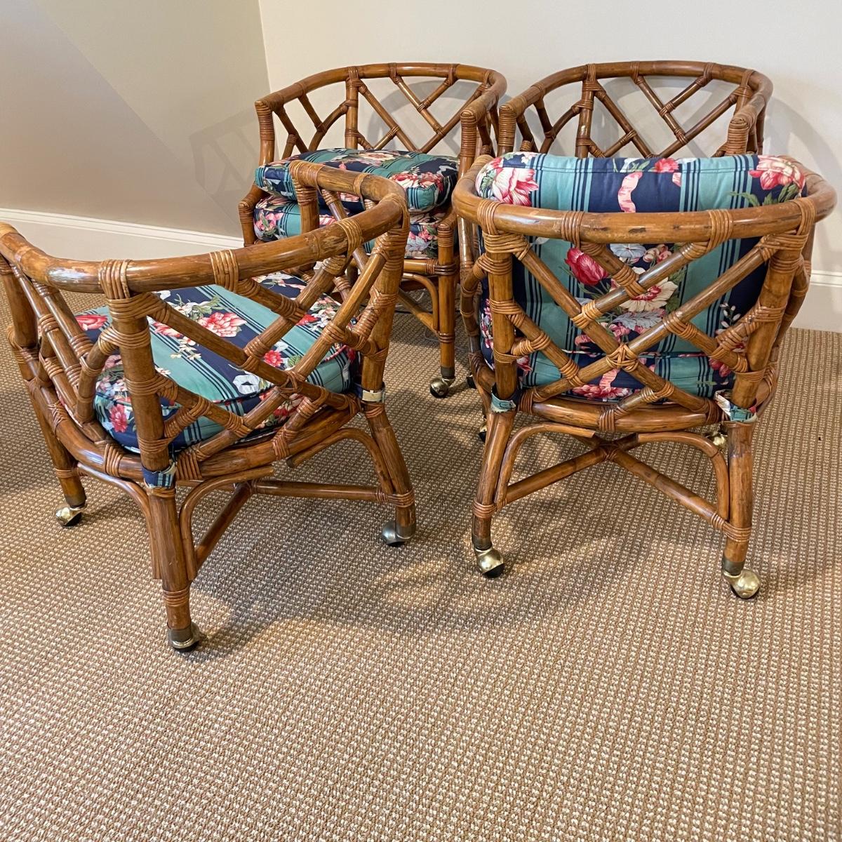 Four rolling bamboo-style chairs with floral cushions looking barely used. The barrel table with removable glass top measures 48”D x 29”H. Chairs measure 23”sq x 29”H. Pieces appear intentionally weathered with a glossy finish, although some minor blemishes are shown in photos. See images. Local pick up only. Winning bidder must bring assistance to help move and load this item due to its weight and/or size. Table and chairs are located up one flight of stairs.