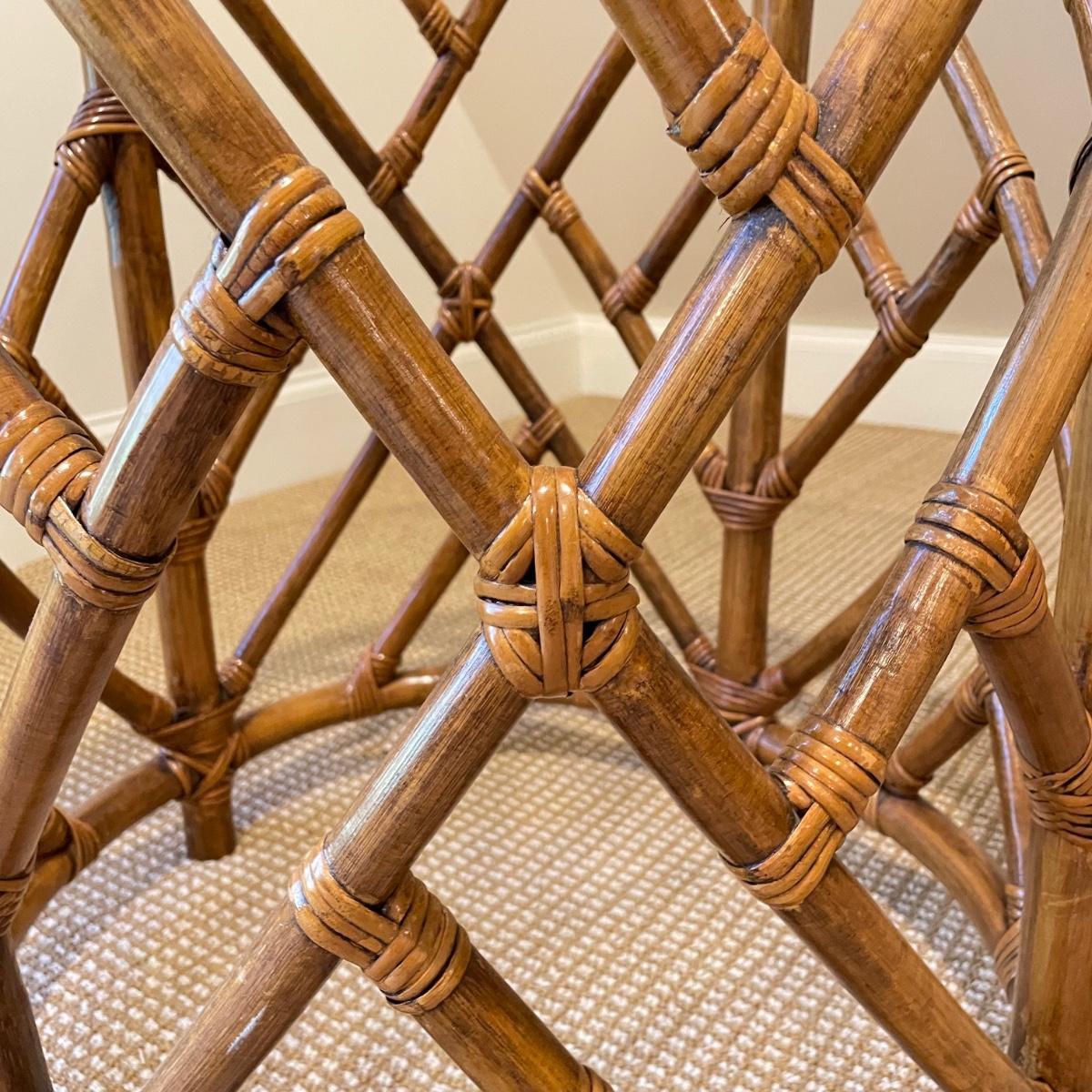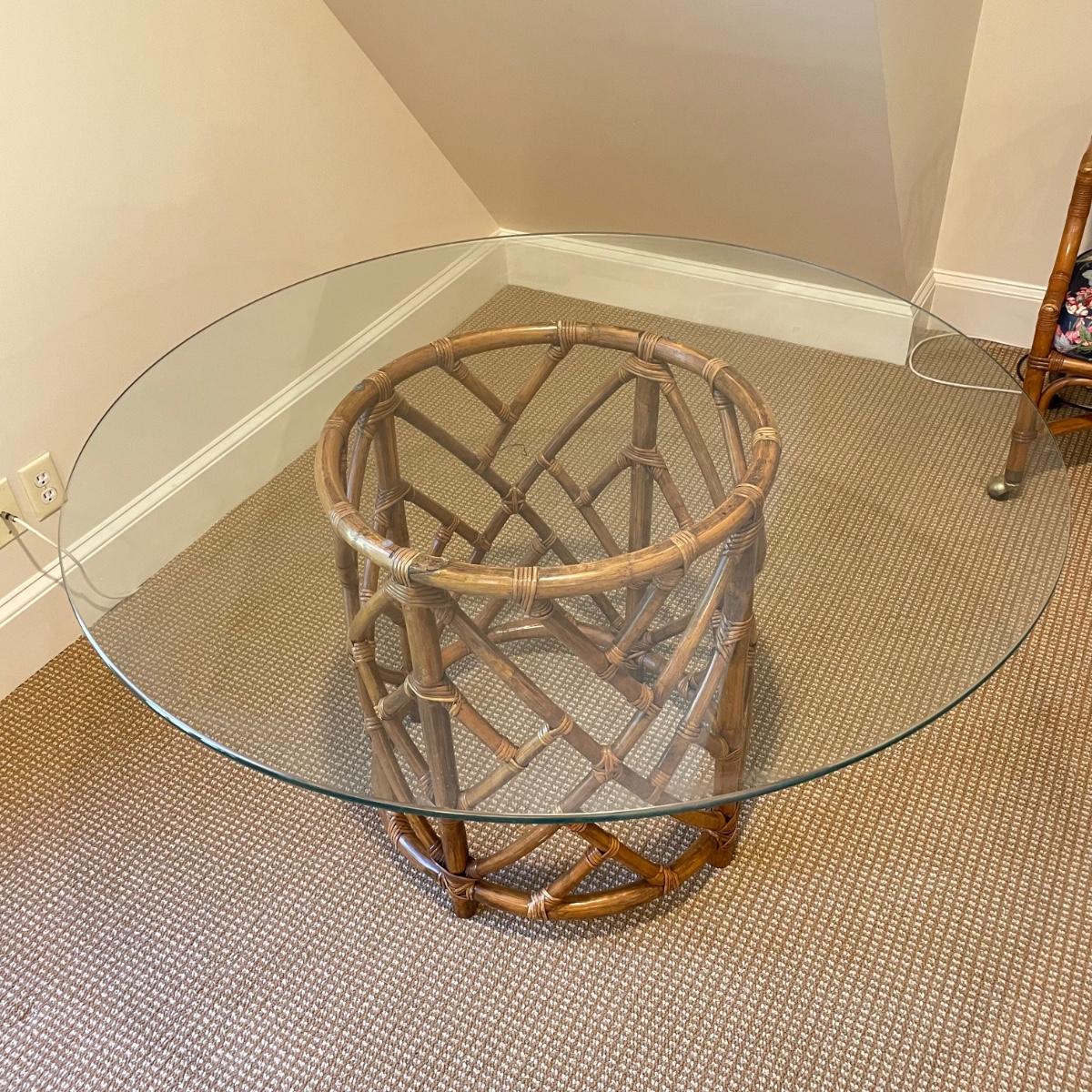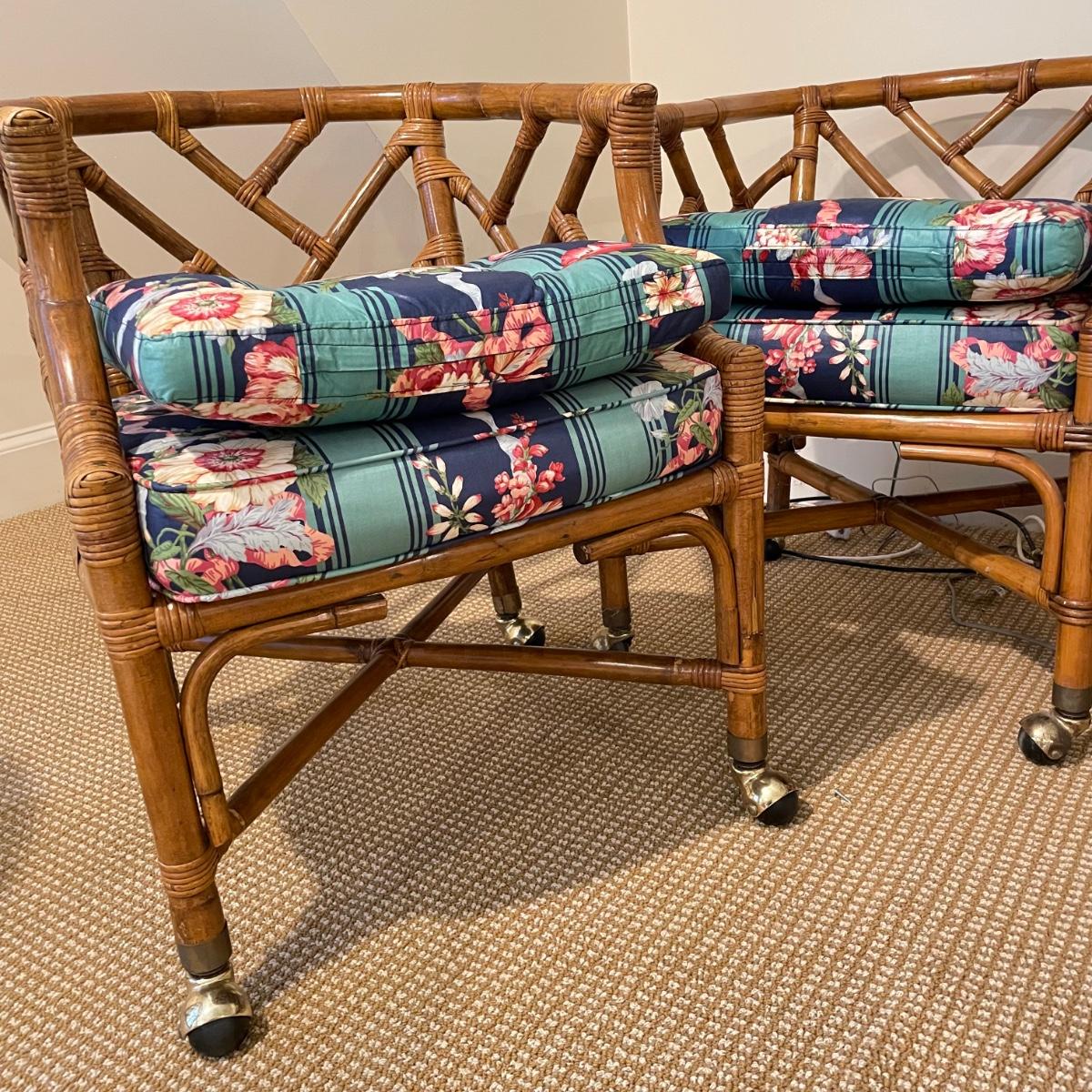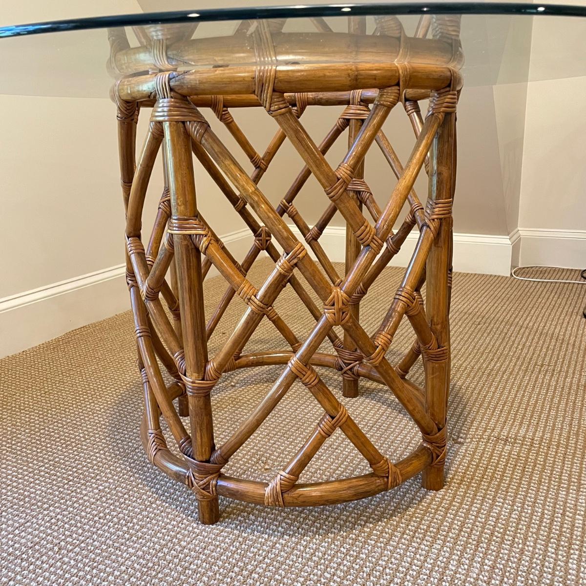 Four rolling bamboo-style chairs with floral cushions looking barely used. The barrel table with removable glass top measures 48”D x 29”H. Chairs measure 23”sq x 29”H. Pieces appear intentionally weathered with a glossy finish, although some minor blemishes are shown in photos. See images. Local pick up only. Winning bidder must bring assistance to help move and load this item due to its weight and/or size. Table and chairs are located up one flight of stairs.