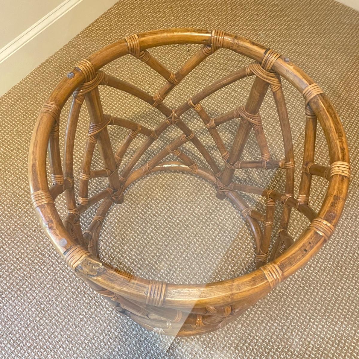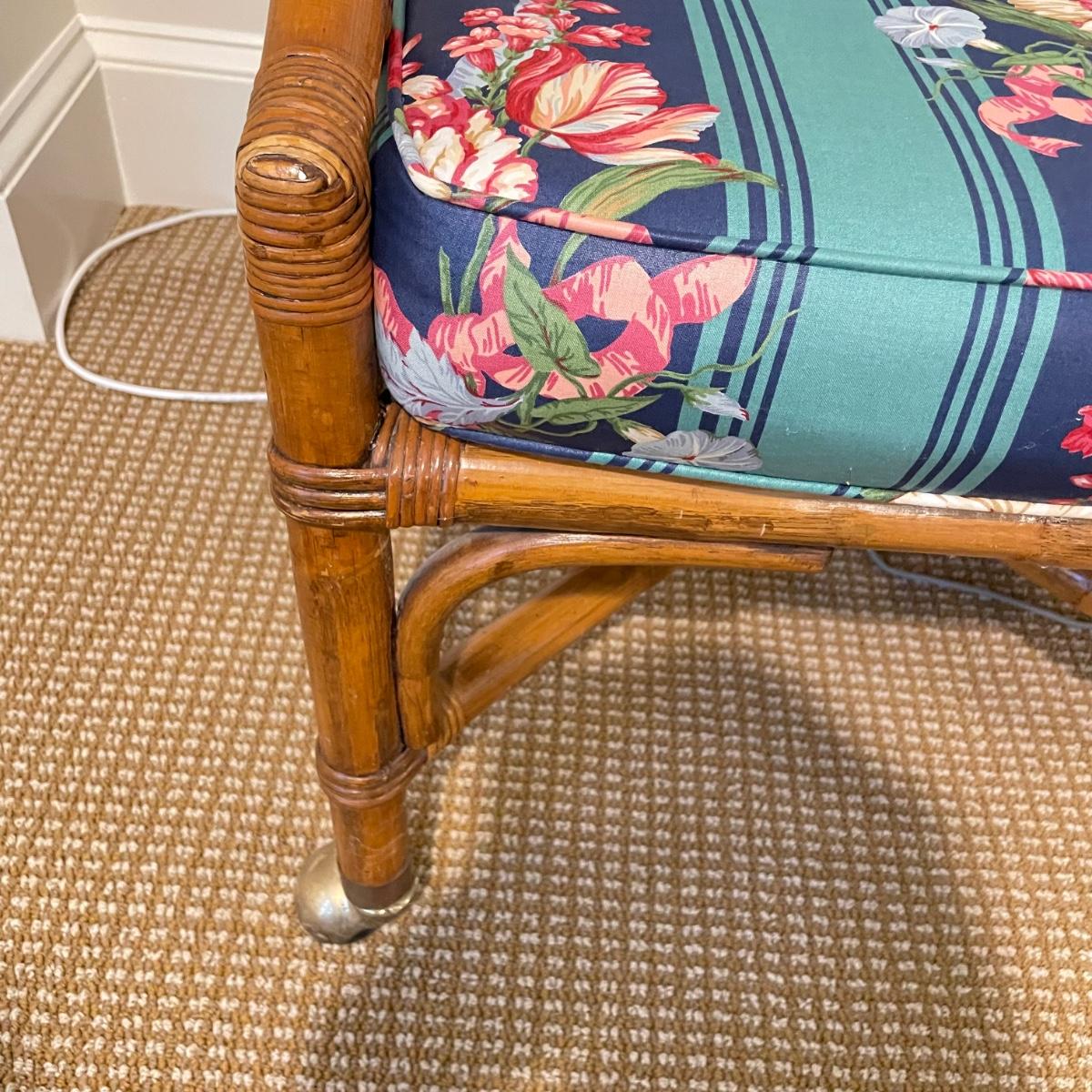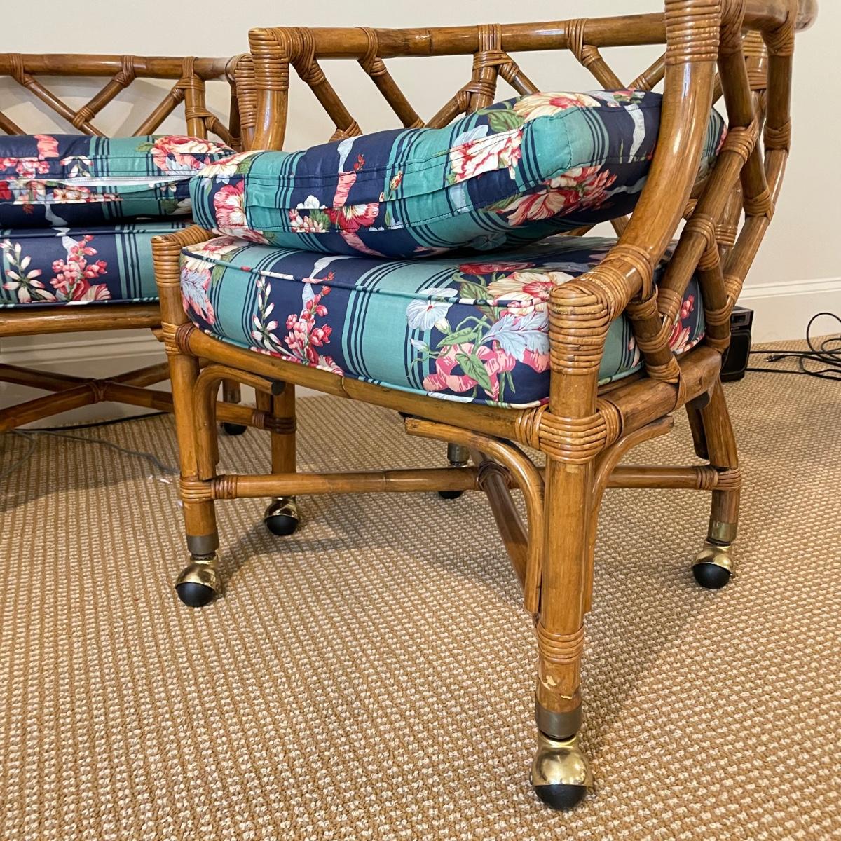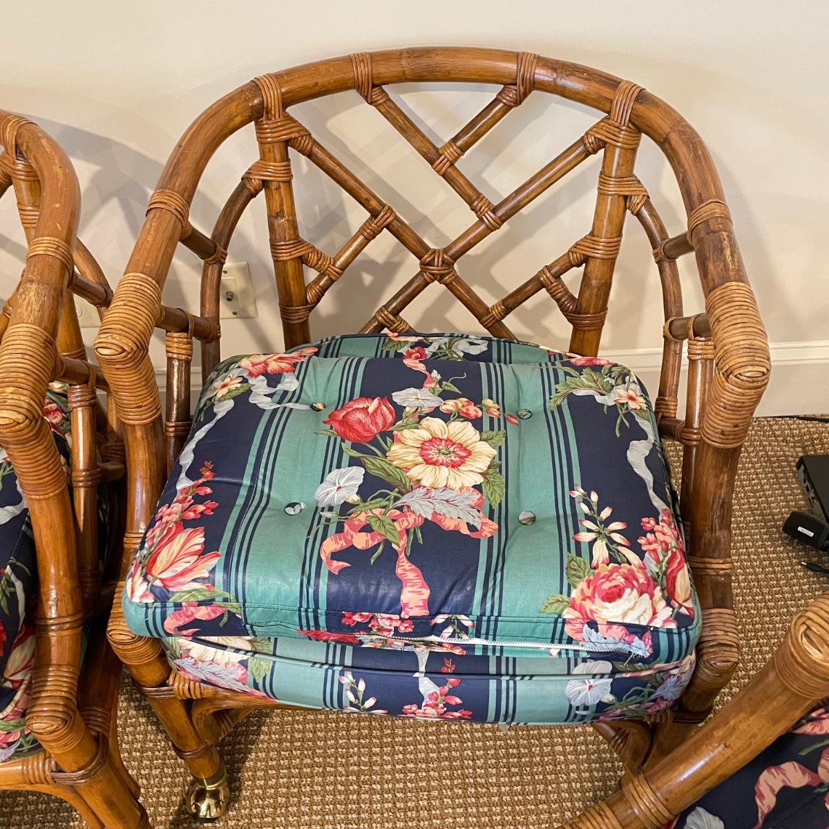 Four rolling bamboo-style chairs with floral cushions looking barely used. The barrel table with removable glass top measures 48”D x 29”H. Chairs measure 23”sq x 29”H. Pieces appear intentionally weathered with a glossy finish, although some minor blemishes are shown in photos. See images. Local pick up only. Winning bidder must bring assistance to help move and load this item due to its weight and/or size. Table and chairs are located up one flight of stairs.