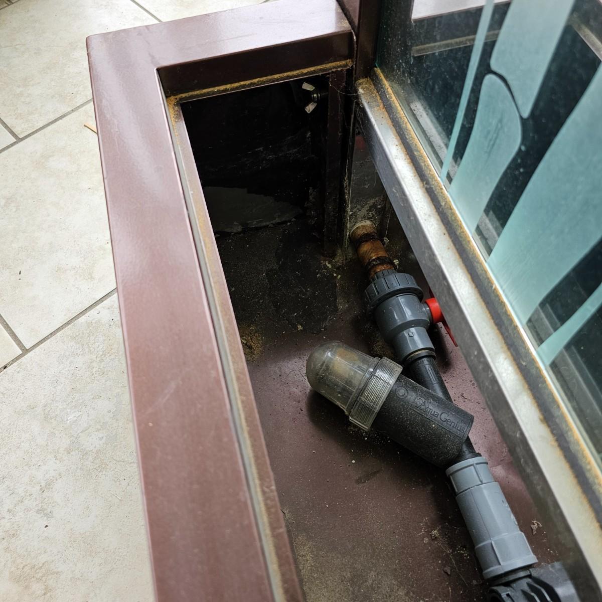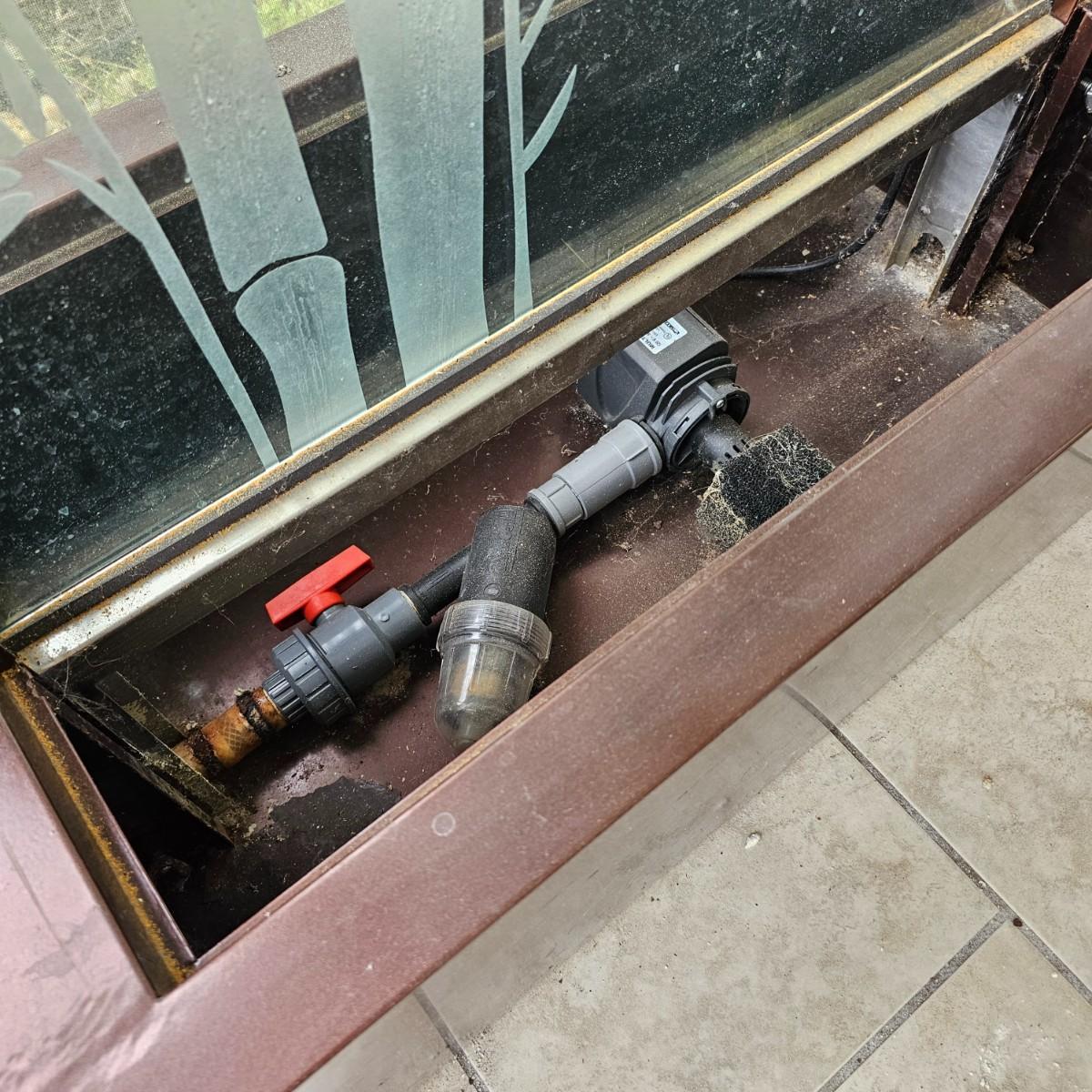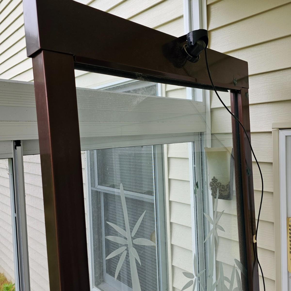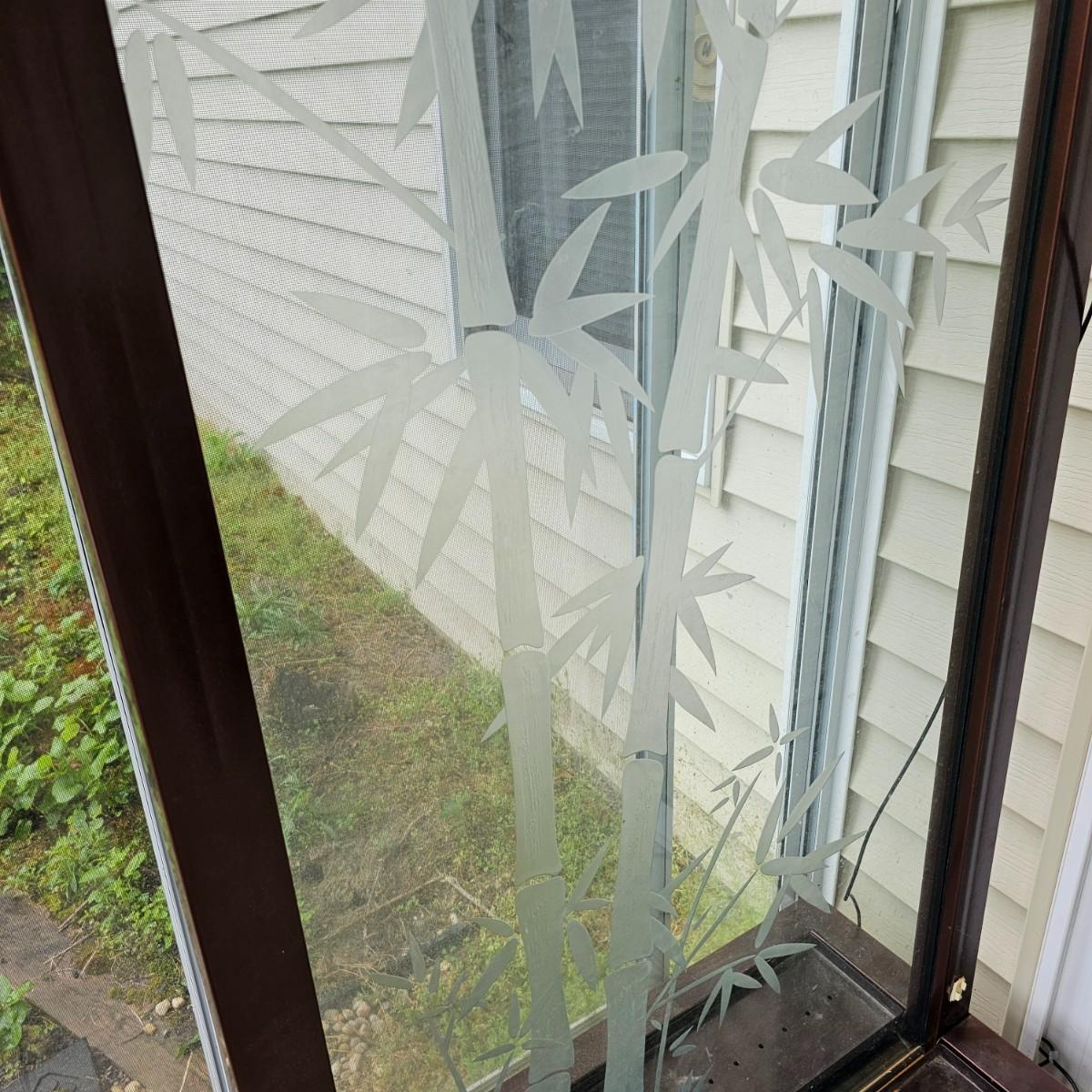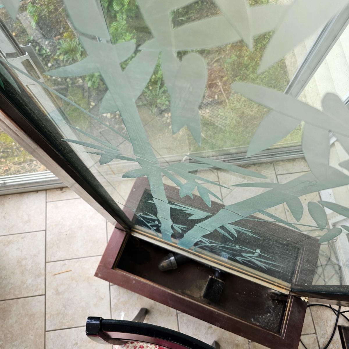 Etched glass bamboo theme panel in this decorative fountain. All metal frame and construction, this fountain would make a great accent piece in an entry or sunroom. Fountain measures 32"W x 18"D x 90"H, has removable panels at base top to access pump and piping underneath. Pump powered on when plugged in, but it was not tested with water in it. Small spotlight at top has cable but no power transformer. Some cleaning and spot fix on glass, appears to have adhesive on it. See photos for details. Local pickup only. Winning bidder must bring assistance to help move and load this item due to its weight and/or size.