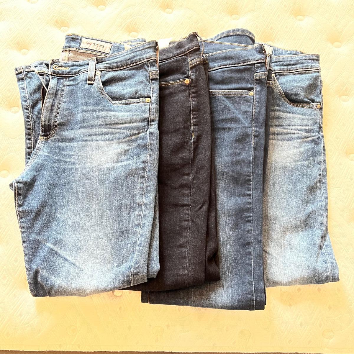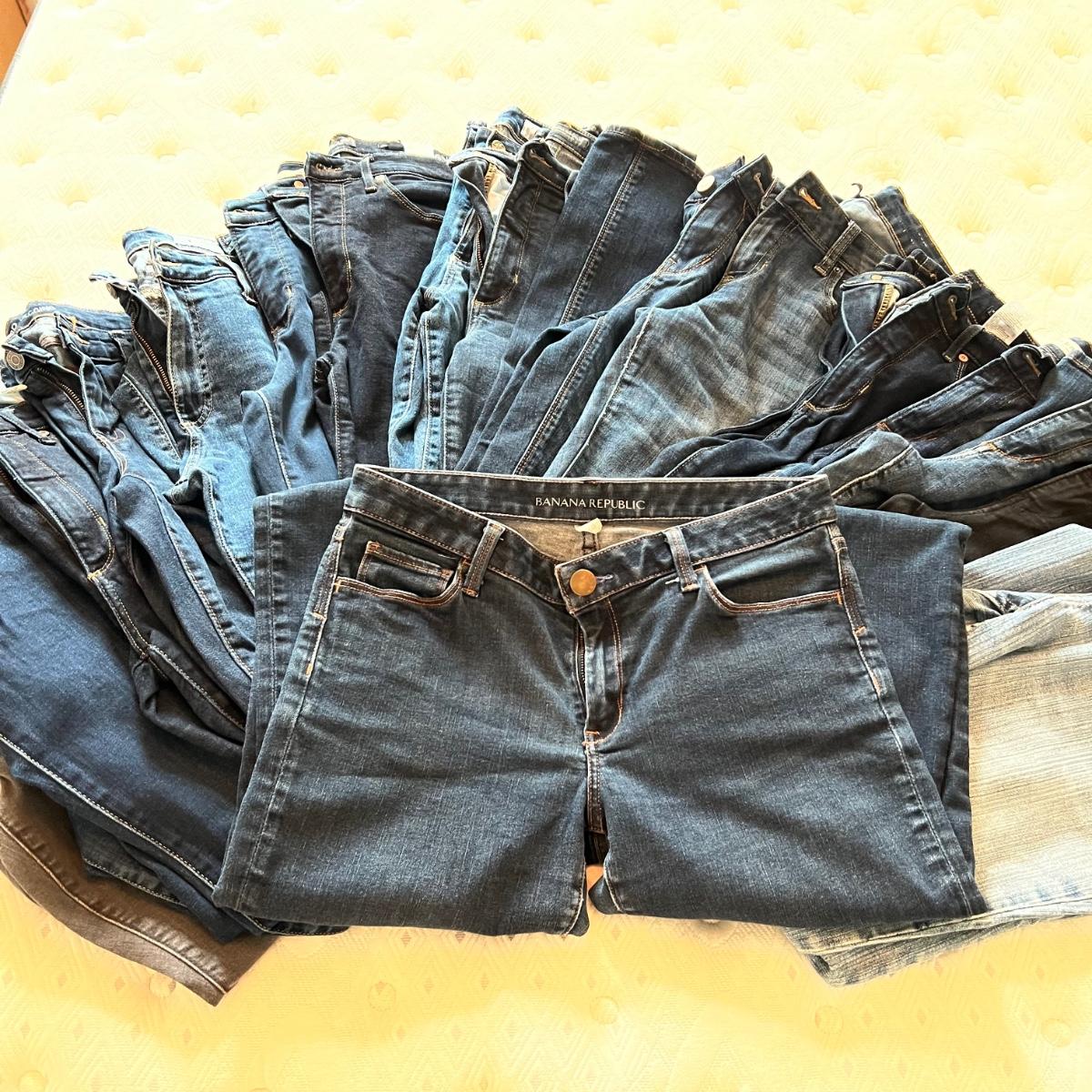 18 pairs of denim jeans in this large lot, all of which are in very good condition. Majority are size 8/29 Regular with a few pairs size 31R. Great brand names like Banana Republic, Levi’s and Gap. Jeans all appear to be mid to high rise. 8 pairs are Banana Republic, then a couple pairs each of Levi’s, Gap, AG-ED Denim and 1 pair of X2.
