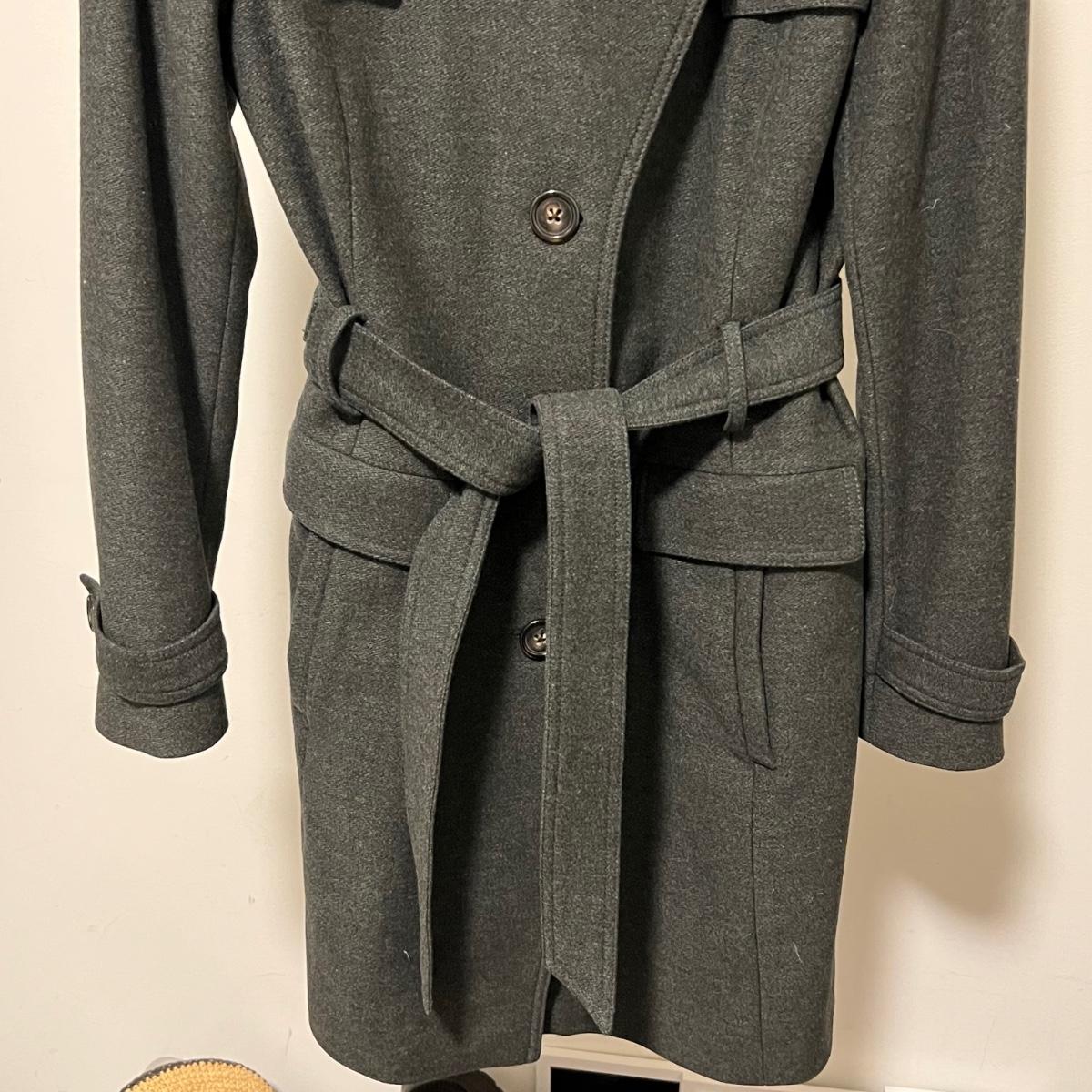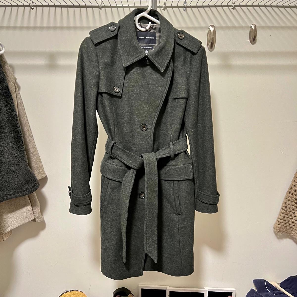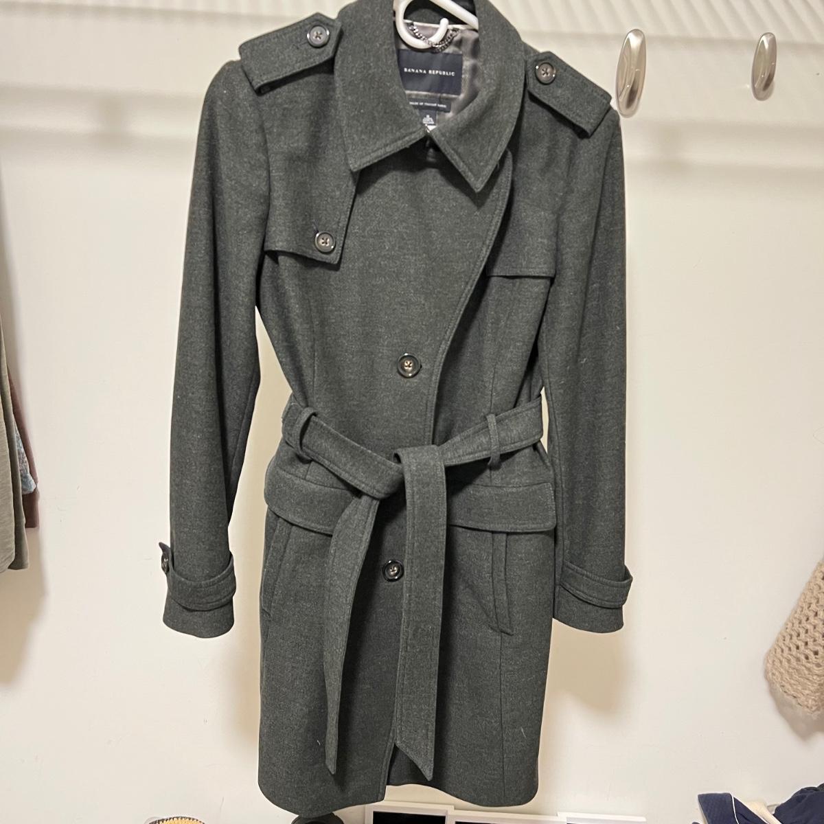 This lovely wool trench coat by Banana Republic is a dark charcoal grey with a dark gray nylon lining. Jacket is size medium and in excellent condition.