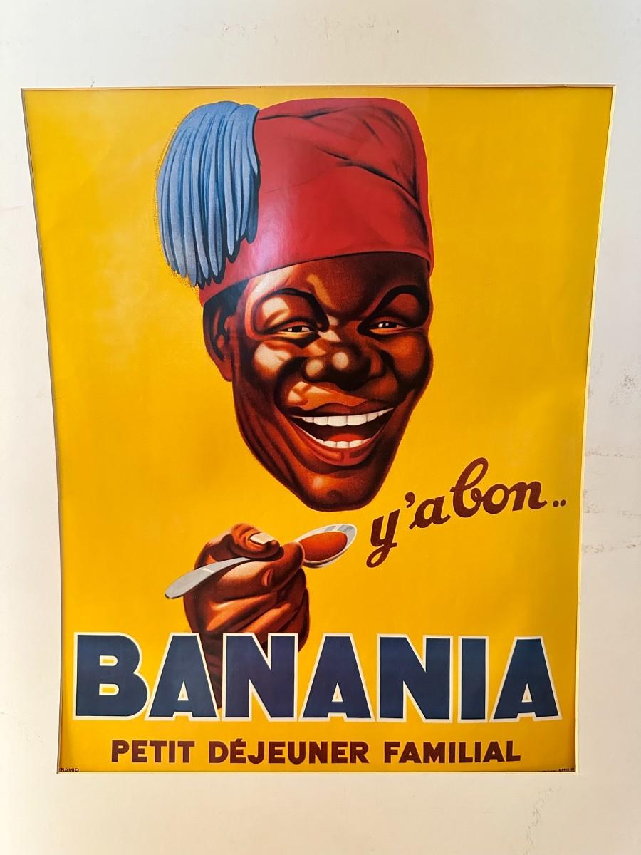 27.5" x 19.5" print says "y'abon.. Banania Petit Dejeuner Familial" no frame, mat has some smudges.