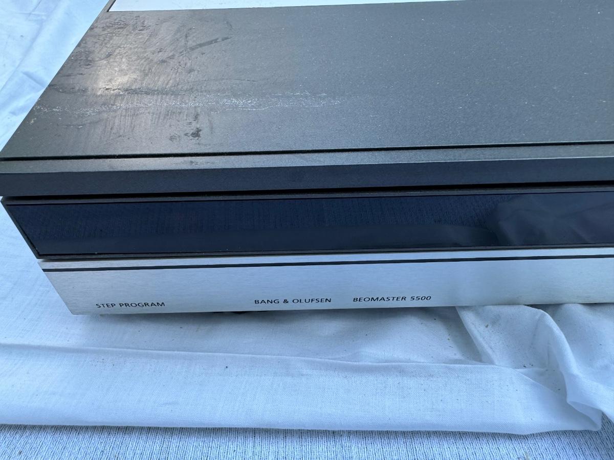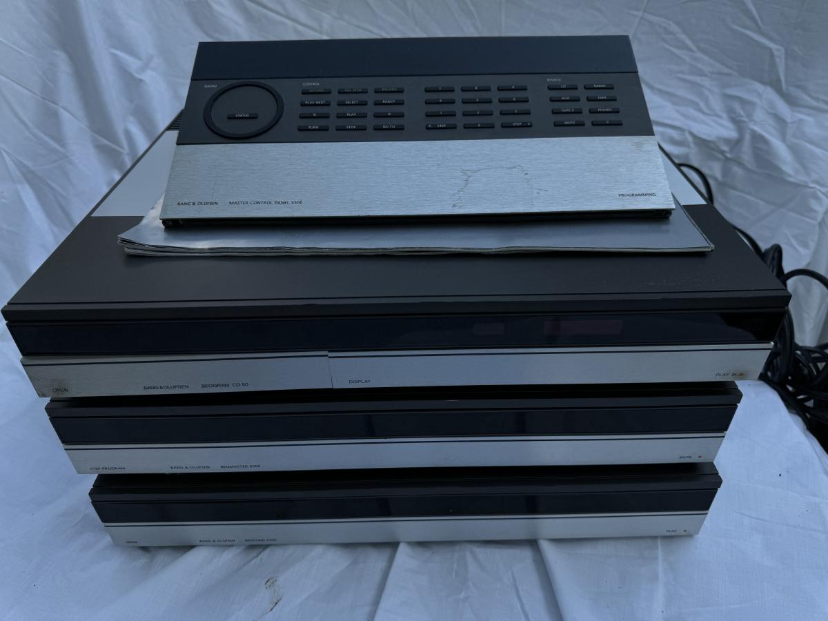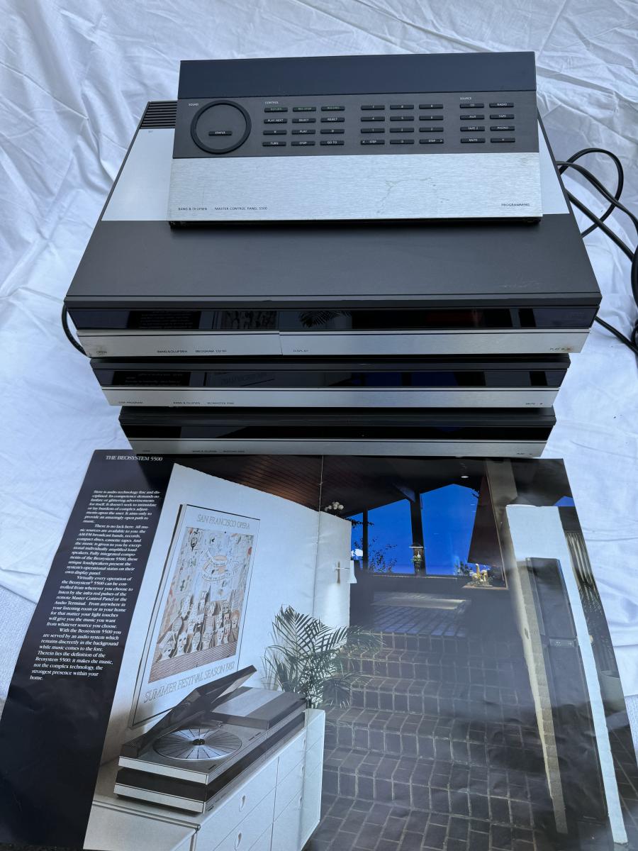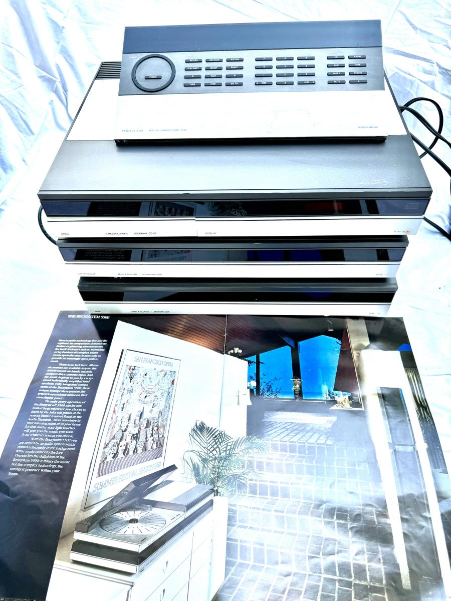 Buying as is, as found in this wonderful estate. See MANY PHOTOS for content, condition and dimensions. Never a Buyers Premiums or Credit Card Fee. All lots start at just $10 and sell with No Reserve to the highest bidder. Bang & Olufsen 5500 Series - Total Four Pieces; Master Control Panel 5500, Beogram CD 50, Step Program Beomaster 5500 Receiver, Beocord 5500 Cassette Player. *Powers On