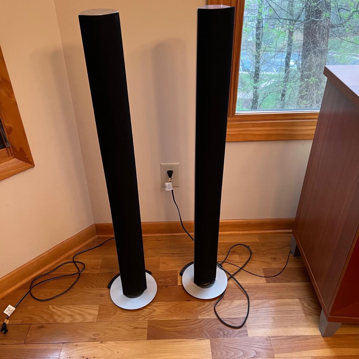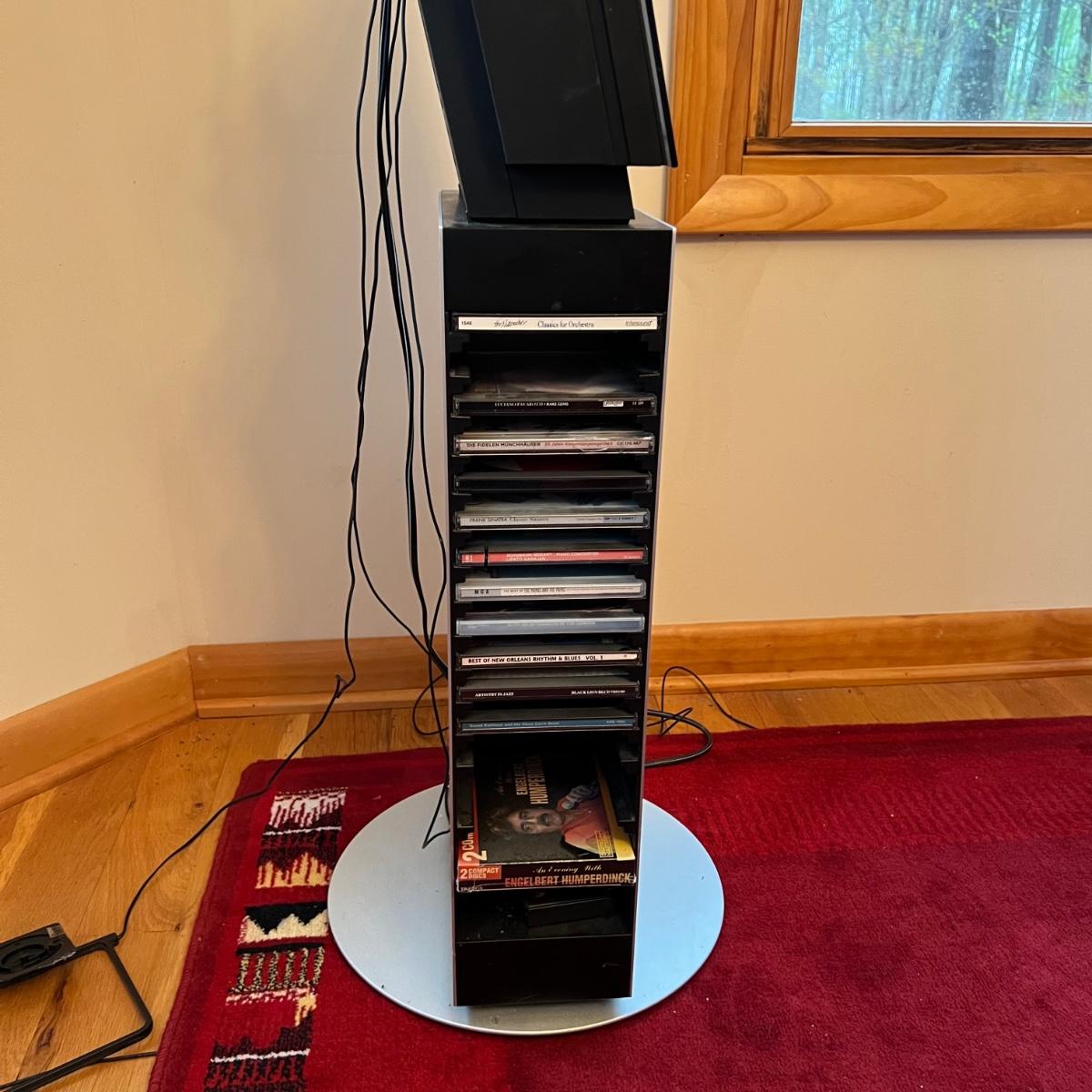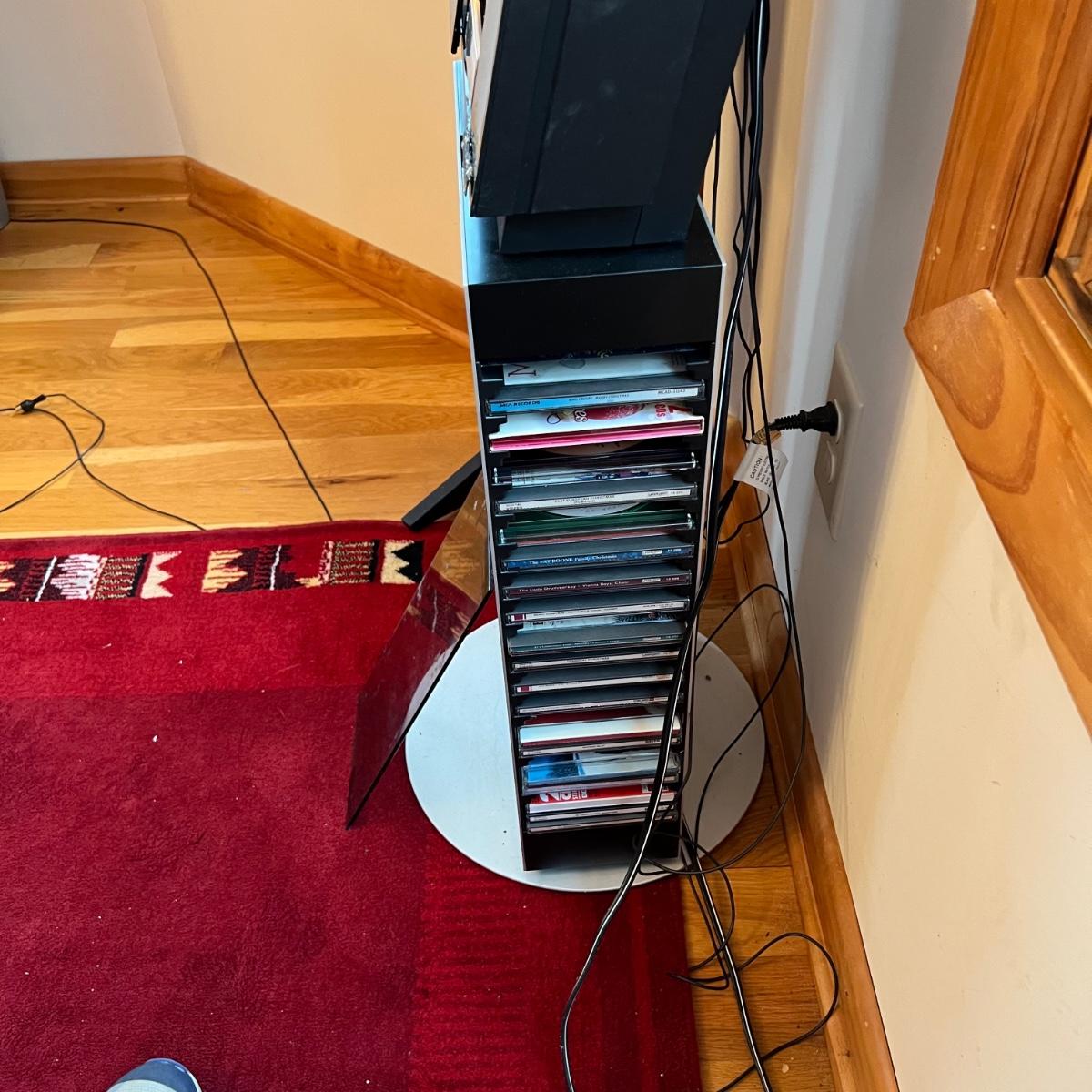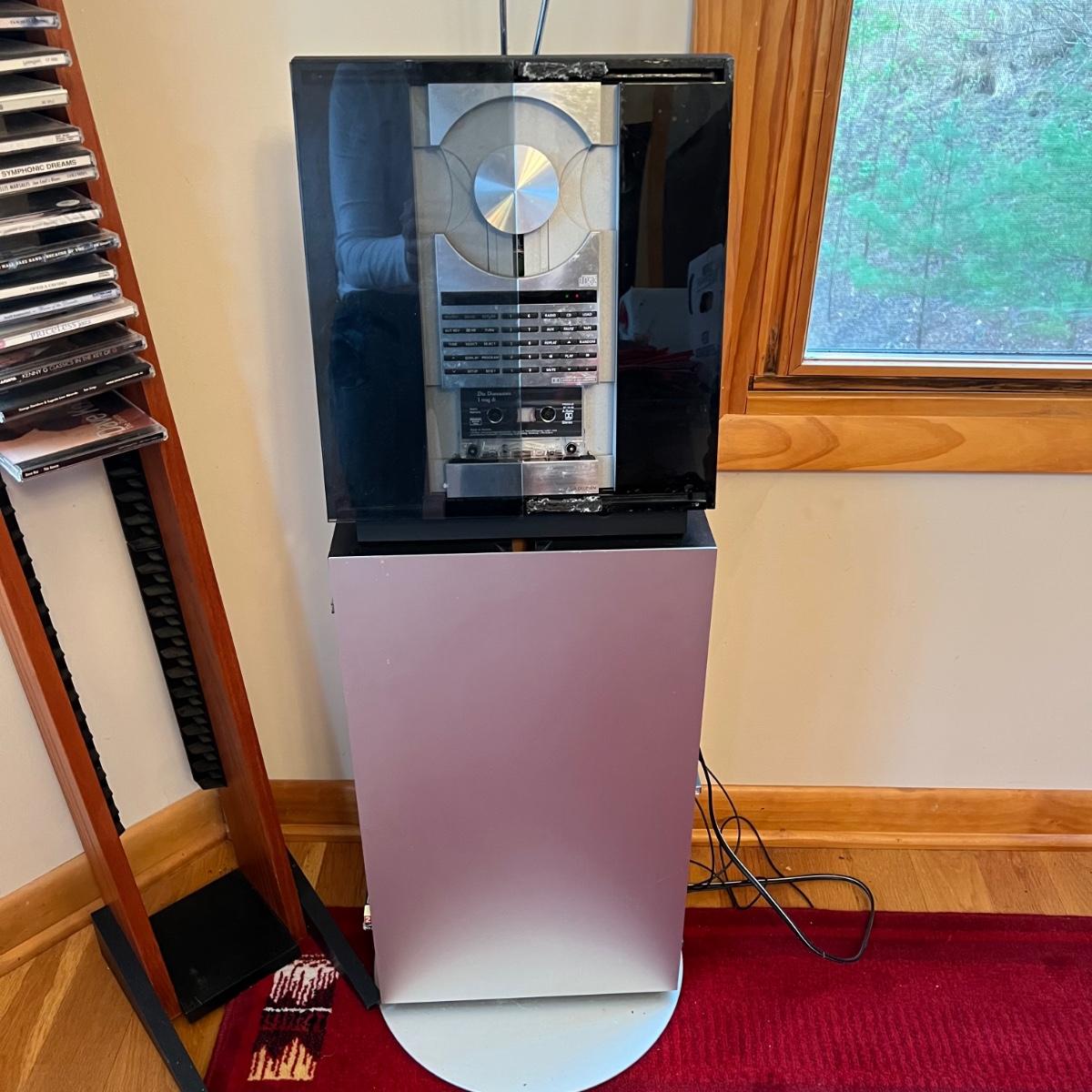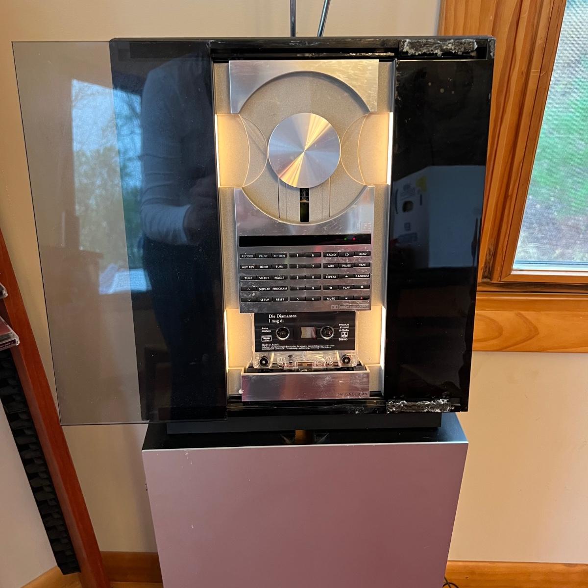 Bang & Olufsen cd, cassette, and radio. Also includes stand that the unit sits on as well as a large CD tower and two speakers. Unit and remote control powered on when plugged in. The speakers measure 11.75” x 5.25” x 38”H. The unit on the stand (includes CDs) measures 4.5” x 3” x 43.5”H and the CD tower measures 7” x 2.5” x 58”H. The front of the unit itself is covered by two glass panels that move left to right with the wave of a hand. The right panel is available but needs to be glued back onto the unit itself, glass panel photographed.