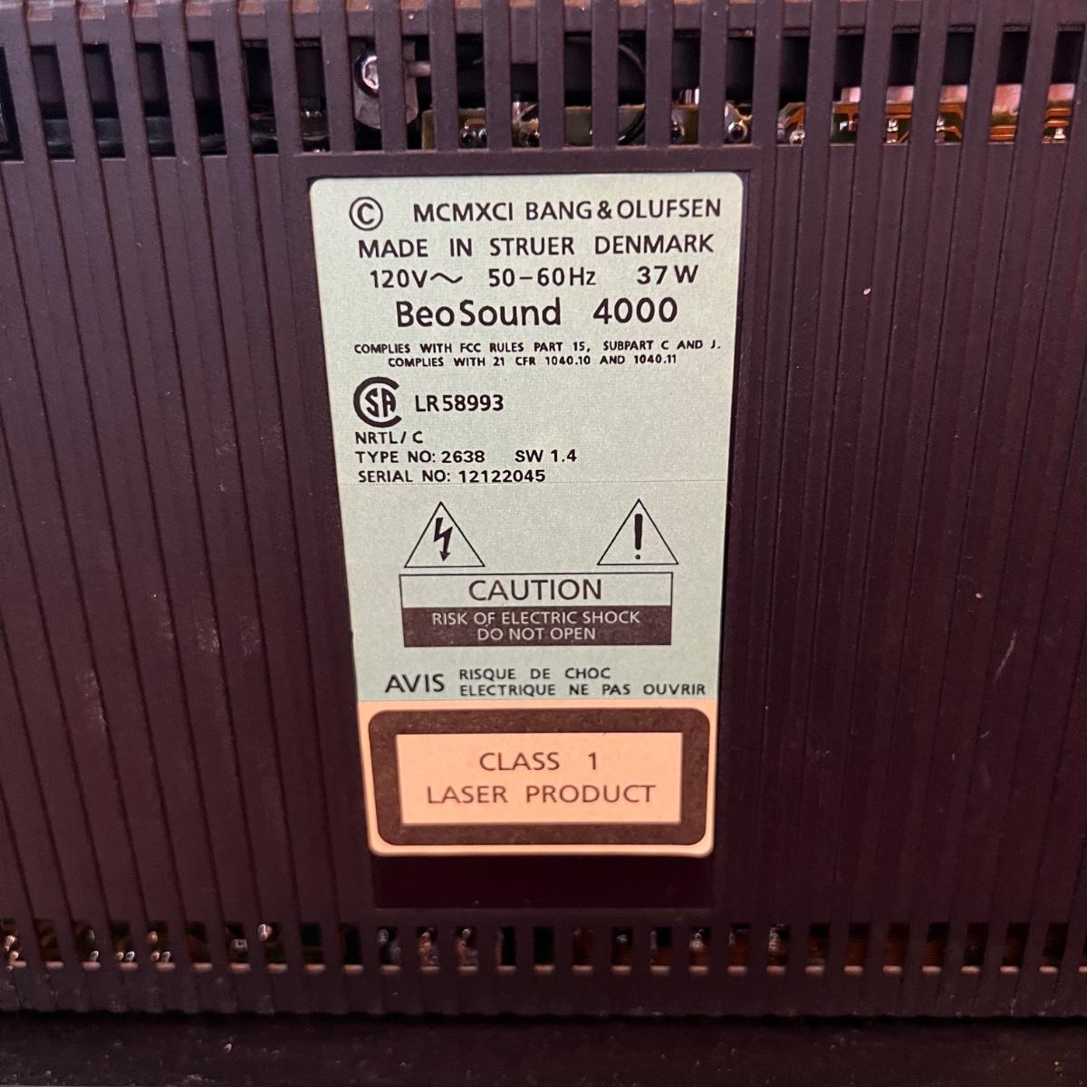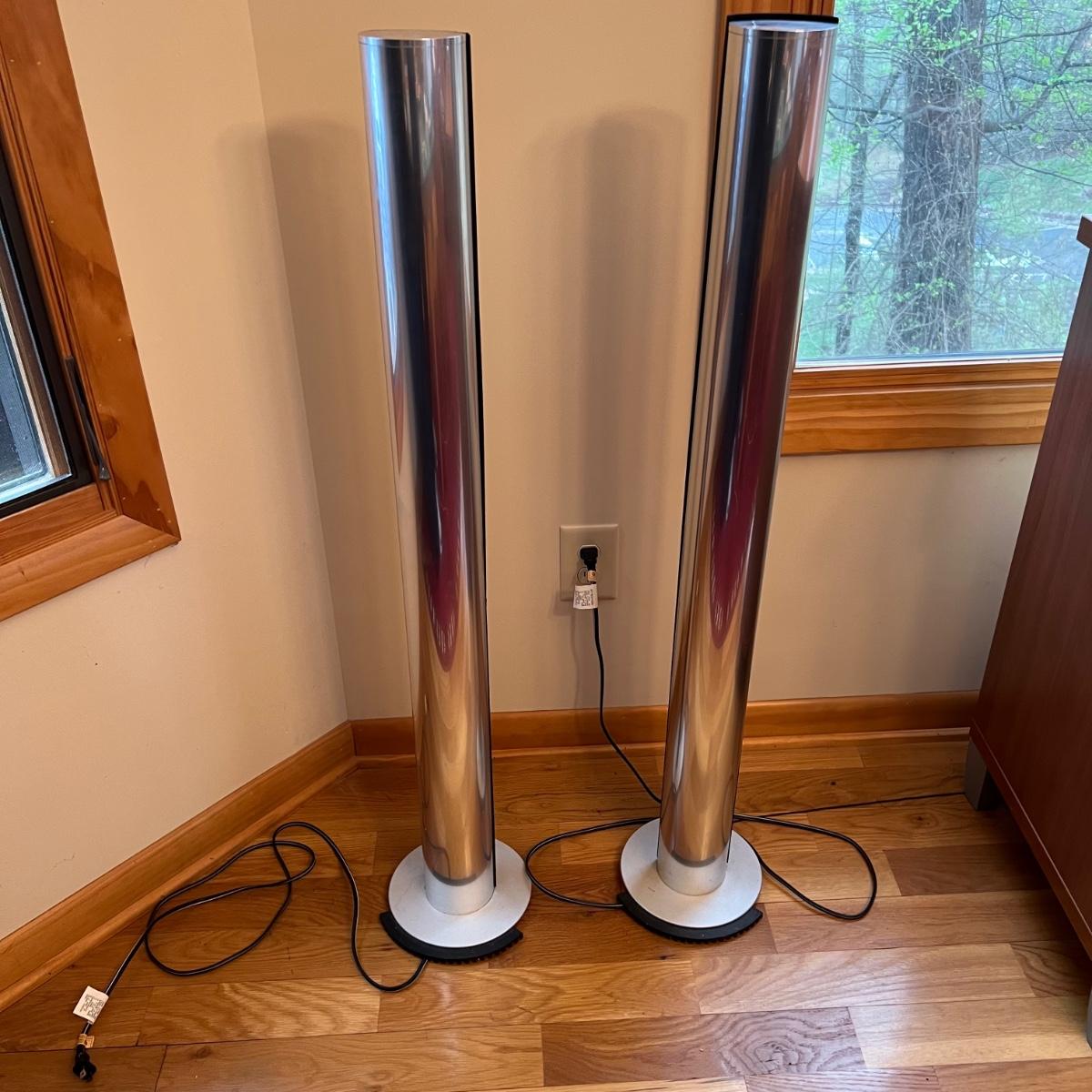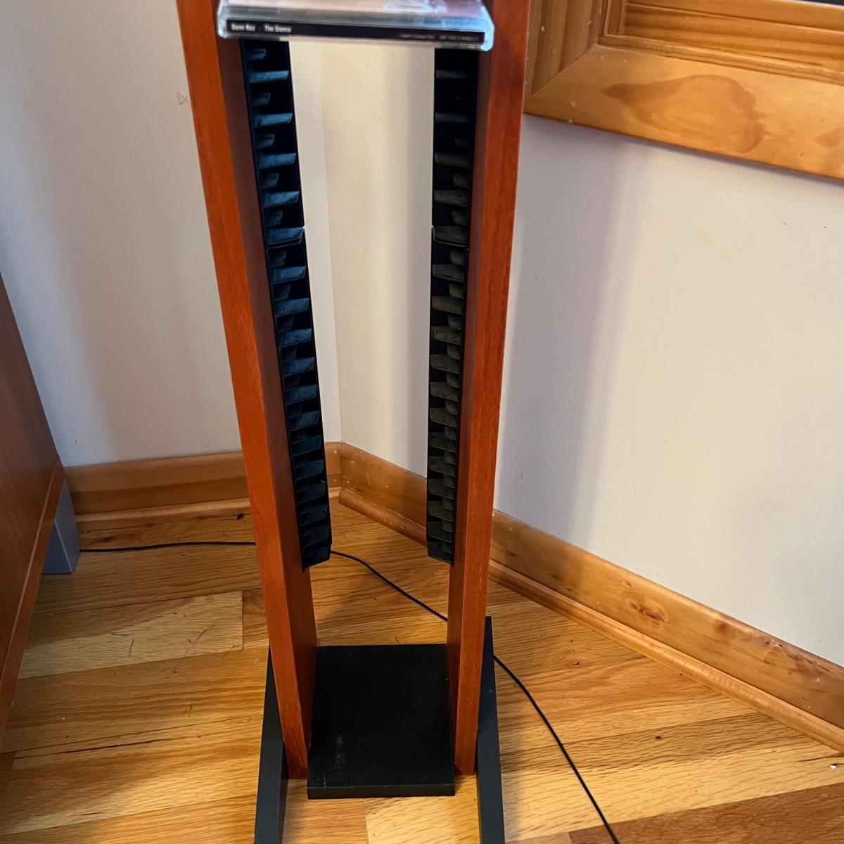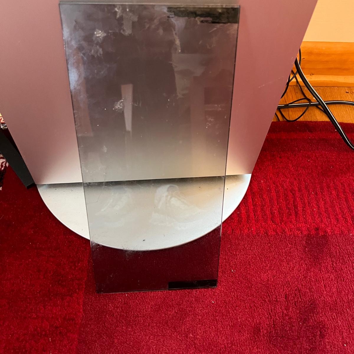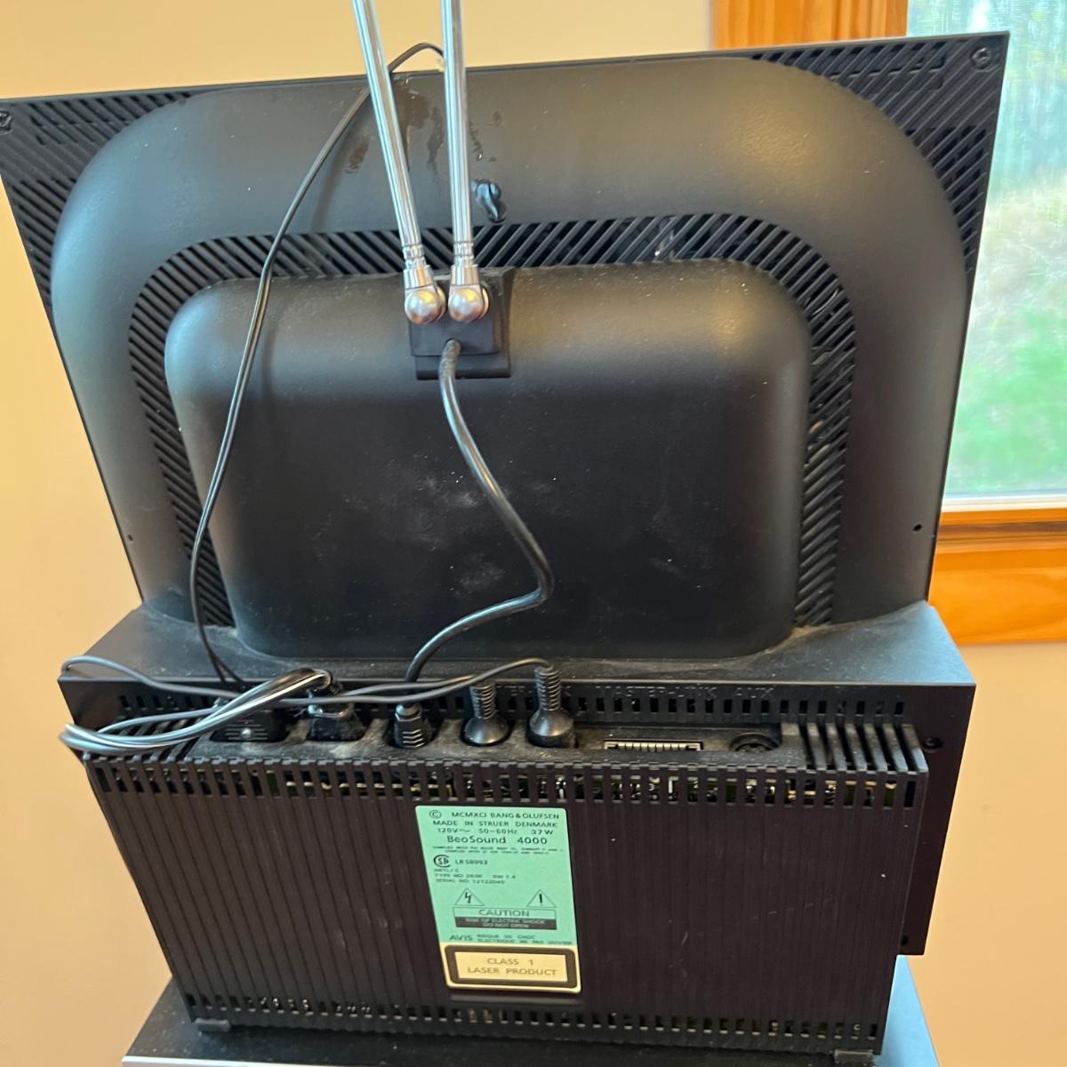 Bang & Olufsen cd, cassette, and radio. Also includes stand that the unit sits on as well as a large CD tower and two speakers. Unit and remote control powered on when plugged in. The speakers measure 11.75” x 5.25” x 38”H. The unit on the stand (includes CDs) measures 4.5” x 3” x 43.5”H and the CD tower measures 7” x 2.5” x 58”H. The front of the unit itself is covered by two glass panels that move left to right with the wave of a hand. The right panel is available but needs to be glued back onto the unit itself, glass panel photographed.