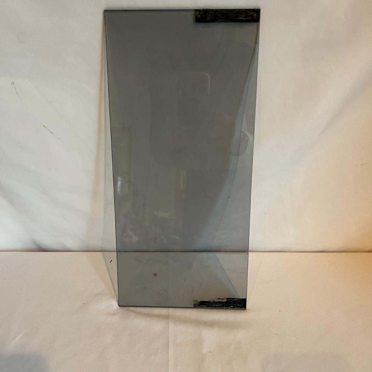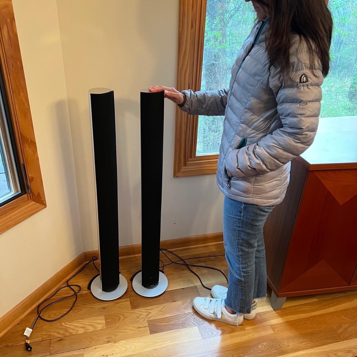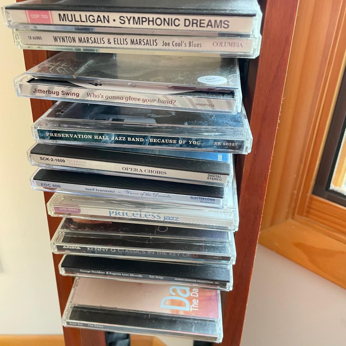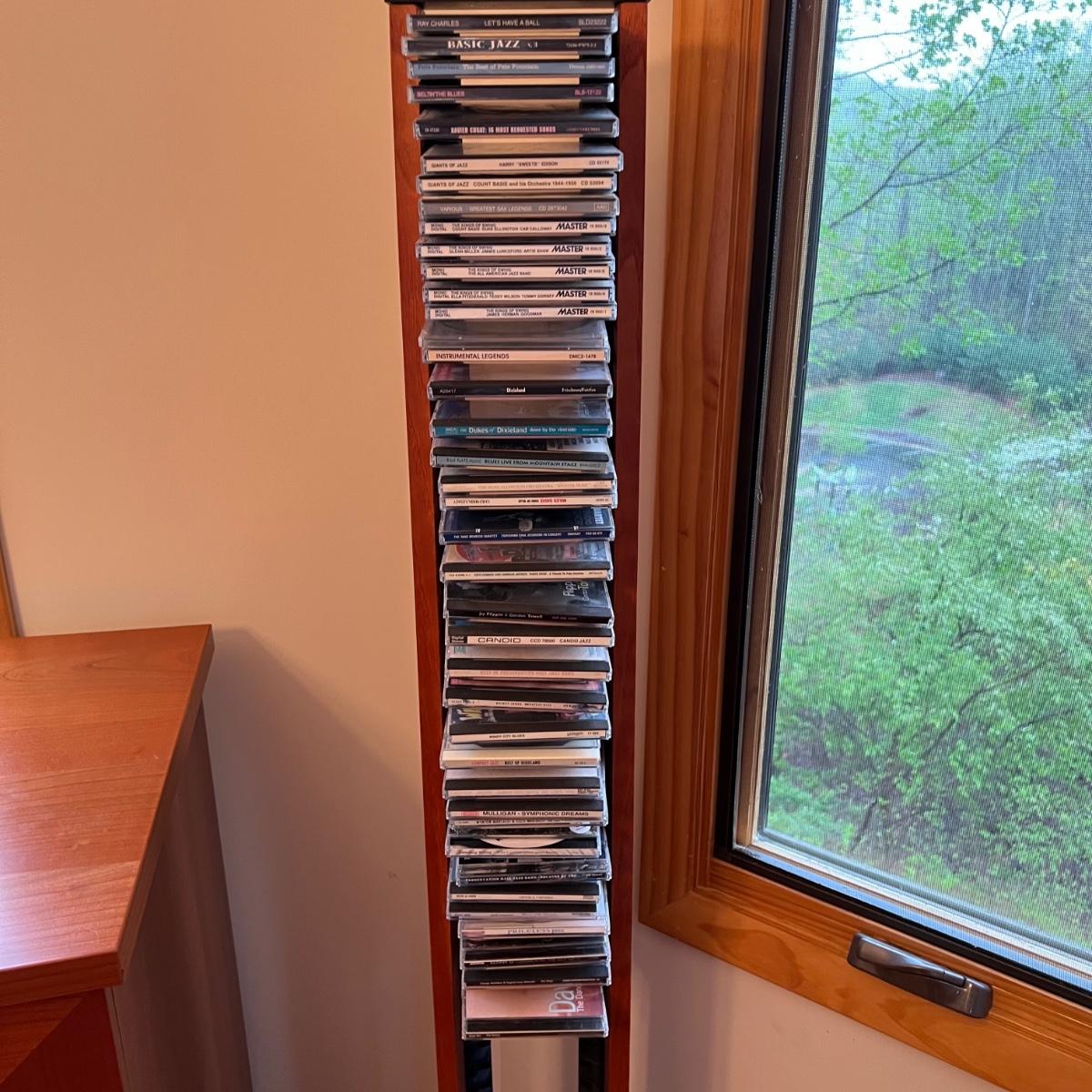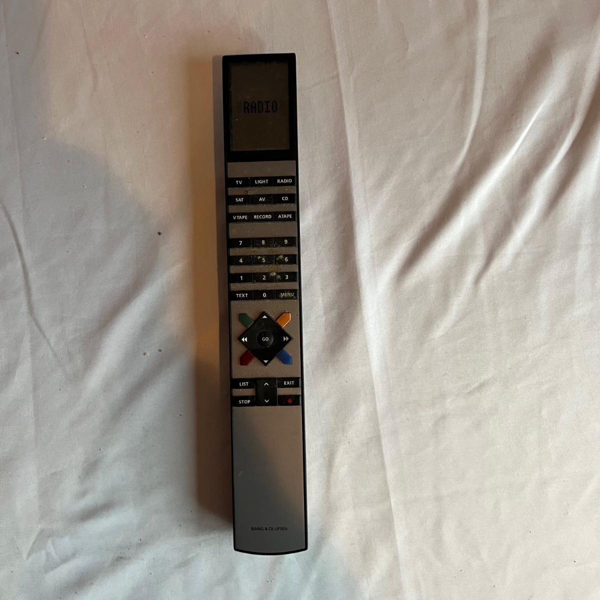 Bang & Olufsen cd, cassette, and radio. Also includes stand that the unit sits on as well as a large CD tower and two speakers. Unit and remote control powered on when plugged in. The speakers measure 11.75” x 5.25” x 38”H. The unit on the stand (includes CDs) measures 4.5” x 3” x 43.5”H and the CD tower measures 7” x 2.5” x 58”H. The front of the unit itself is covered by two glass panels that move left to right with the wave of a hand. The right panel is available but needs to be glued back onto the unit itself, glass panel photographed.