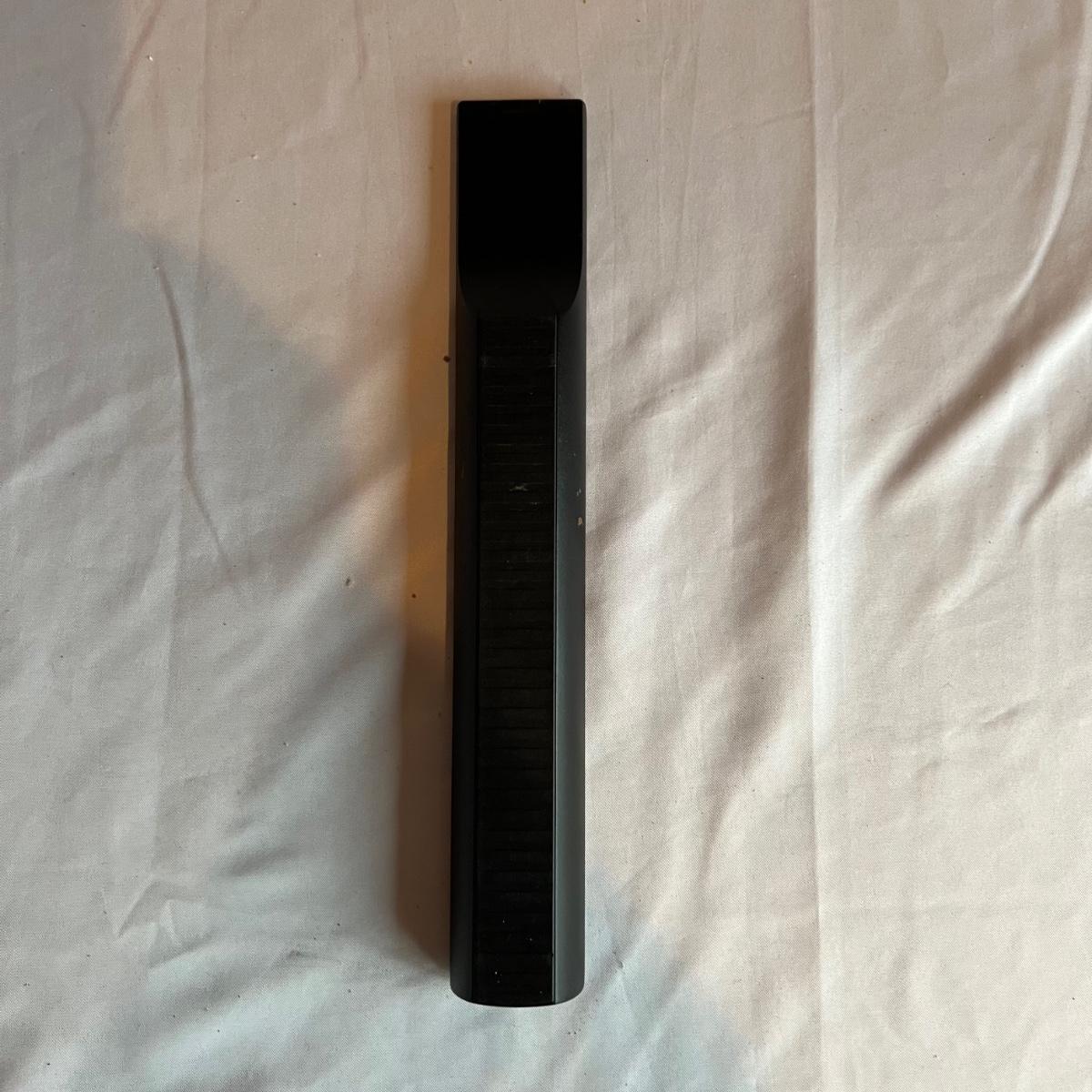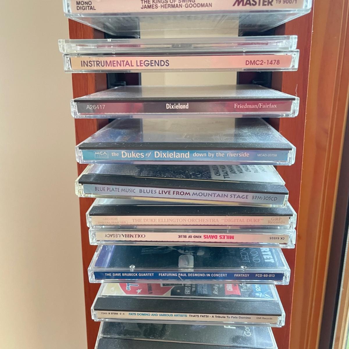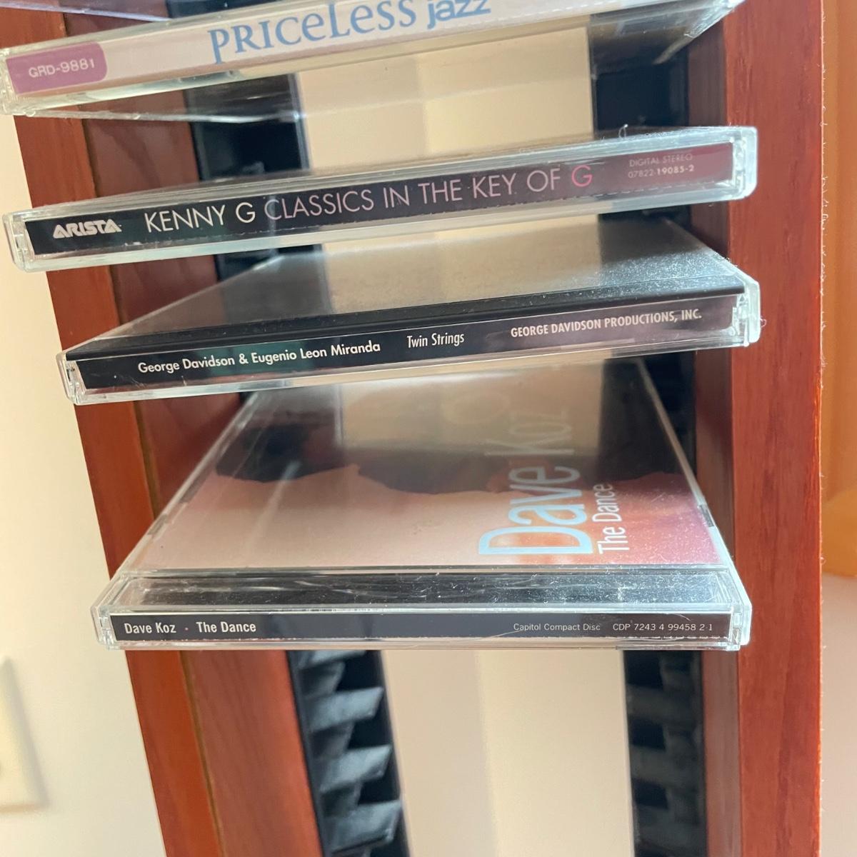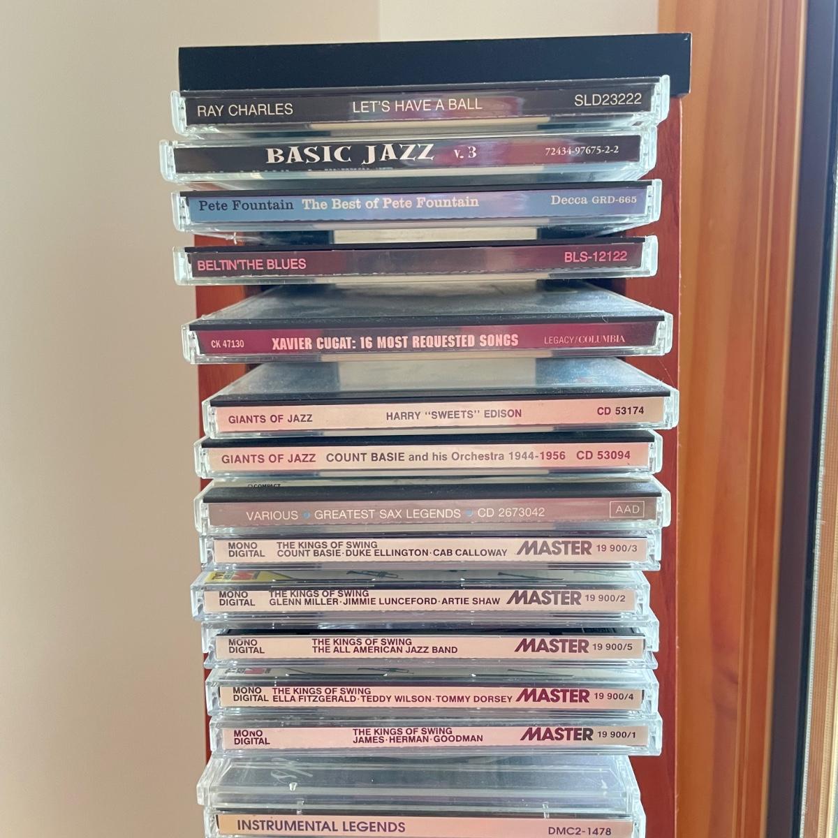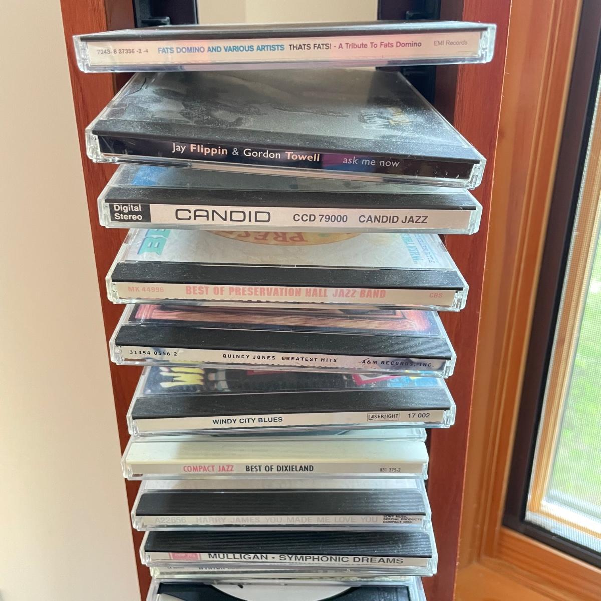 Bang & Olufsen cd, cassette, and radio. Also includes stand that the unit sits on as well as a large CD tower and two speakers. Unit and remote control powered on when plugged in. The speakers measure 11.75” x 5.25” x 38”H. The unit on the stand (includes CDs) measures 4.5” x 3” x 43.5”H and the CD tower measures 7” x 2.5” x 58”H. The front of the unit itself is covered by two glass panels that move left to right with the wave of a hand. The right panel is available but needs to be glued back onto the unit itself, glass panel photographed.