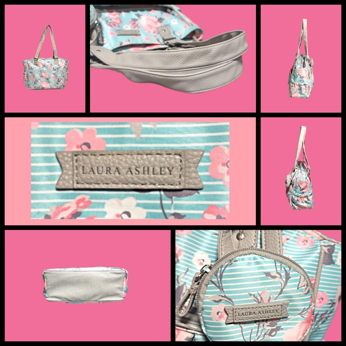 - Laura Ashley Diaper Bag: Green/Pink/White Floral pattern, assorted internal & external pockets, pacifier holder, diaper changing pad & wet bag 15.5"L x 12"H x 6"W with a 12" Strap Drop (new)