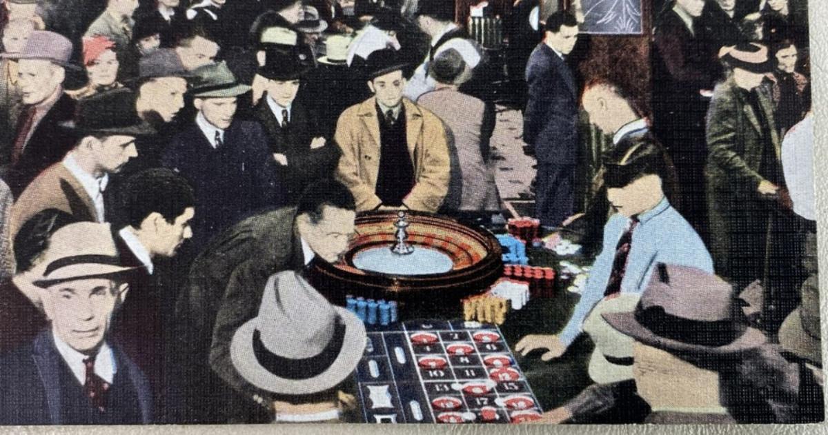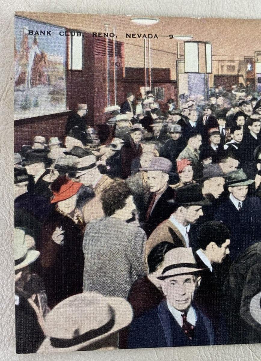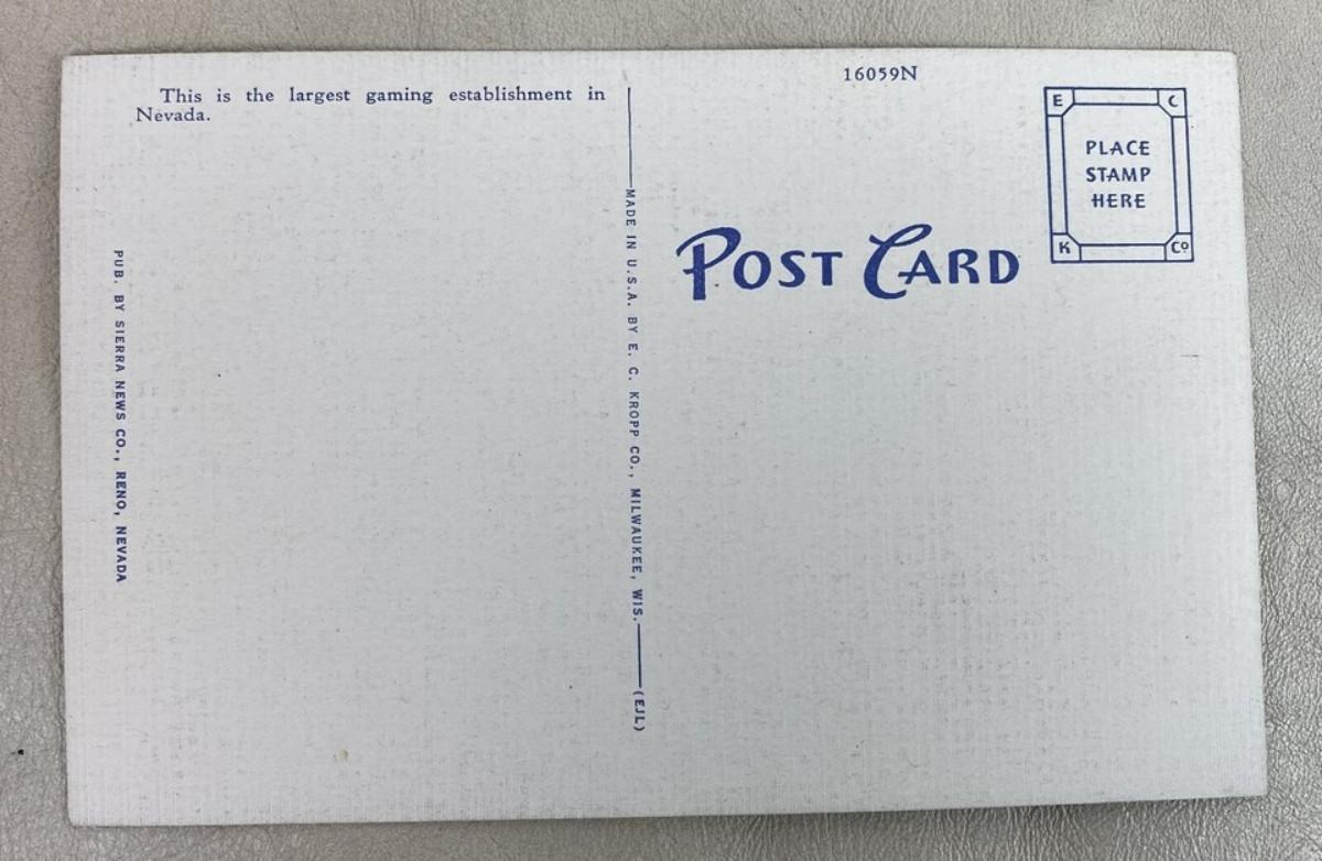 original fine-linen, tinted photo postcard from the infamous Bank Club of Reno, Nevada...the second casino to receive a gaming license after the state made gambling legal in 1931..touted as the largest casino in Nevada...Standard size 3.5 x 5.5"..by E.C. Kropp Publishing...Unposted..Fine condition.