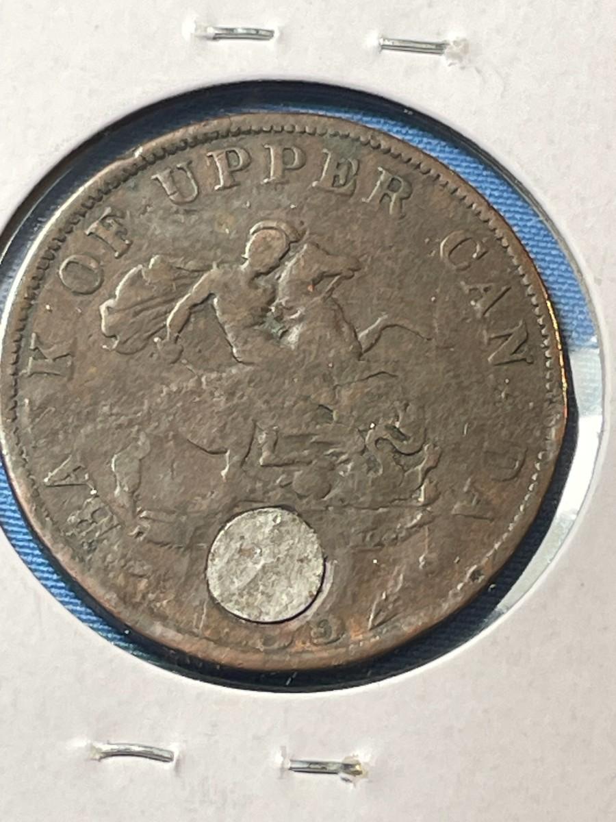 BANK OF UPPER CANADA 1852 COUNTERSTAMPED & PLUGGED HALF PENNY TOKEN AS PICTURED.
