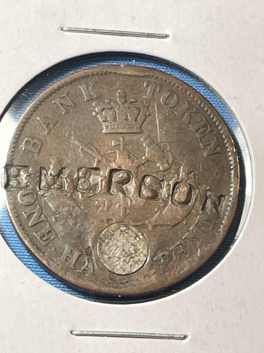 BANK OF UPPER CANADA 1852 COUNTERSTAMPED & PLUGGED HALF PENNY TOKEN AS PICTURED. $5 DOMESTIC SHIPPING.