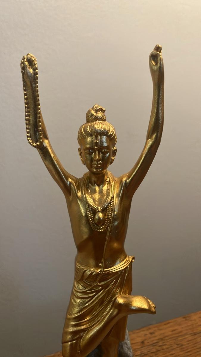 This beautiful 6-inch (statue) / 8-inch total height gold-finished metal murti captures Bhagwan Swaminarayan as Nilkanth Varni in his famous tapas pose (one leg raised, arms up) – exact replica style of the iconic 49-ft Tapomurti at Robbinsville Akshardham, NJ.
