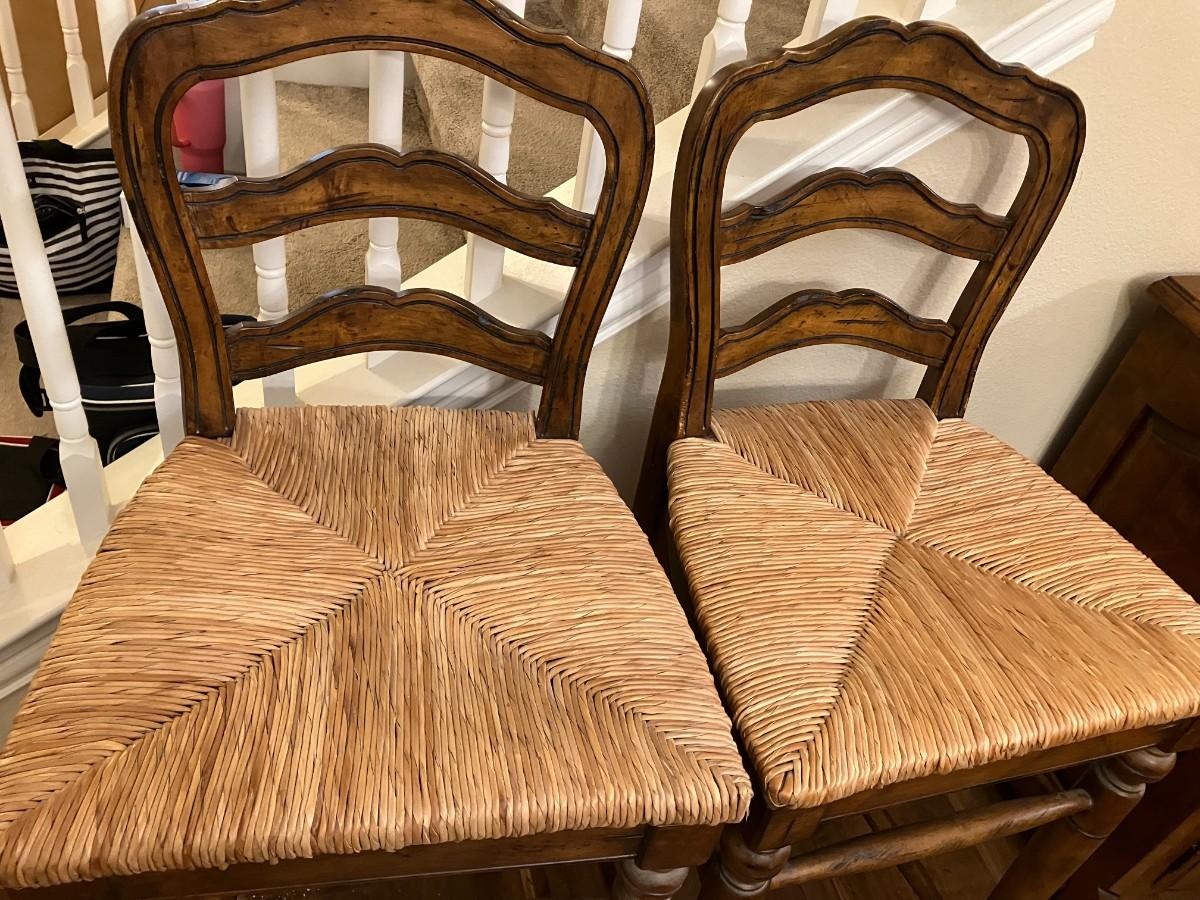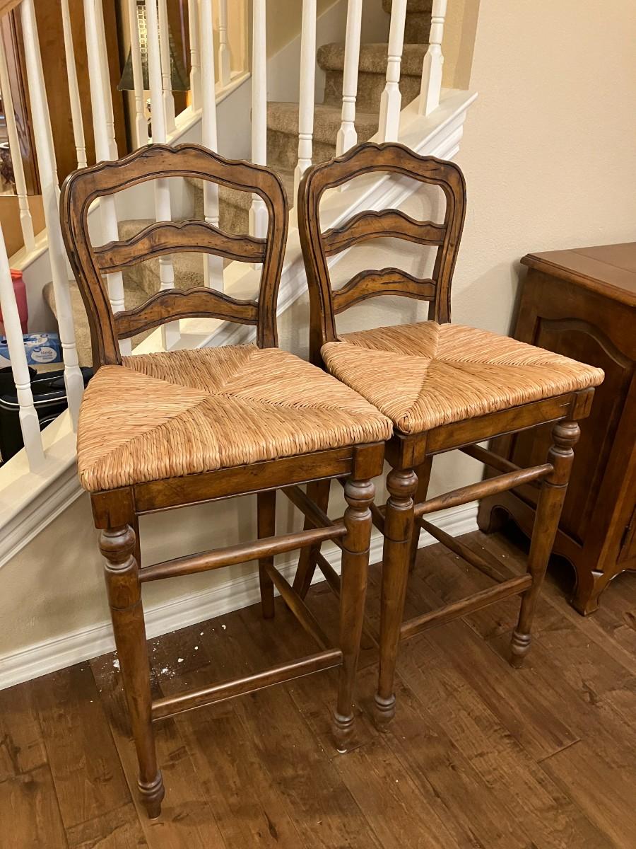 2 wooden bar chairs with ratan seats. Excellent condition. 44' H x 19" W x 17" D, chair seat is 31" from floor. Price is for the set of 2 chairs.
