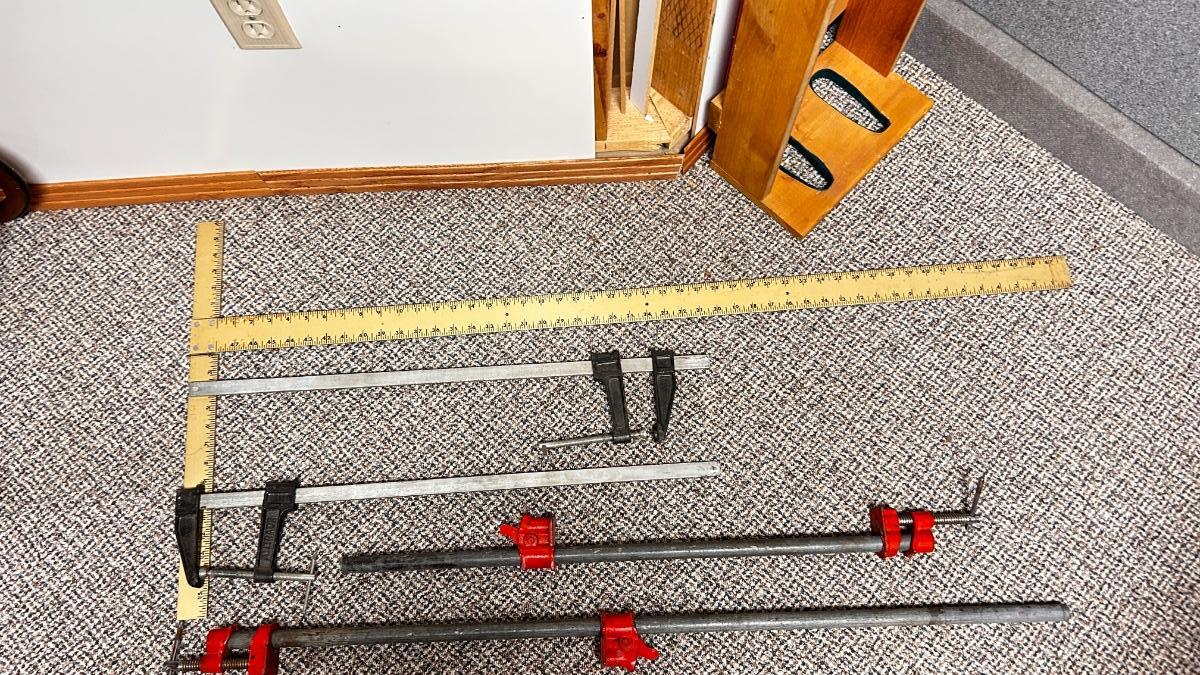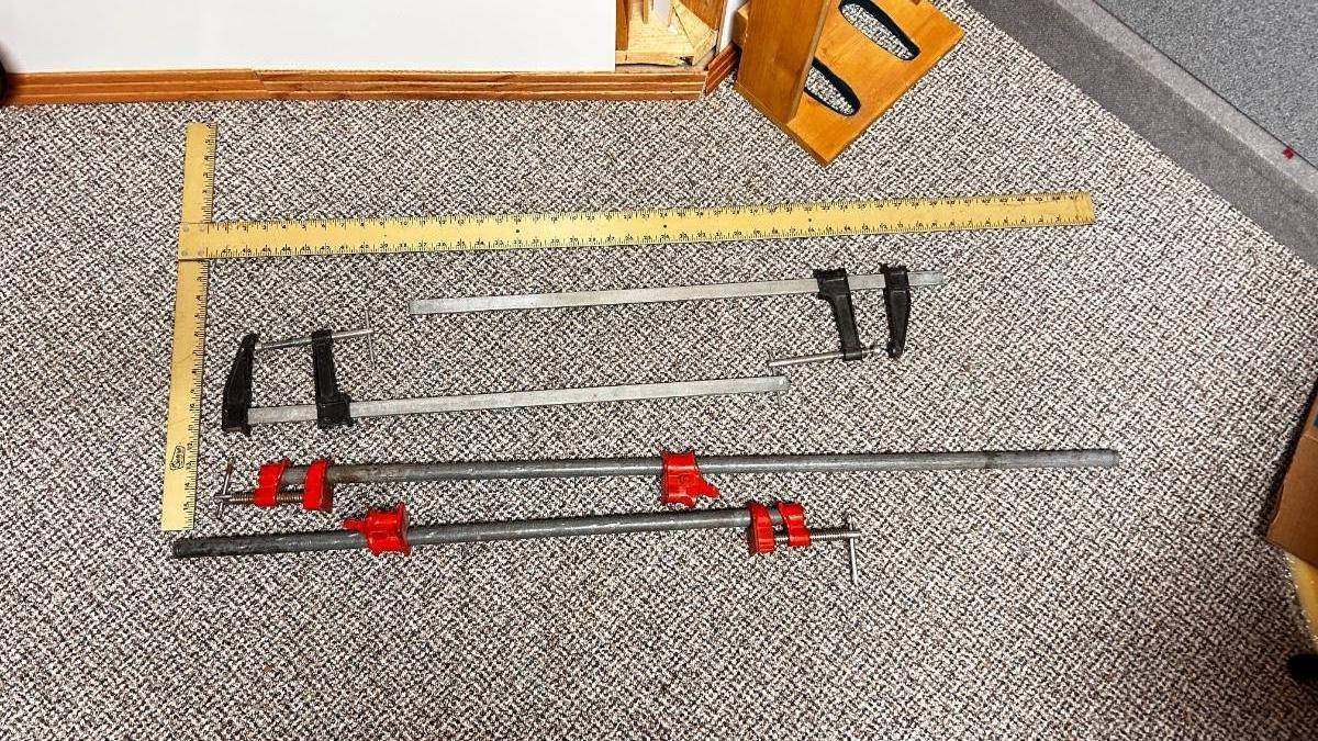 BAR CLAMPS, DRYWALL SQUARE & 32” WOOD WORKING CLAMPS
