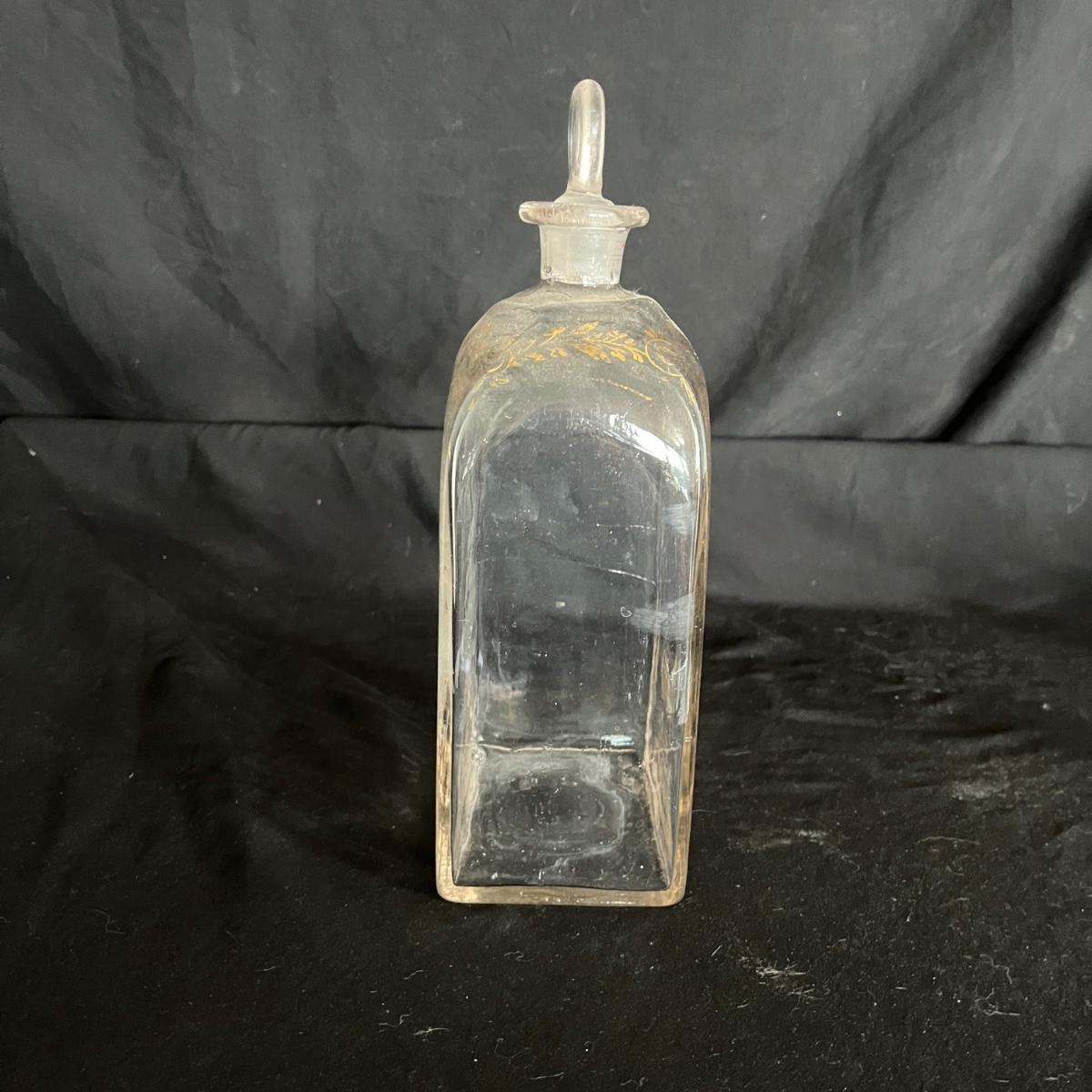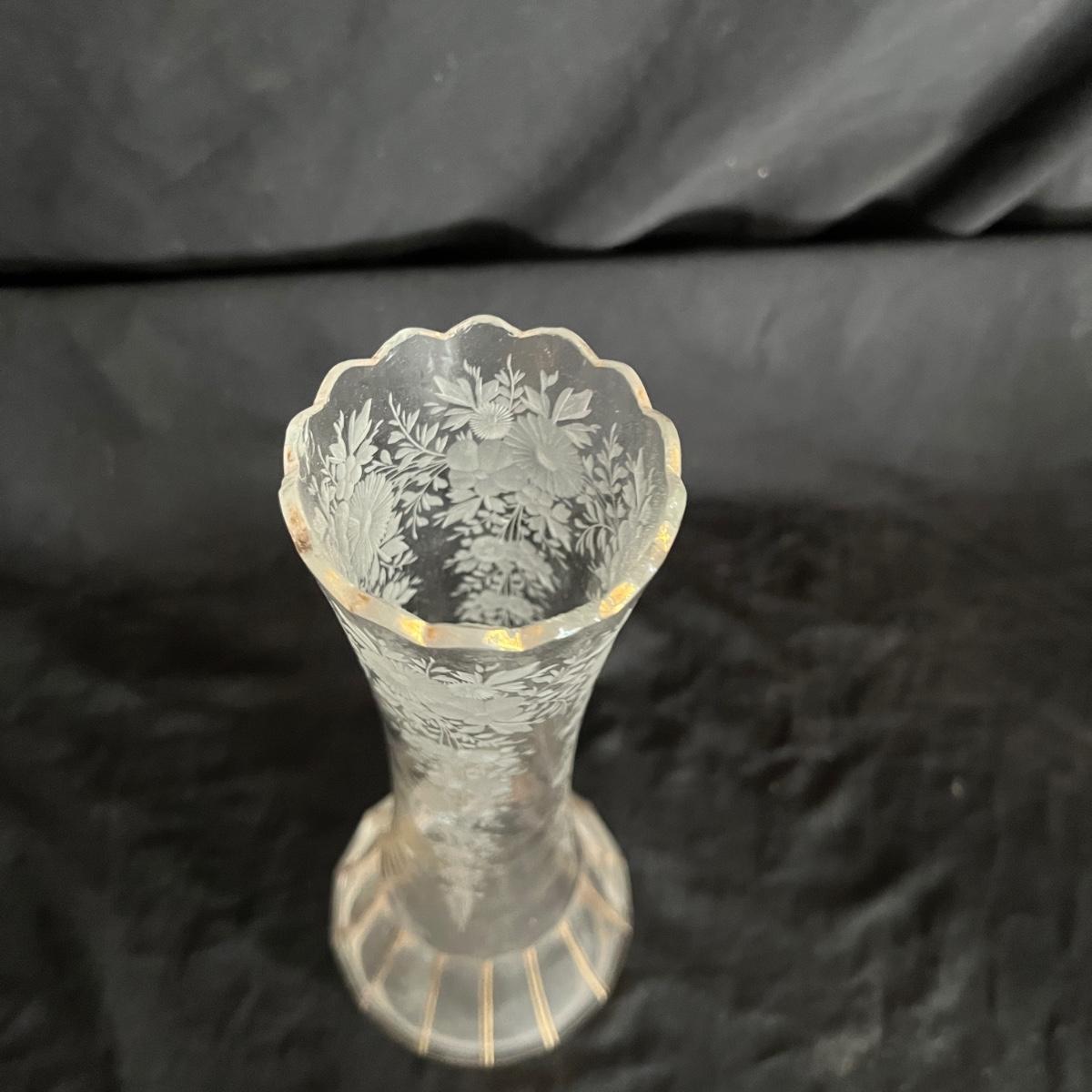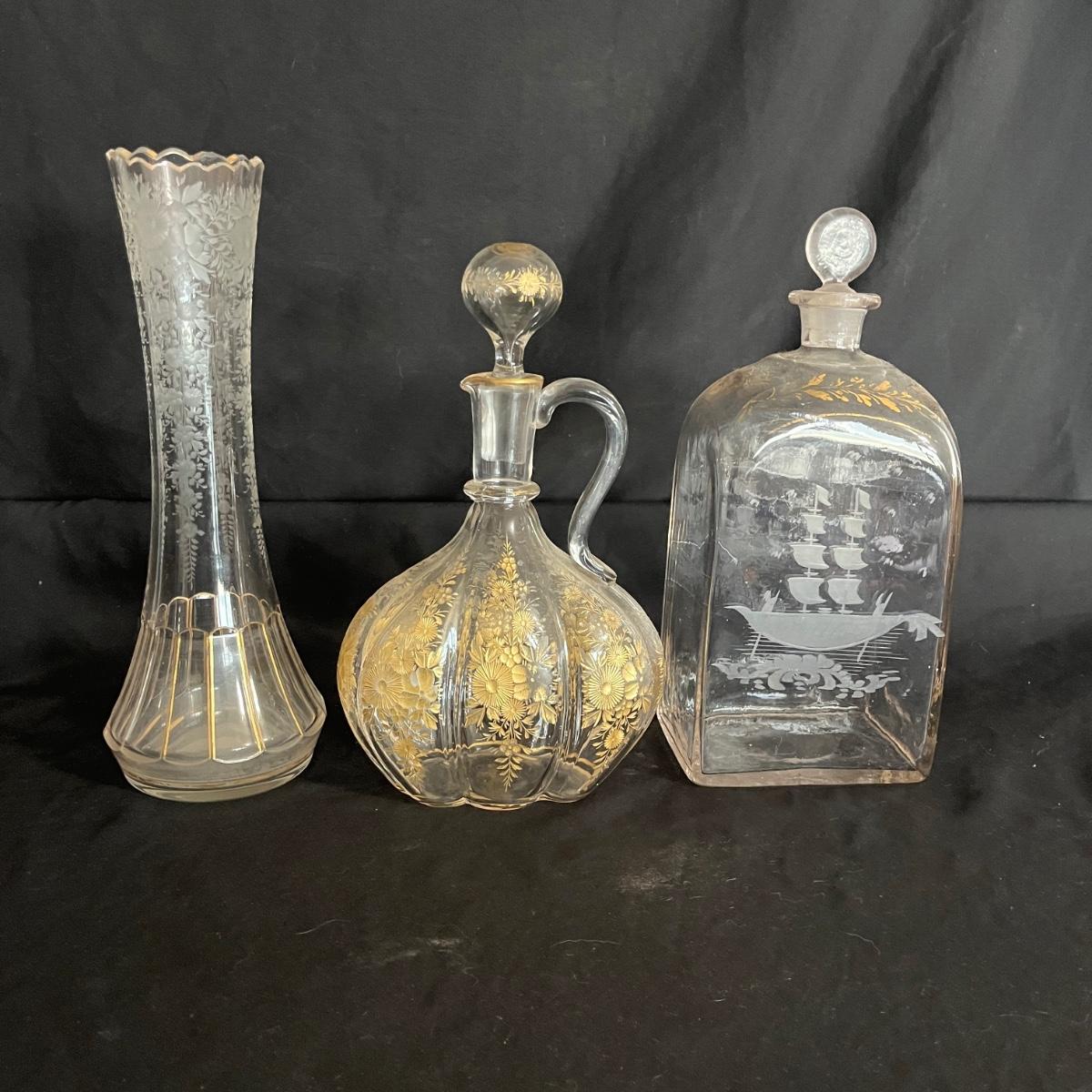 Three gold accented glass pieces. The alcohol containers with glass stoppers measure approximately 5” x 3” x 10”H. The floral etched vase measures 2.5”D x 11”H.